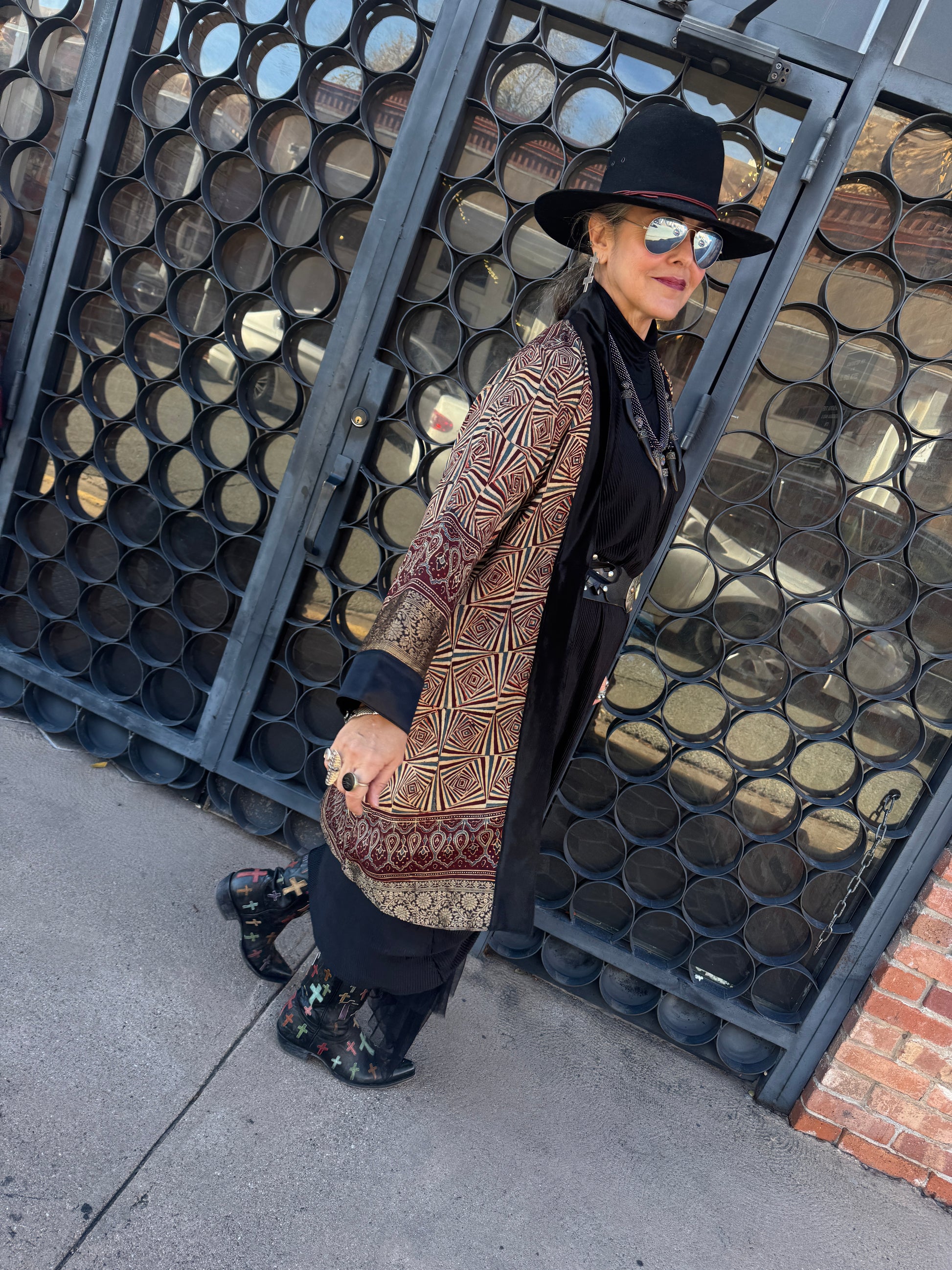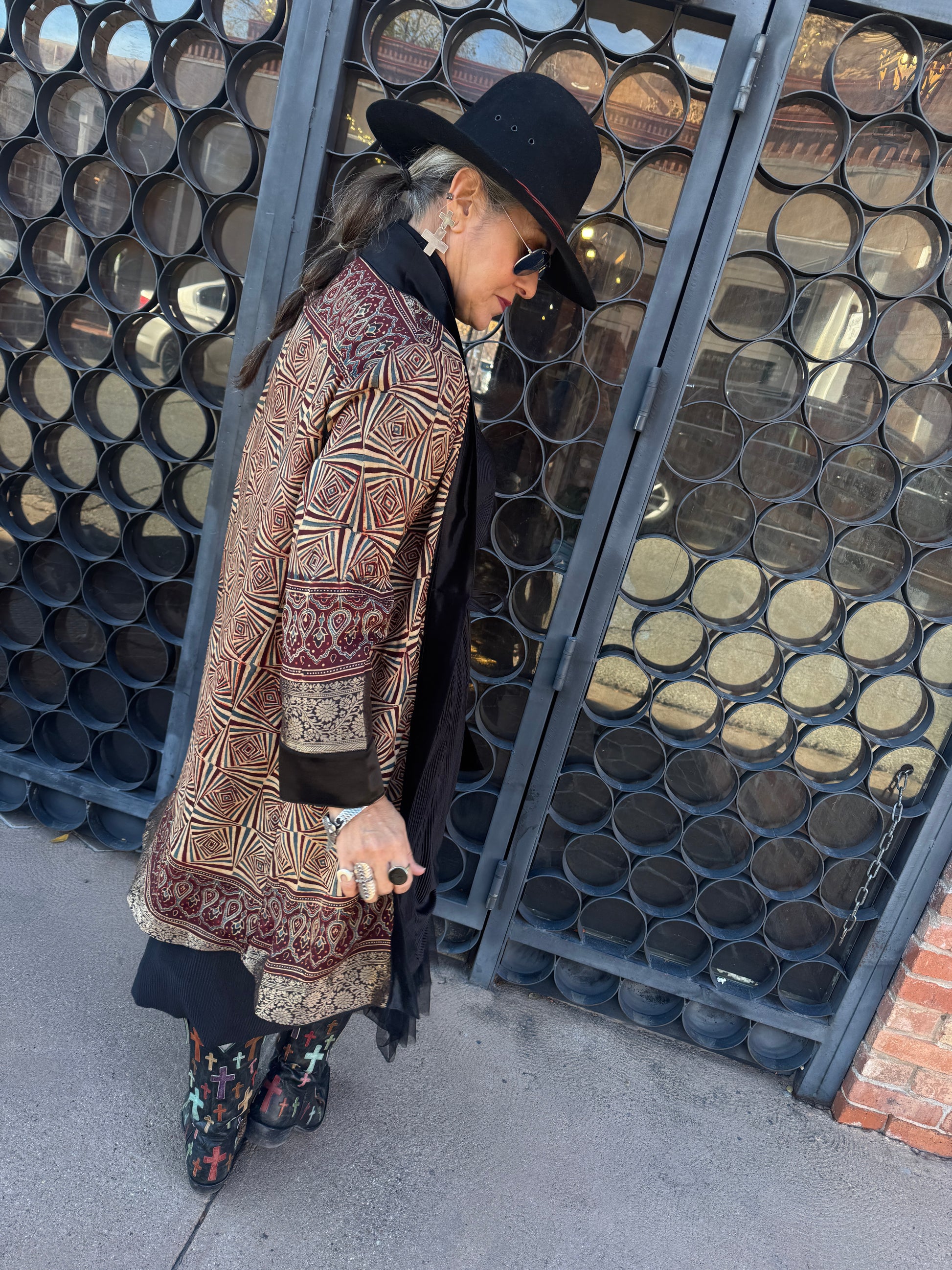 The natural dyes of this geo rich Ajrakh matte silk are a testament to the glory of this exquisite textile. Ajrakh is a unique form of textile printing found mostly in Sindh, Pakistan and Kutch district, India. Ajrakh textiles have special designs and patterns, which have been taken to new heights in this artistic pattern. Traditionally, the colors used are red and blue, sublimely illustrated in this gorgeous piece. The rich oxblood red and dove blue are subdued and blended due to the hand-block print and natural dyes, which also sets this apart and gives this unusual matte finish. The geometric infinity box print gives a nod to the prints of M.C. Esher. The more traditional organic geometric floral print is beautifully incorporated in the same deep red and dove blue at the shoulder, sleeve and hem. If all the Ajrakh beauty wasn't enough, the fabulous gold metallic brocade takes this coat into another dimension. This beautiful brocade bling is found at the cuff and hem. Elegant and slimming black silk lapel and cuff ends. Fully lined in black georgette. Two sizes to choose from below with the dimensions. Norma is wearing the size M/L.