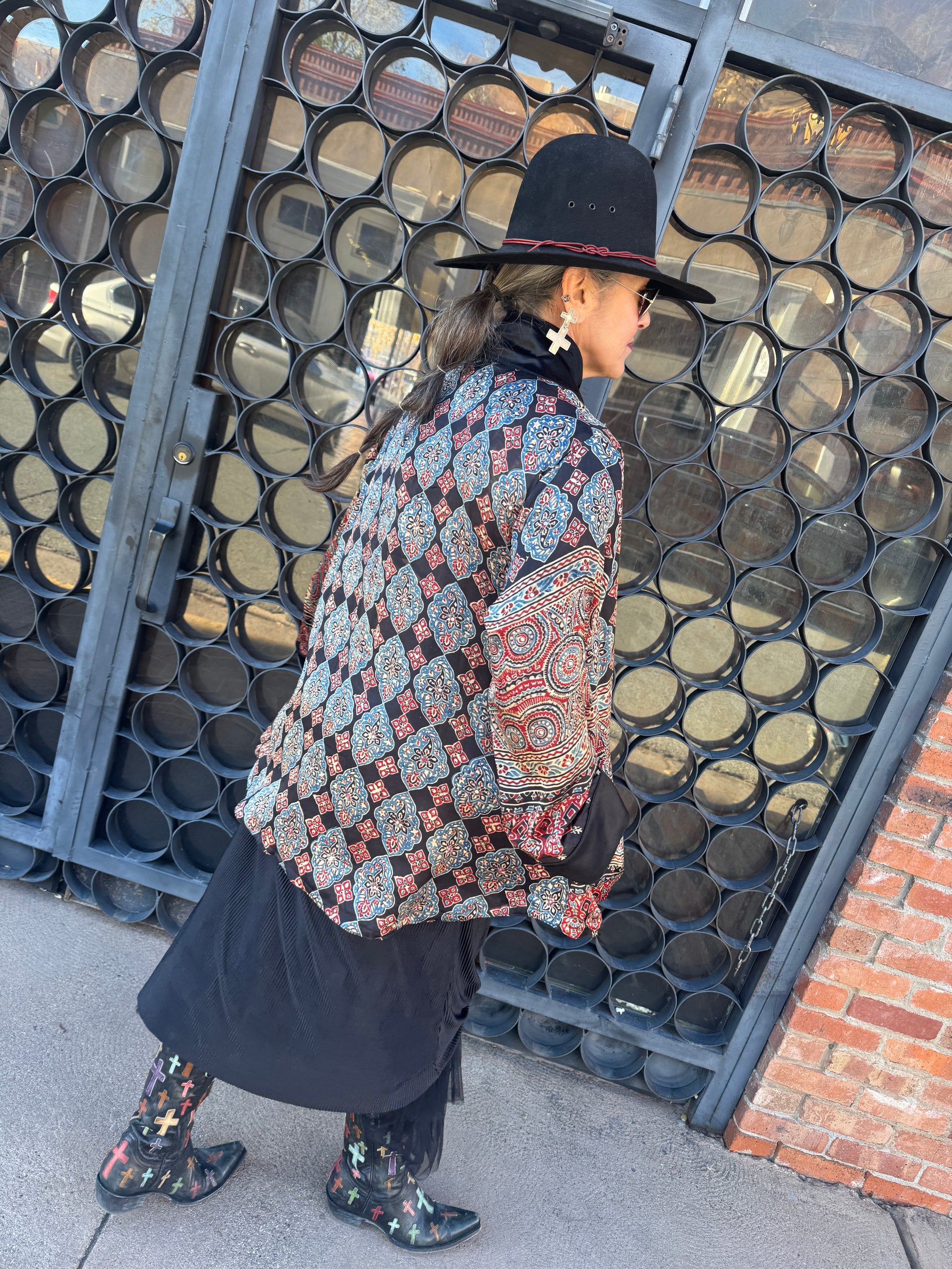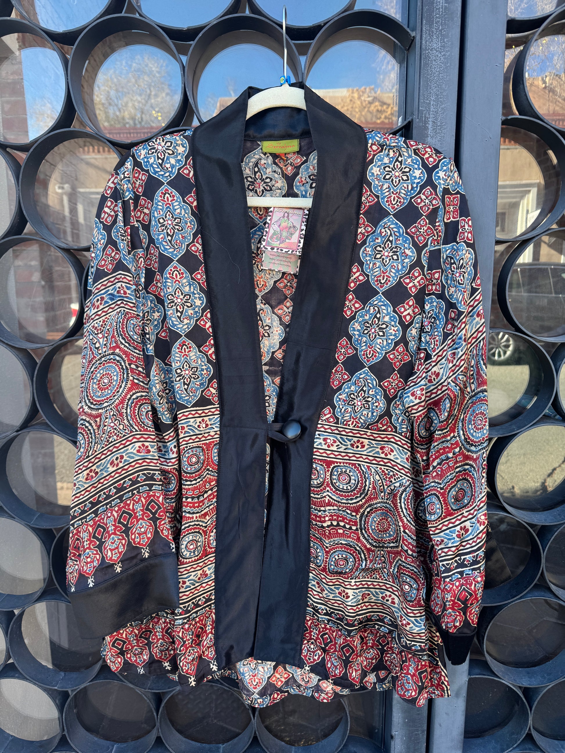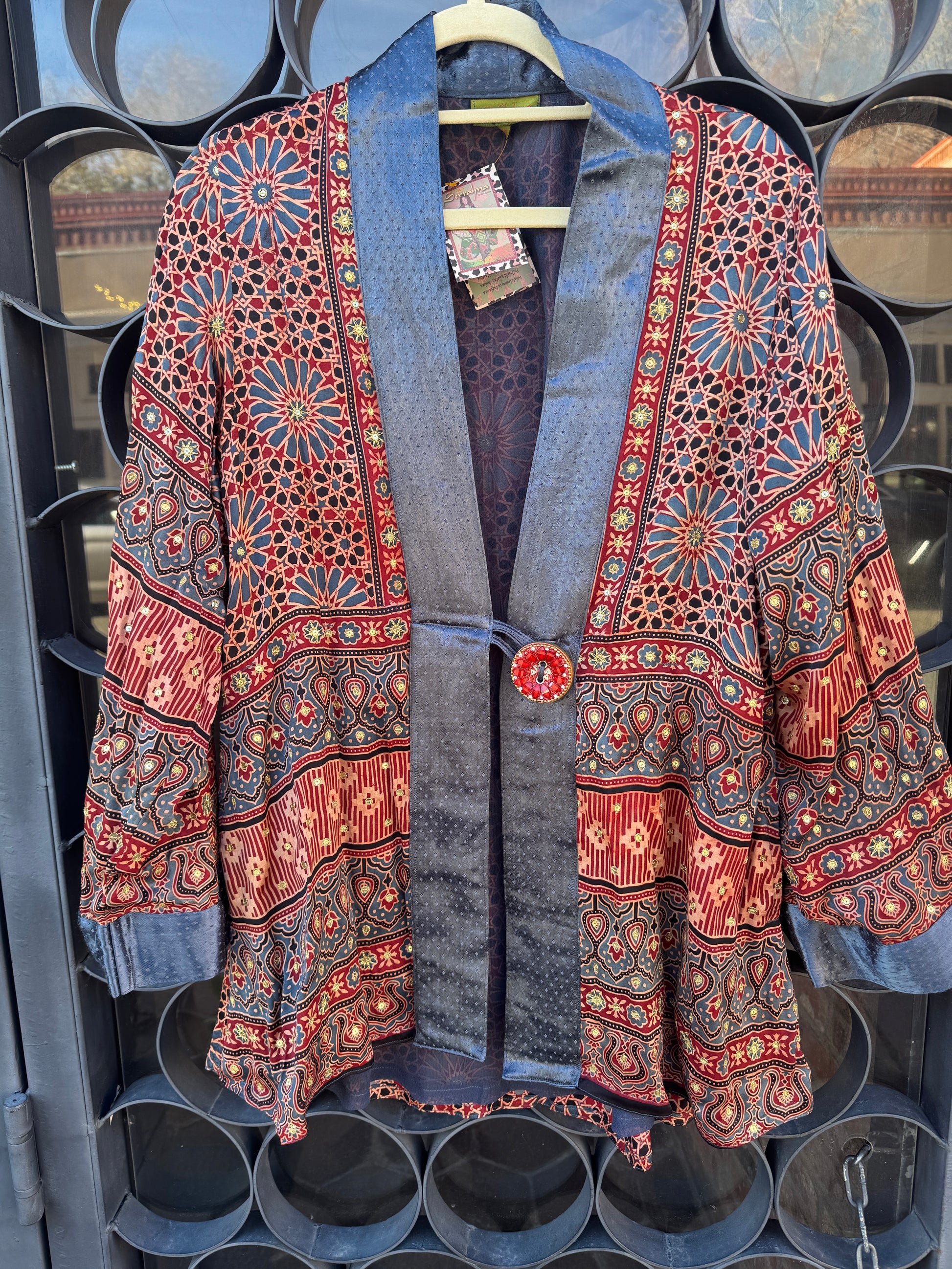 Magnificent modal silk hand-printed with natural dyes in classic the class Ajrakh tradition of red and blue geometric floral motifs, only these beauties have and embroidered mirror- work. Ajrakh is a unique form of textile printing found mostly in Sindh, Pakistan and Kutch district, India. The feel of this silk modal is pure lux. Elegant black silk is found on the lapel and cuffs of the blue and red Ajrakh jackets. The size S/M has a gorgeous old gold metallic weave at the hem and cuff. The other M/L size jacket has a beautiful dove blue silk lapel with an embroidered, textured diamond design all over, which is also found on the cuff. The gorgeous natural dyes, in the same classic Ajrakh red and blue, are found in the print but the hand embroidered mirror-work is done in gold metallic thread, as well as golden sequins sewn throughout the medallions. Each of these jackets are silk modal Ajrakh abundance at its finest! In a favorite Serrahna swing jacket cut. Elevated classic! Two side vent pockets. Single button closure. Choose your size and color below in the variants.