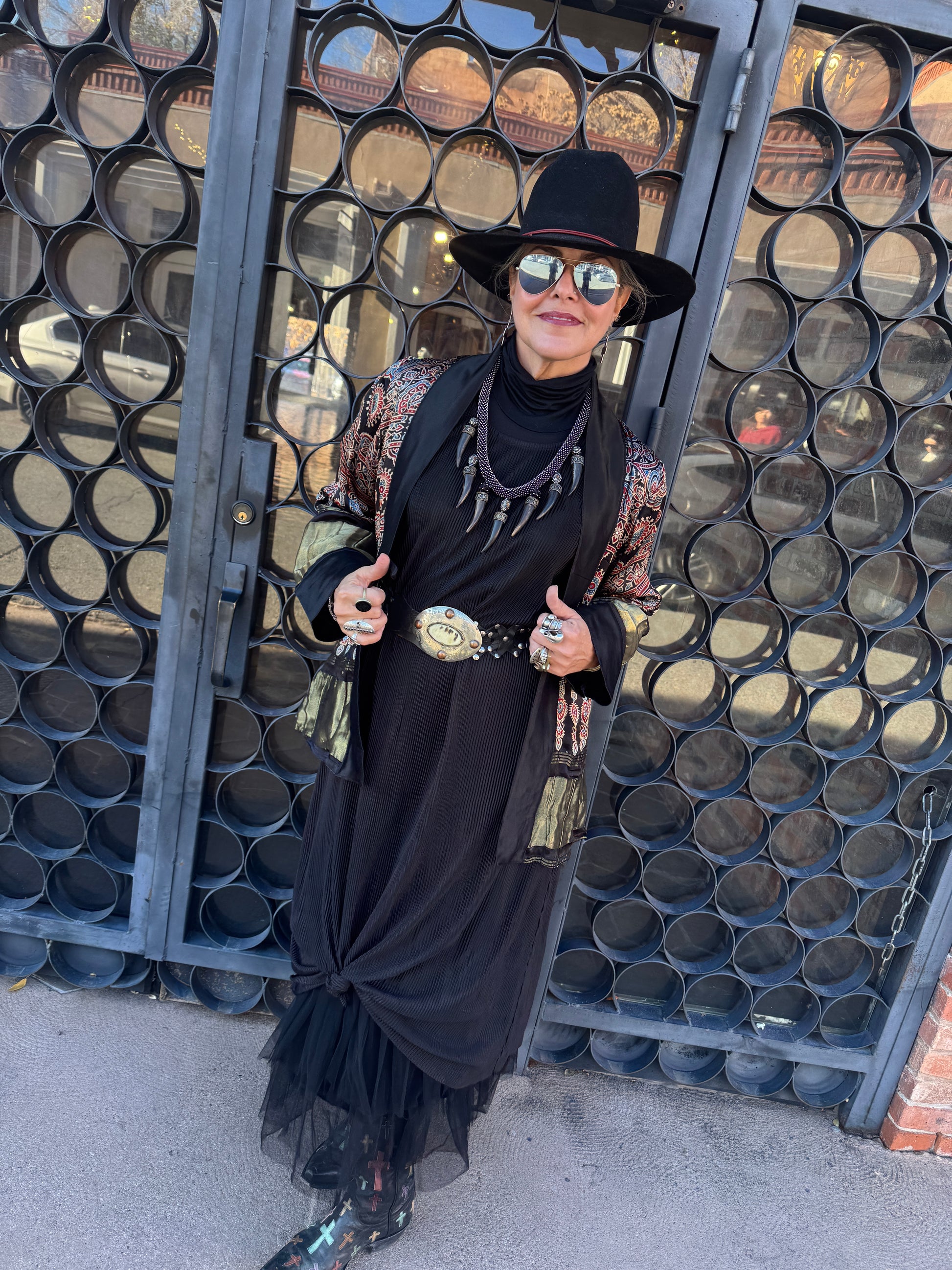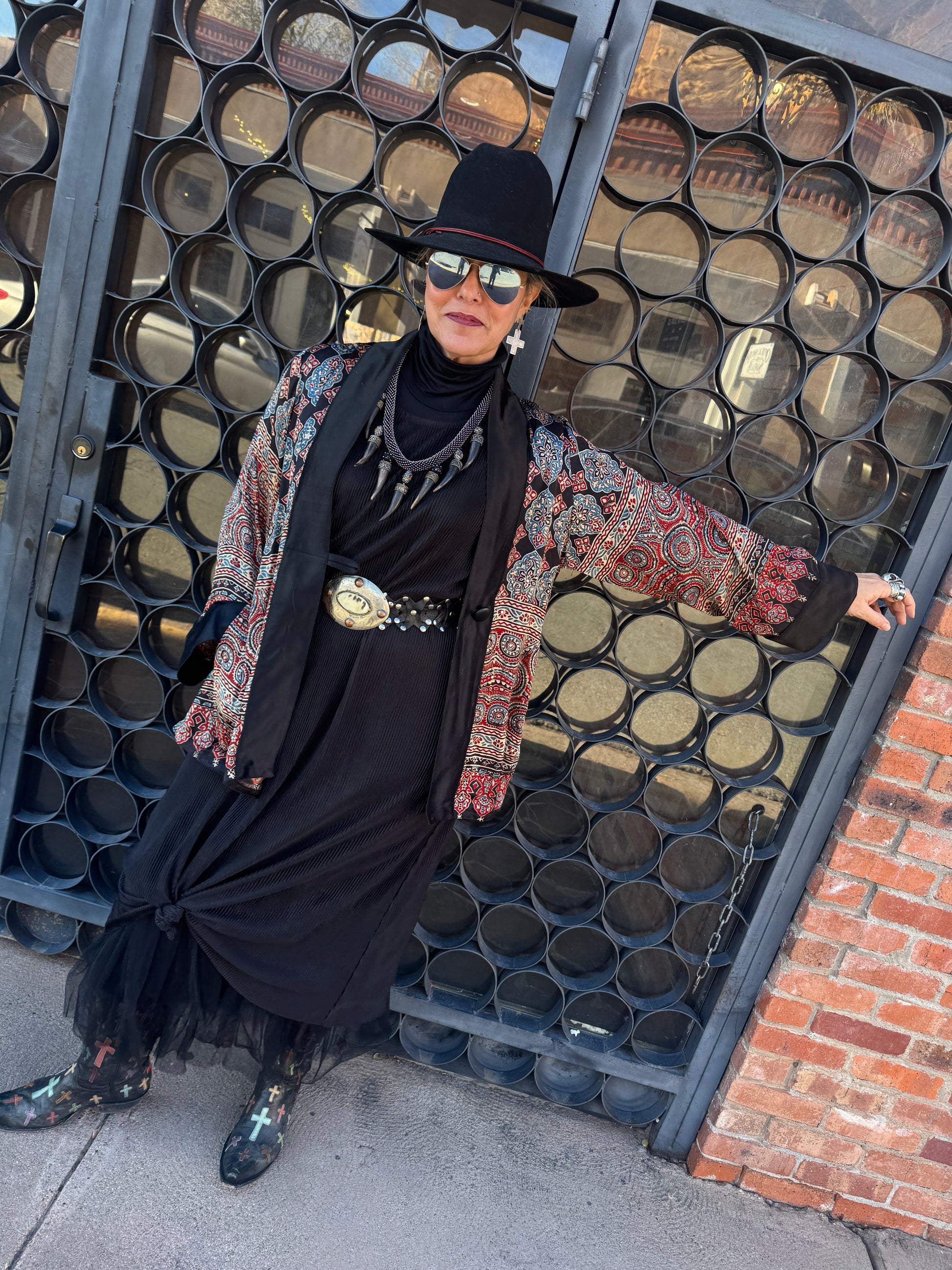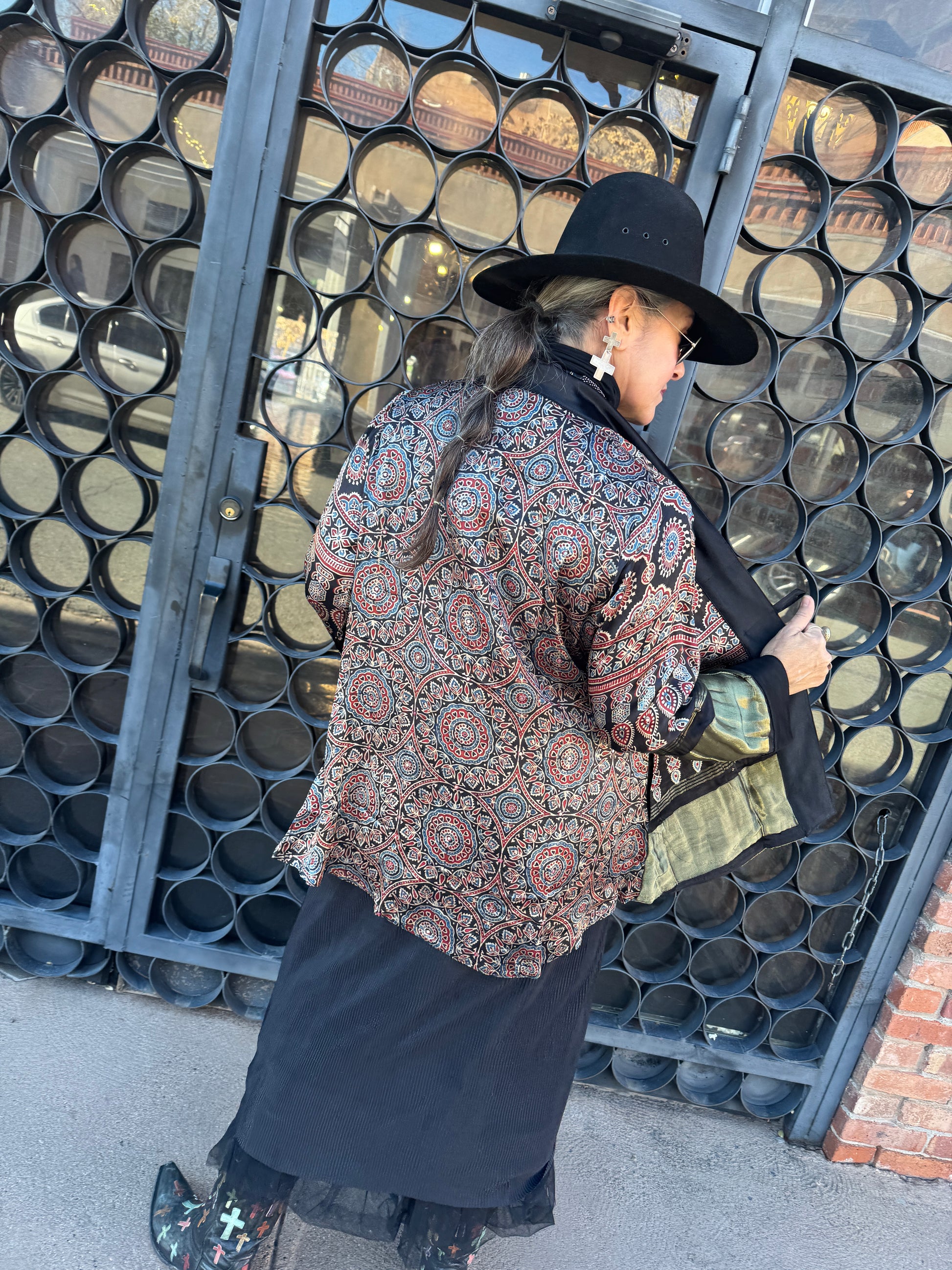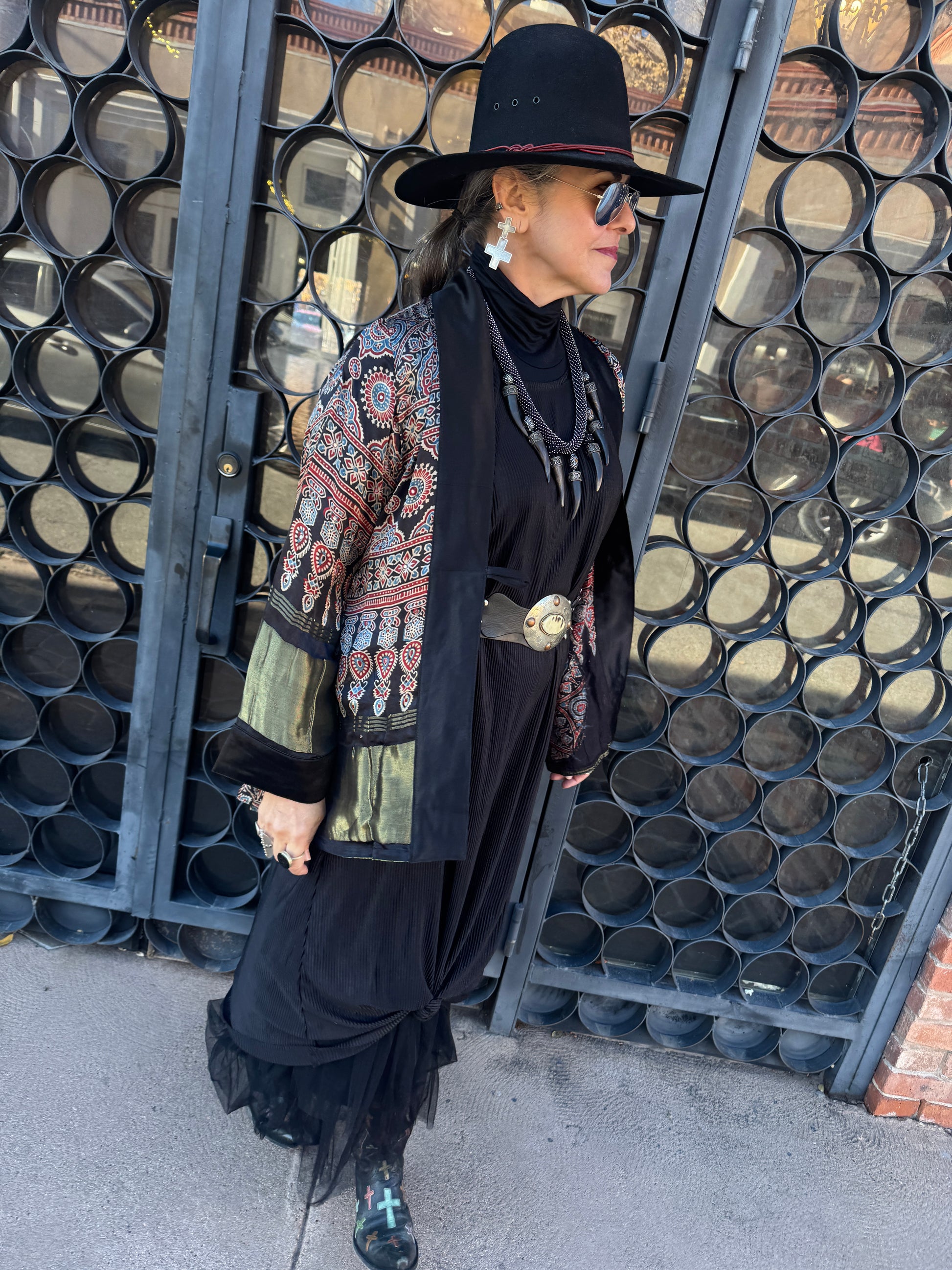Magnificent modal silk hand-printed with natural dyes in classic the class Ajrakh tradition of red and blue geometric floral motifs, only these beauties have and embroidered mirror- work. Ajrakh is a unique form of textile printing found mostly in Sindh, Pakistan and Kutch district, India. The feel of this silk modal is pure lux. Elegant black silk is found on the lapel and cuffs of the blue and red Ajrakh jackets. The size S/M has a gorgeous old gold metallic weave at the hem and cuff. The other M/L size jacket has a beautiful dove blue silk lapel with an embroidered, textured diamond design all over, which is also found on the cuff. The gorgeous natural dyes, in the same classic Ajrakh red and blue, are found in the print but the hand embroidered mirror-work is done in gold metallic thread, as well as golden sequins sewn throughout the medallions. Each of these jackets are silk modal Ajrakh abundance at its finest! In a favorite Serrahna swing jacket cut. Elevated classic! Two side vent pockets. Single button closure. Choose your size and color below in the variants.