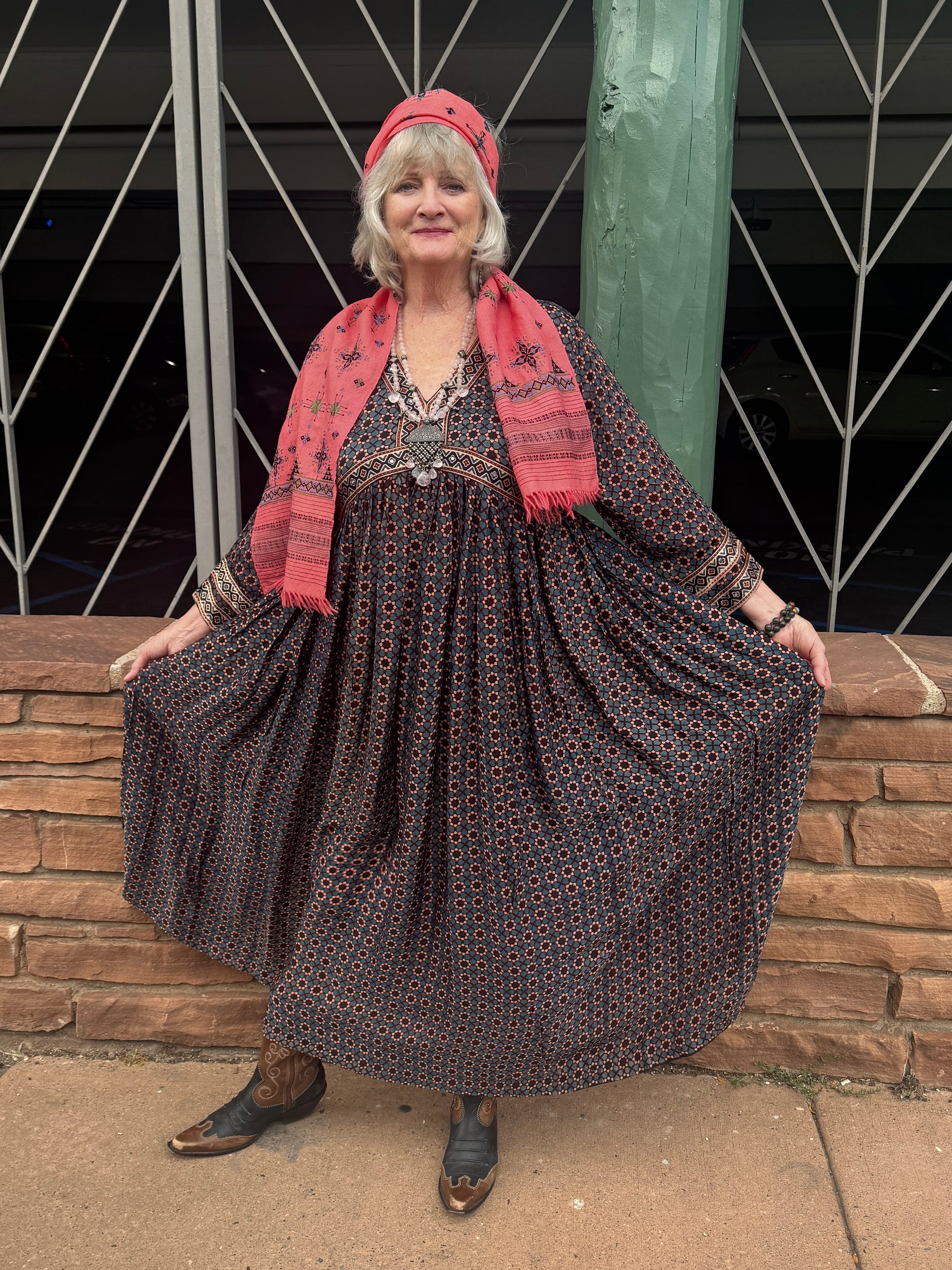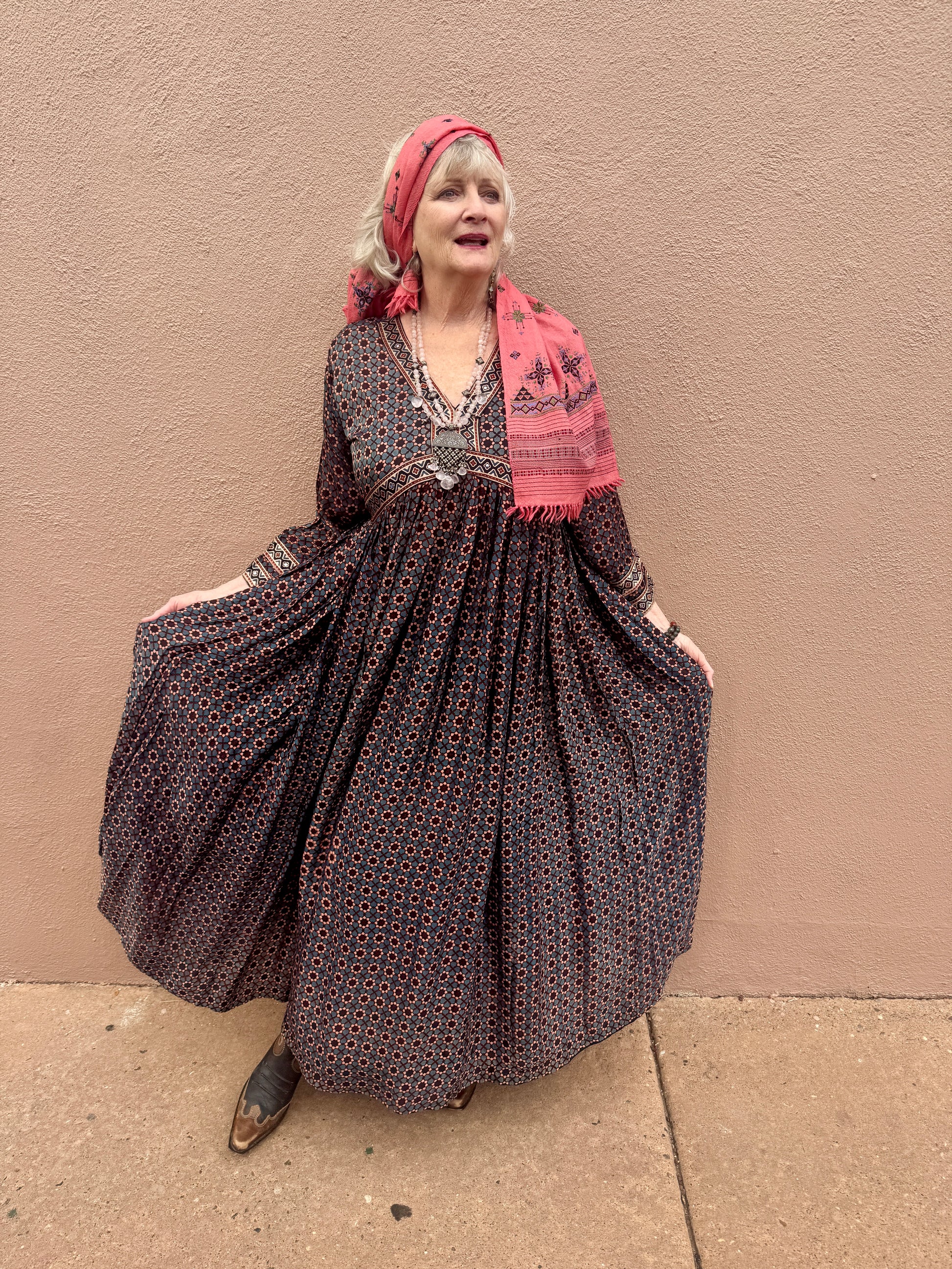 Flowing and feminine, this AJRAKH hand printed dress in sumptuous, modal, silk fall, and drapes like a dream. The colors are soft and sensual perfect for a cool summer palette in shades of violet slate blue-gray, wine brown and soft, coral pink. Perfect colors for a cool summer essence palette. Fall asleep with an empire waist. Floor length size 42 inch chest. OOAK