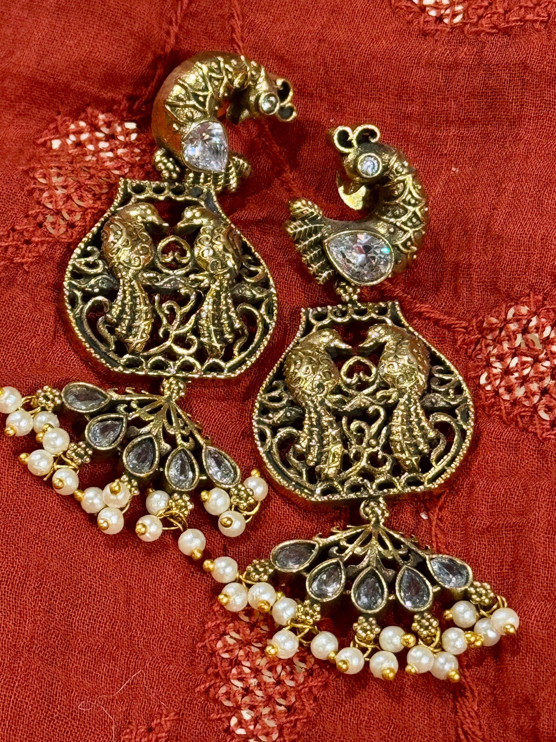 4.) 2” total drop. 1.25” ruby-studded crystal peacock fan topper with pearl dangle jhumka;