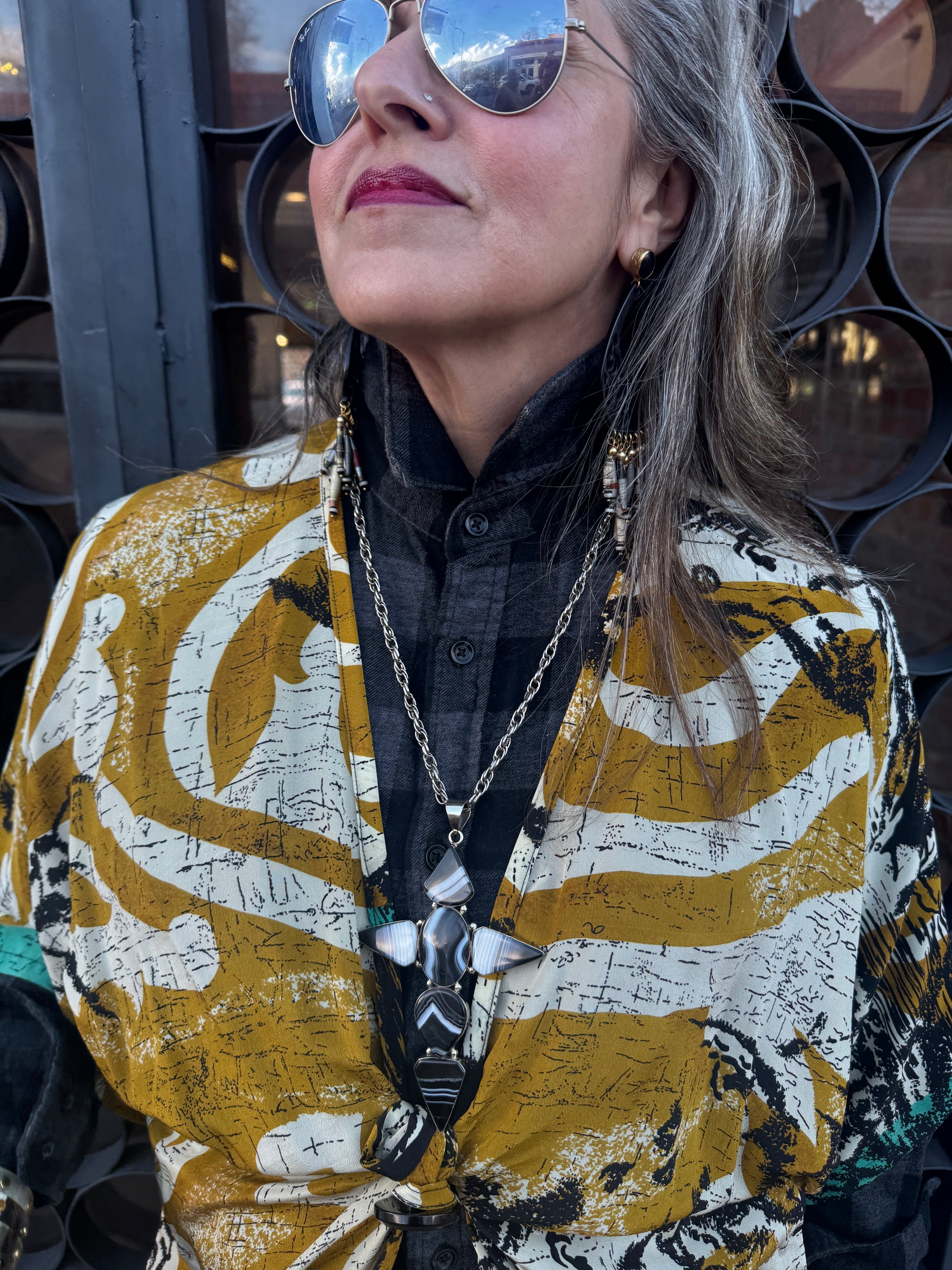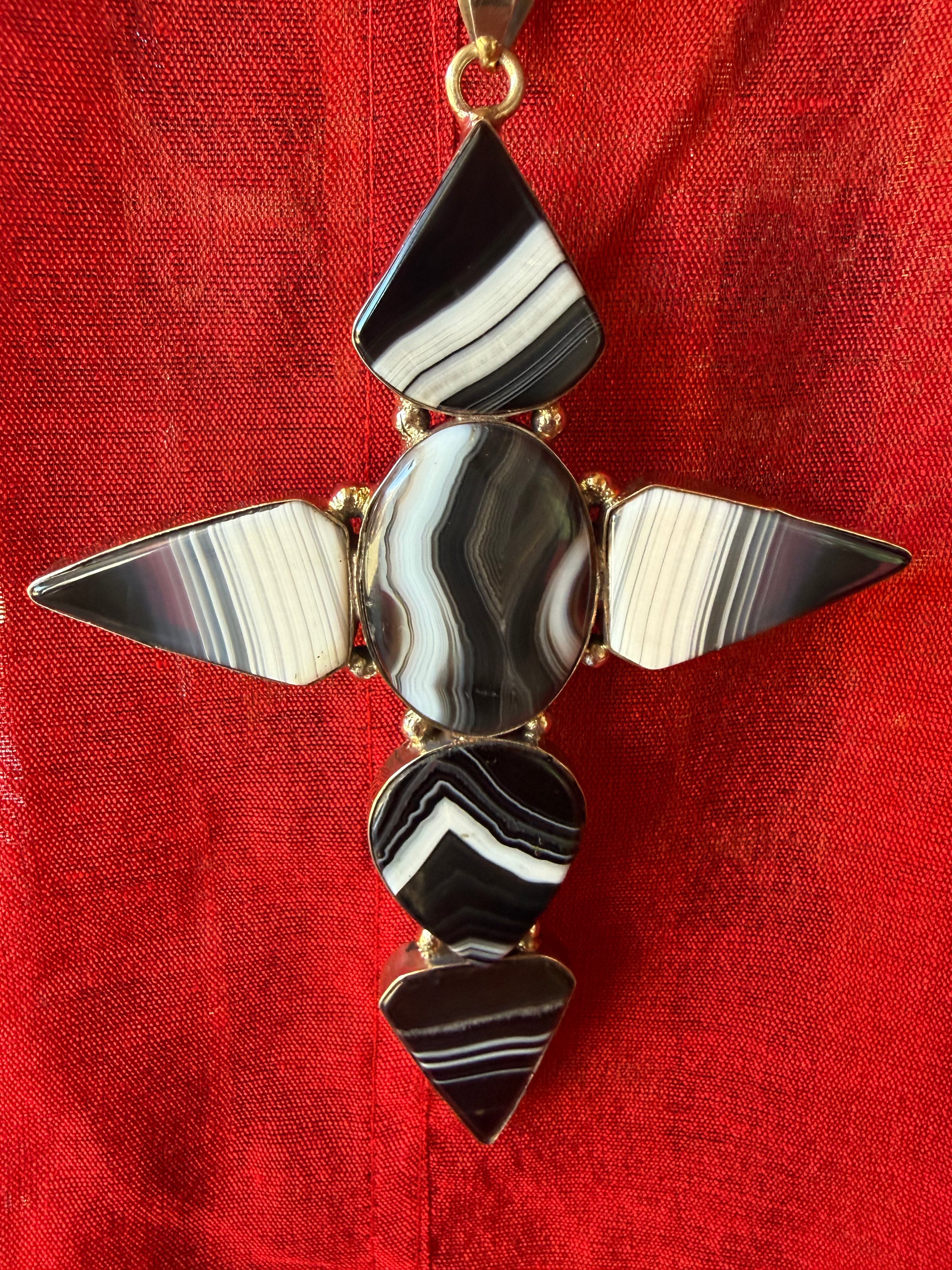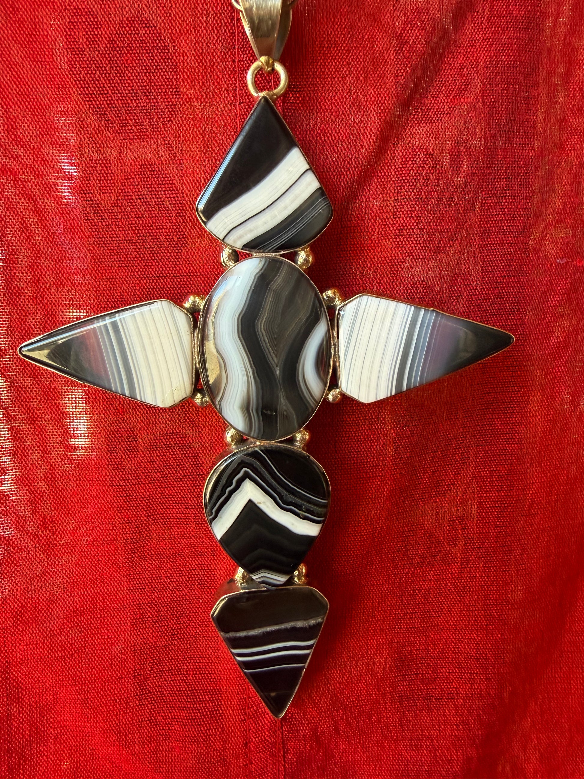 Stunning black banded agate oval and diamond cabochons formed into a 5” cross. The bold black and white striations naturally formed are a patterned variety of chalcedony. This banded agate is known for its grounding properties that can help absorb and deflect negative energies. The striking black and white is believed to harmonize yin and yang energies, and said to bring balance, stability and emotional equilibrium. 22” simple white bronze link chain, with a total drop of 27”.