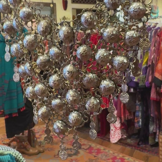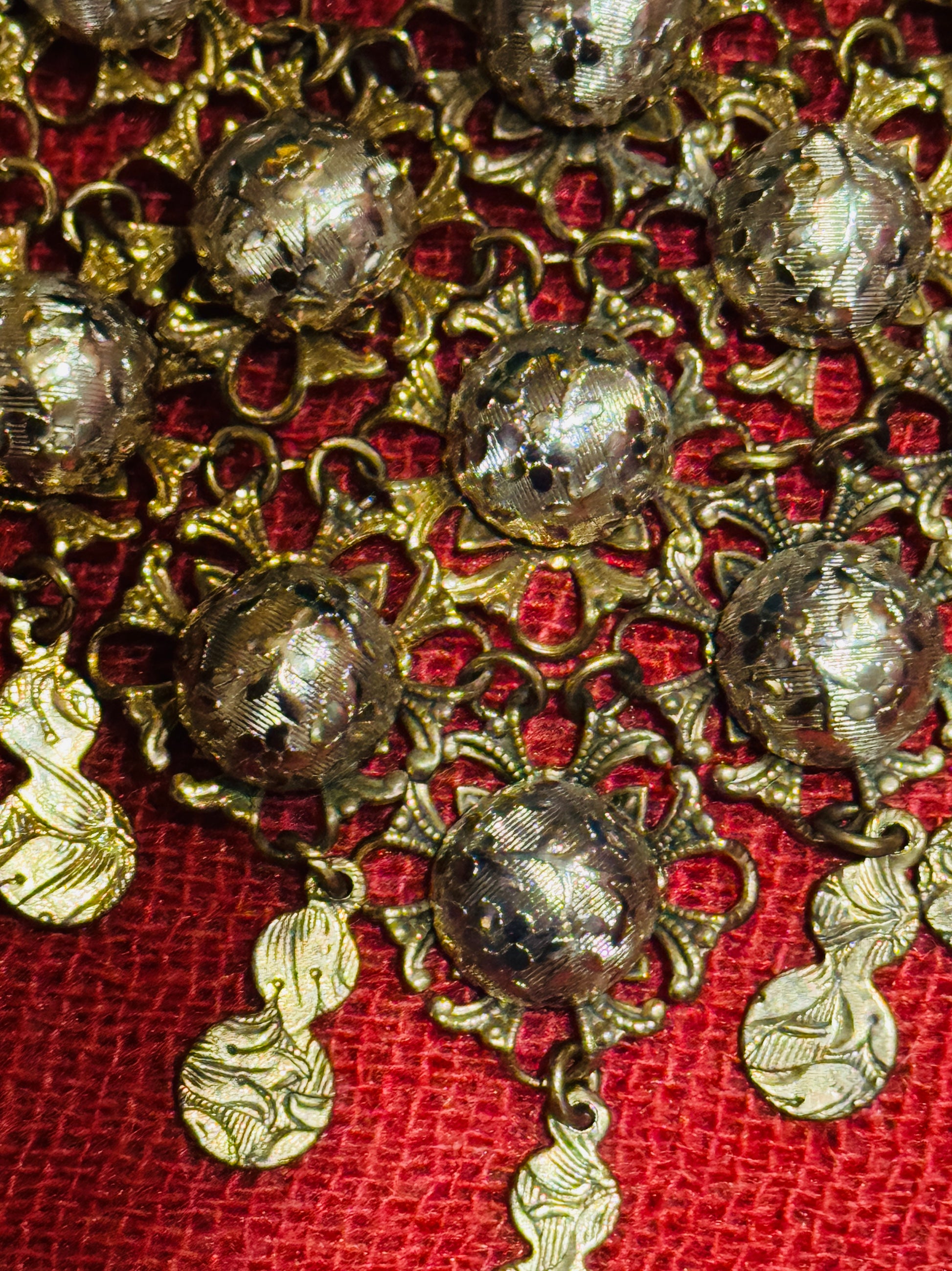 This reversible mixed metal bib would be a Byzantine princess’s dream! The lightweight chainmail drip necklace falls a few inches below the choker neckline. The front facing facade glistens with intricate silver detailing while the backside features bronze cut out flowers - equally as intricate. It is lightly textured with tiny engraving on both sides of the domes. Harness your powerful femininity in this armor- like statement piece!