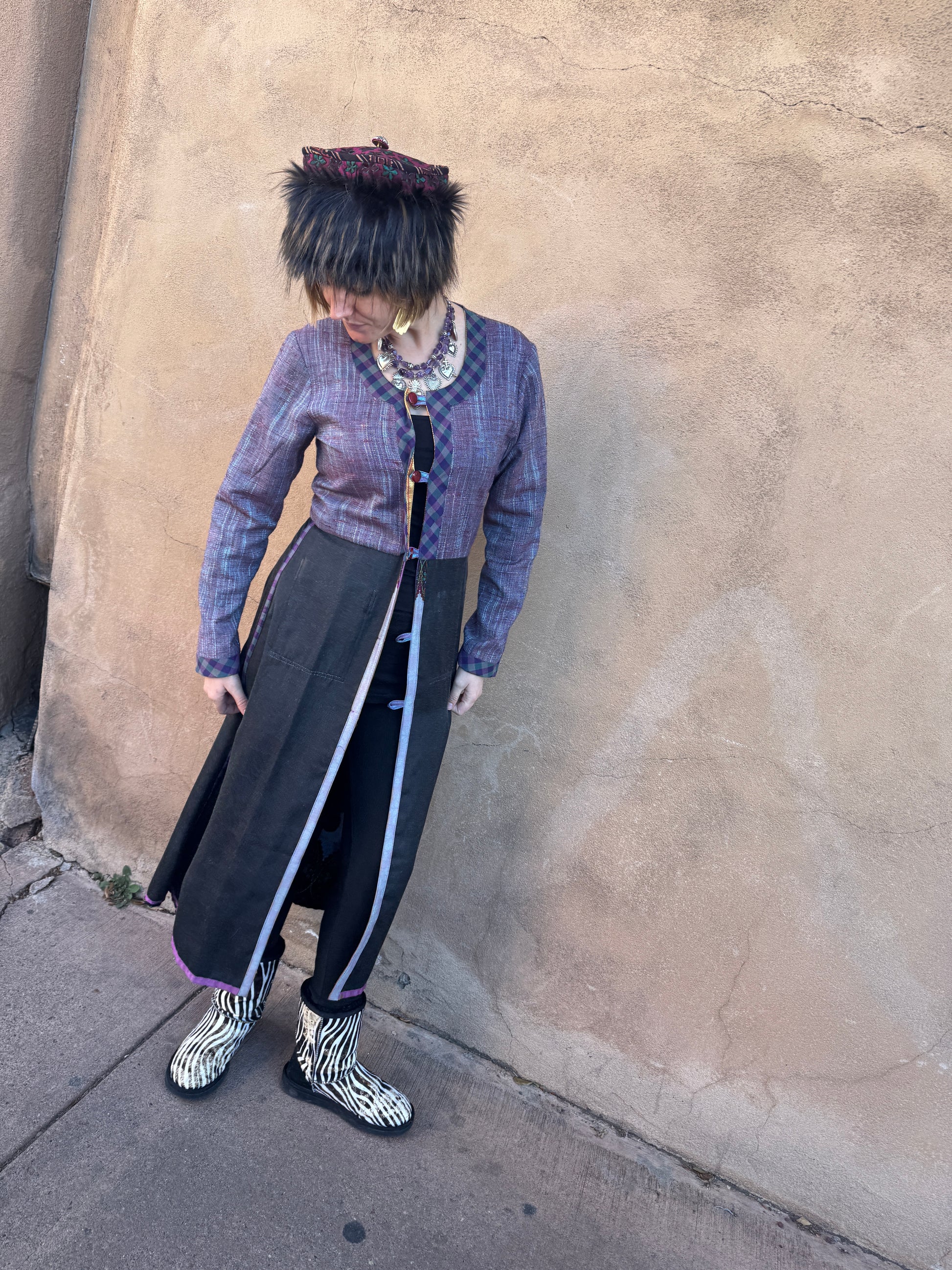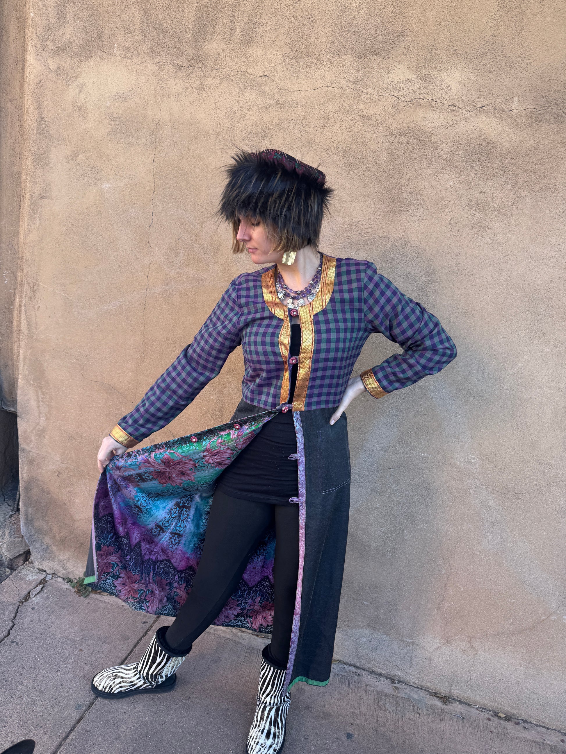 Impressionista Fashionista! This sumptuous watercolor print coat has a rayon blend skirt that flows and drapes so beautifully. Add a silk hand-loomed tweed body and mercerized cotton plaid trim in like-minded colors and you have a masterpiece. There are 2 sizes available: XS36" chest & Small38" chest measurement. The reverse side is a bit more conservative, with a grey rayon blend lower half, and either a handloomed silk or a purple/green/lavender cotton plaid on top. Front patch pockets are on the painterly side; grey side has stitching and tweed accents.