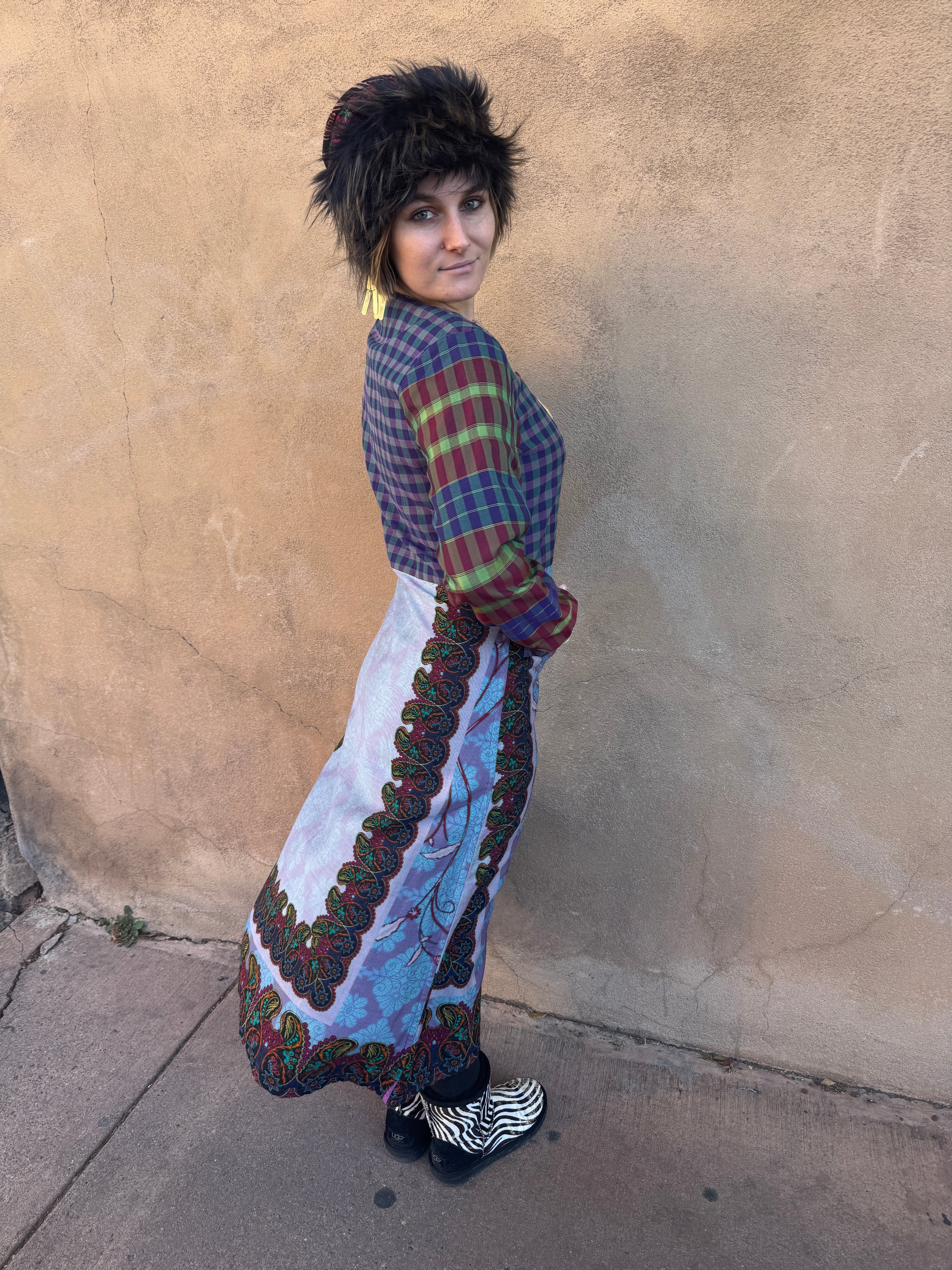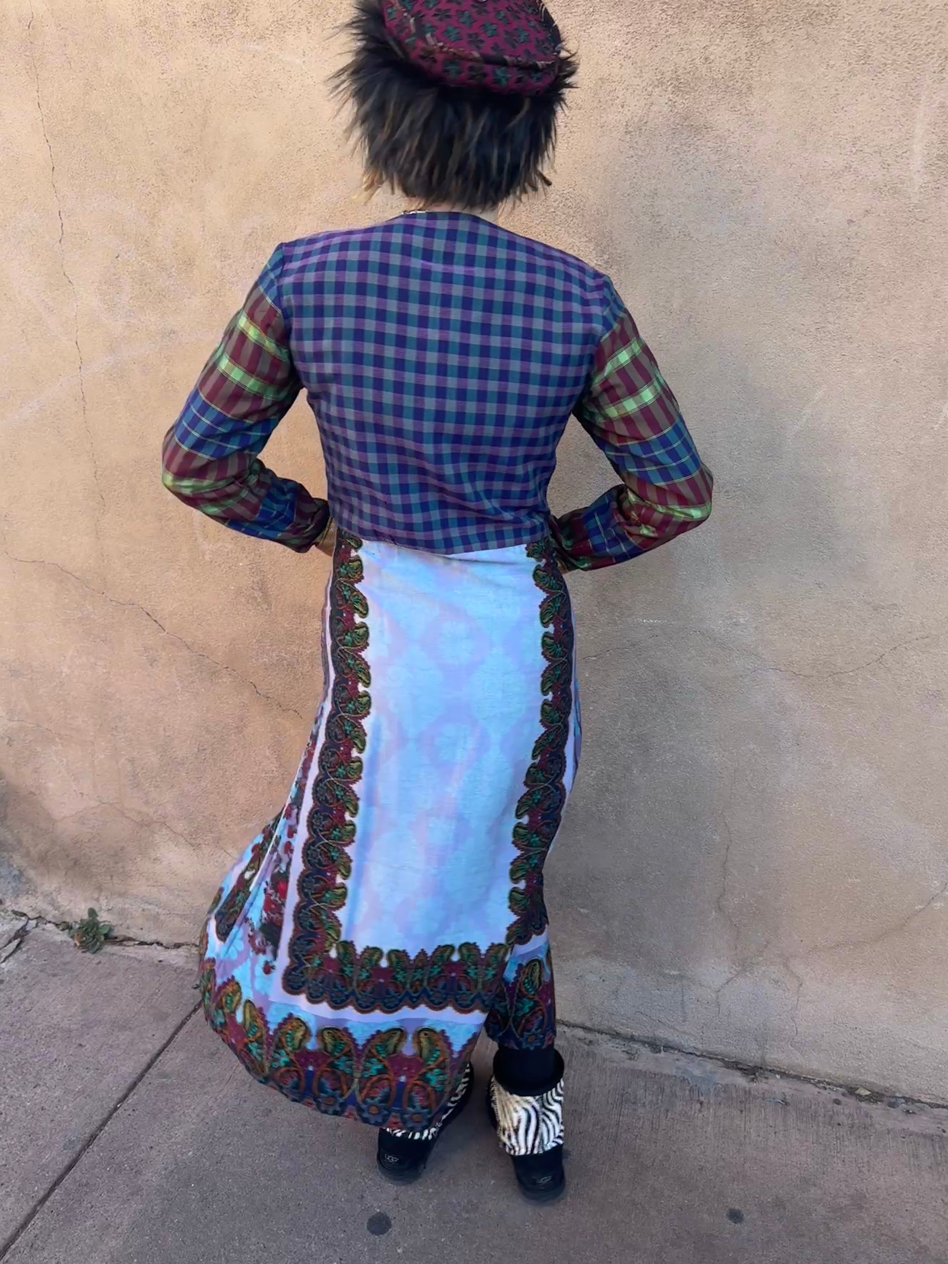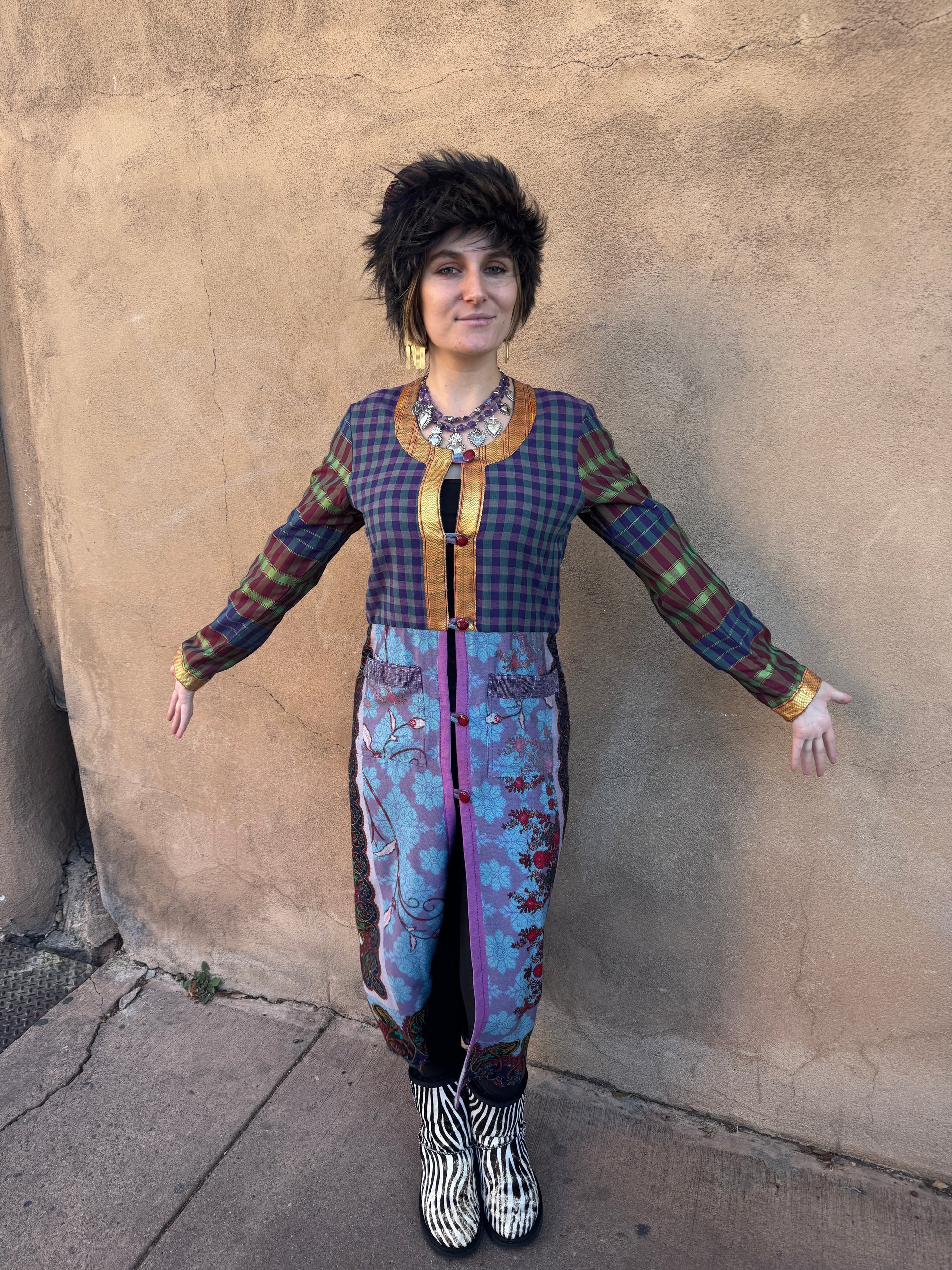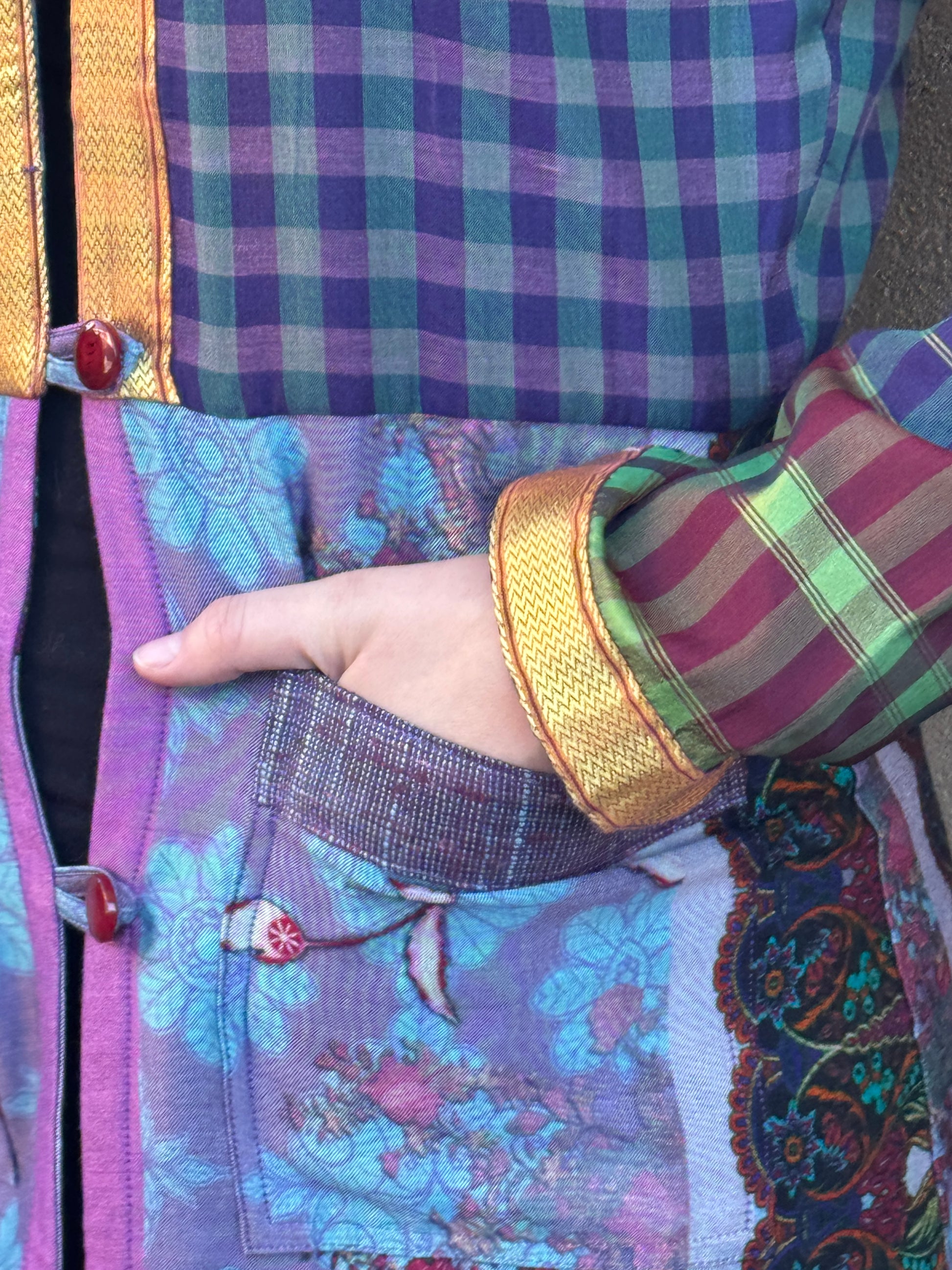 Andrea conceived of this upcycled coat in the spring of a recent trip to India. when she was in India. Long ago, she had made several silk cropped jackets. Those which did not sell were brought back to India and then upcycled them into this glorious masterpiece.
