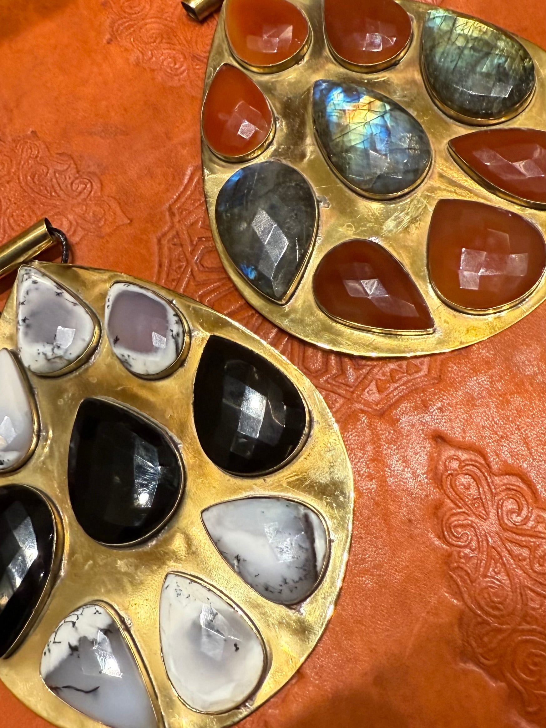 Gorgeous teardrop pendants with fabulously faceted gemstones galore. Choose from onyx & opal or labradorite & carnelian. The significant gemstones mirror the beautiful teardrop shape of the pendant. The light-reflecting faceted stones range from 1.5" to 1" long. Brass pendant and bezel. The gemstones have an open bezel on the back which allows the metaphysical goodness of the stones to reach your skin. The pendant measures 5.5" L x 4" W. Easy to switch from cord to necklace of your choice. Lightweight for such a huge statement!