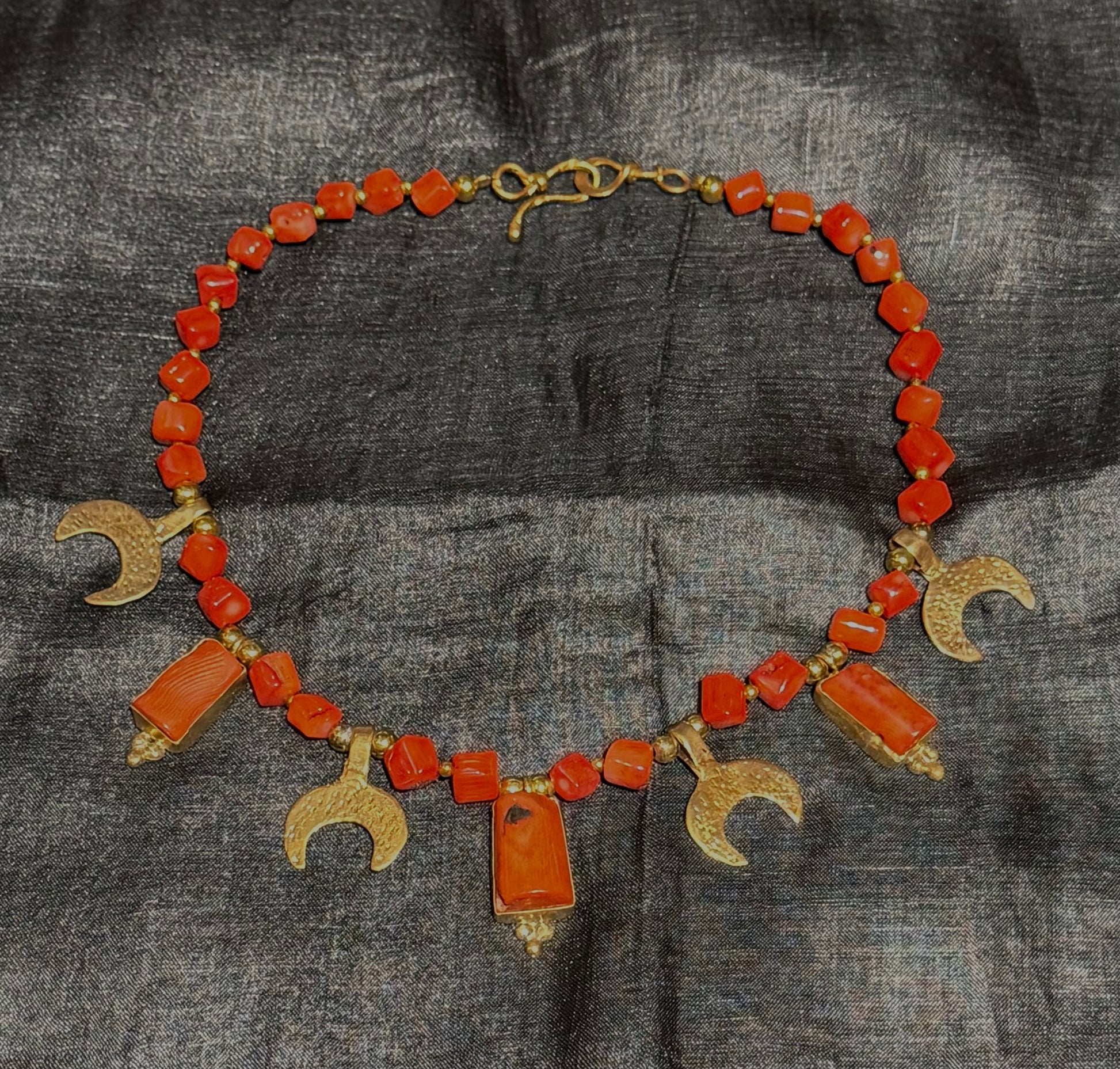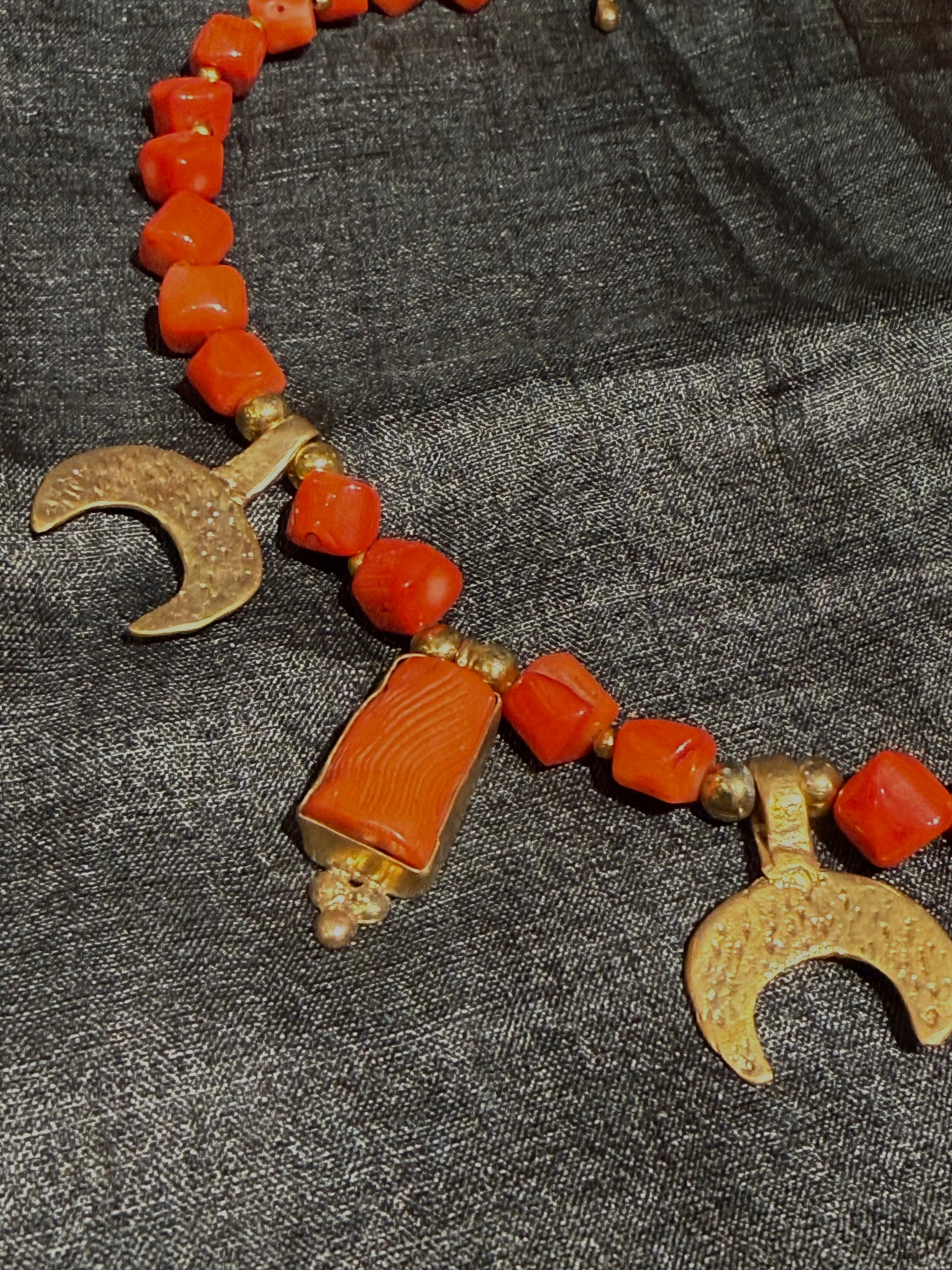 These stunning orange coral collar necklaces are both adorned with Turkish, gold-plated brass charms. Choose from celestial moons or the enchanting Roman coins. Both come with a unique, etched texture along with the square coral pieces that were hand cut on a bias. Between the charms and square coral, you will find 3 rectangular chunks of coral framed in brass. Each piece balances out the next. The color is bright but also has its natural variations of orange tomato red and pink peeking through, when observed closely.