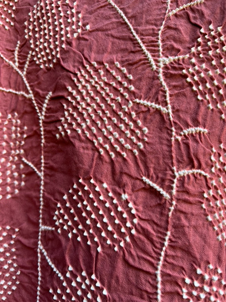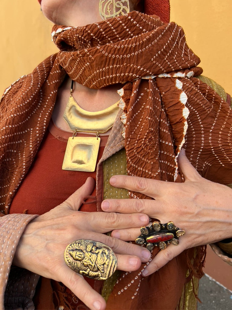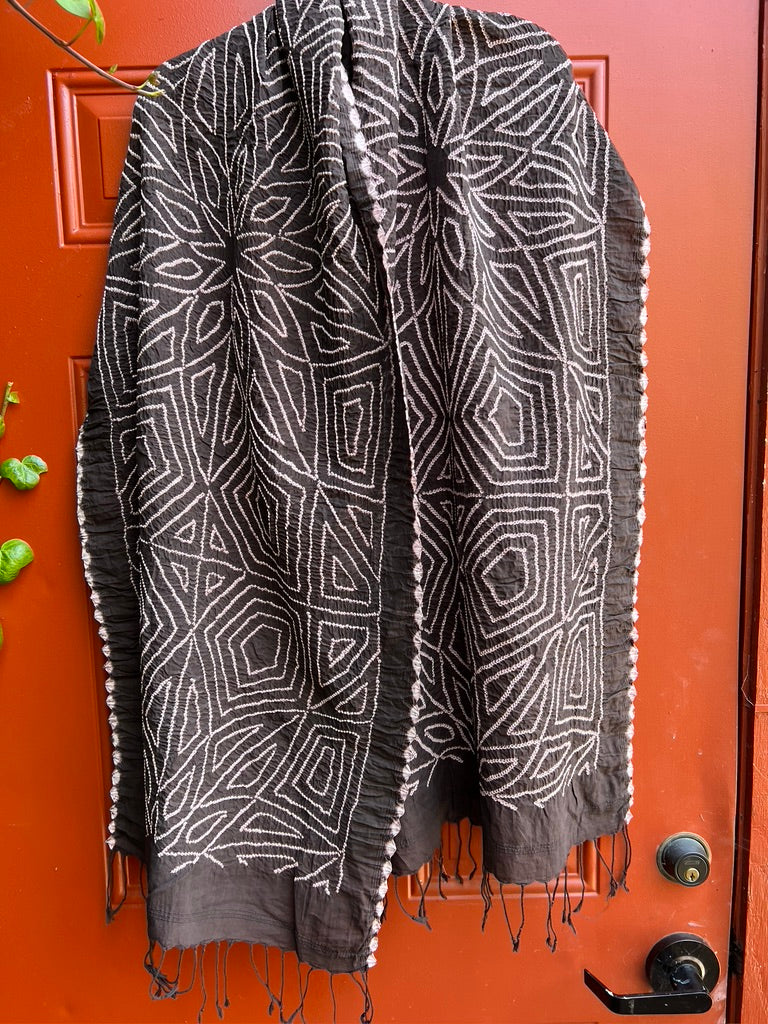 Masterpiece bandhani work in soft cotton, with natural hand-dyes, hand-looming - the works! We're in love with these subtle fall hues, each with a unique pattern. They measure 25" wide by 87" in length. Light and pliable enough to wrap several times as a scarf, or let it billow out across the shoulders.