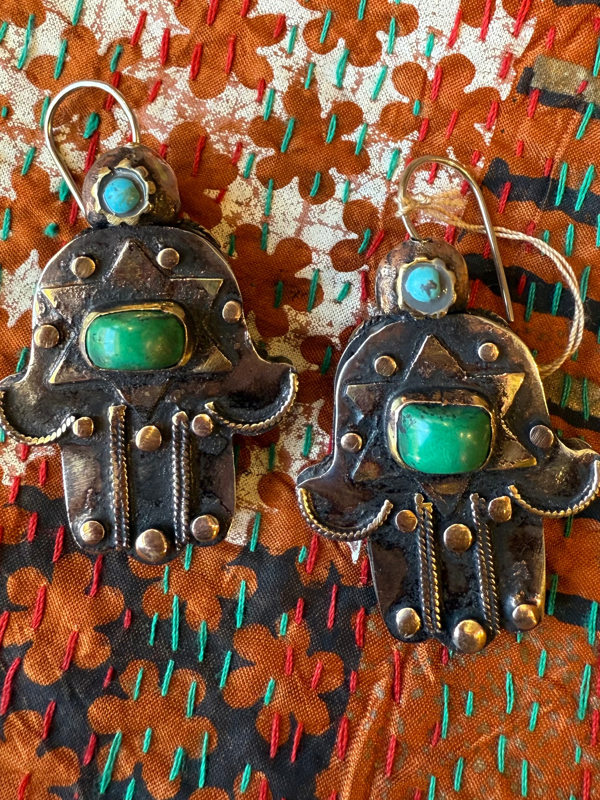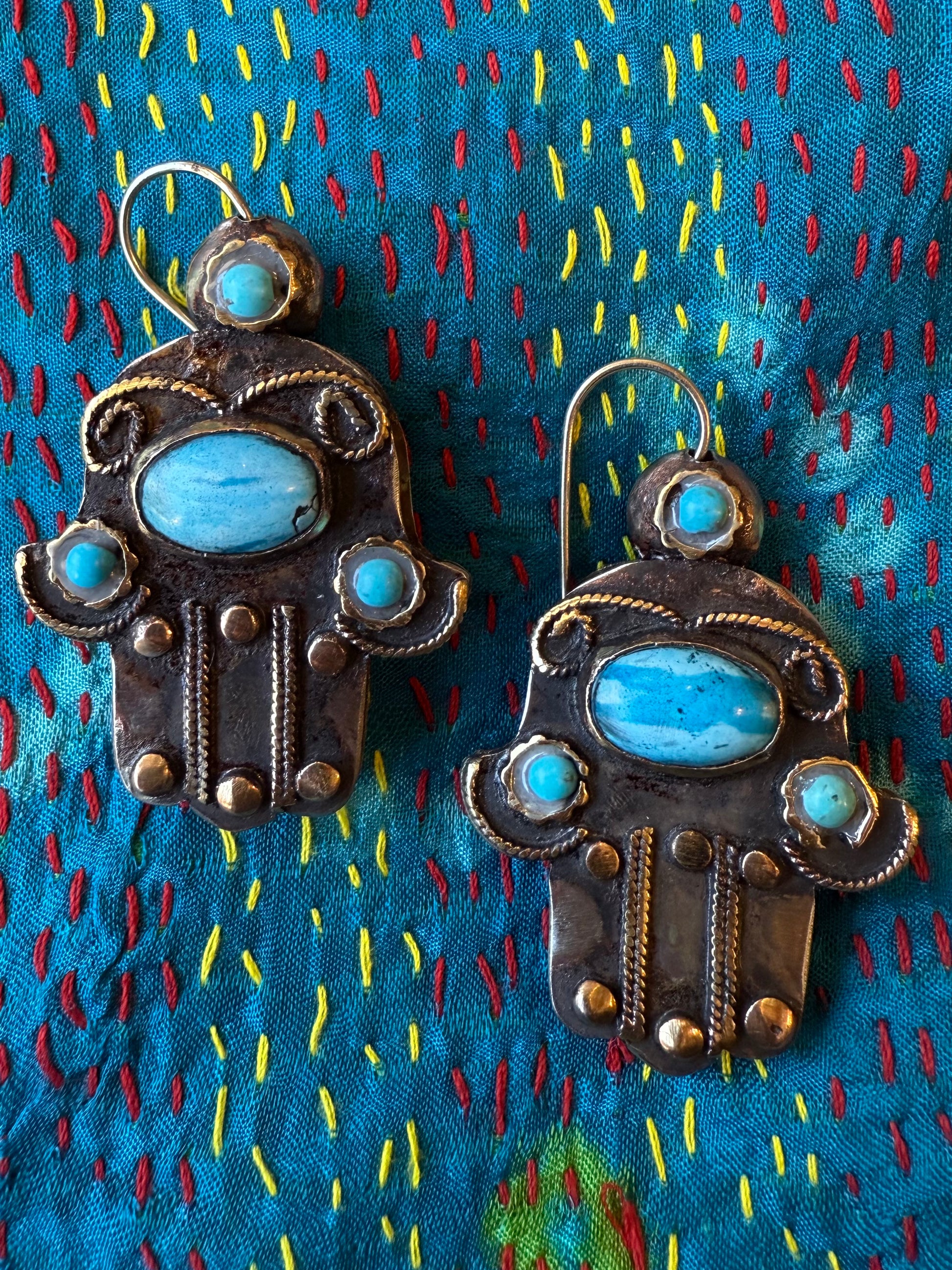 Beautiful old world charm gem-encrusted hamsa earrings. These beauties are hand crafted from white bronze measuring .5" thickness and 2" length. Many design details such as brass dots, braided rope and star overlay with gorgeous brass bezel settings with turquoise and vibrant coral gemstones. What makes these earrings extra special is the unique designs of the front and back. They have a comfortable hook that swivels so you can match your gemstones to your outfit with ease! These earrings are a nice, wearable weight for your ear all the while offering a substantial look. We are crazy about these little works of art for their double coolness factor and fabulous hand of Fatima motif.