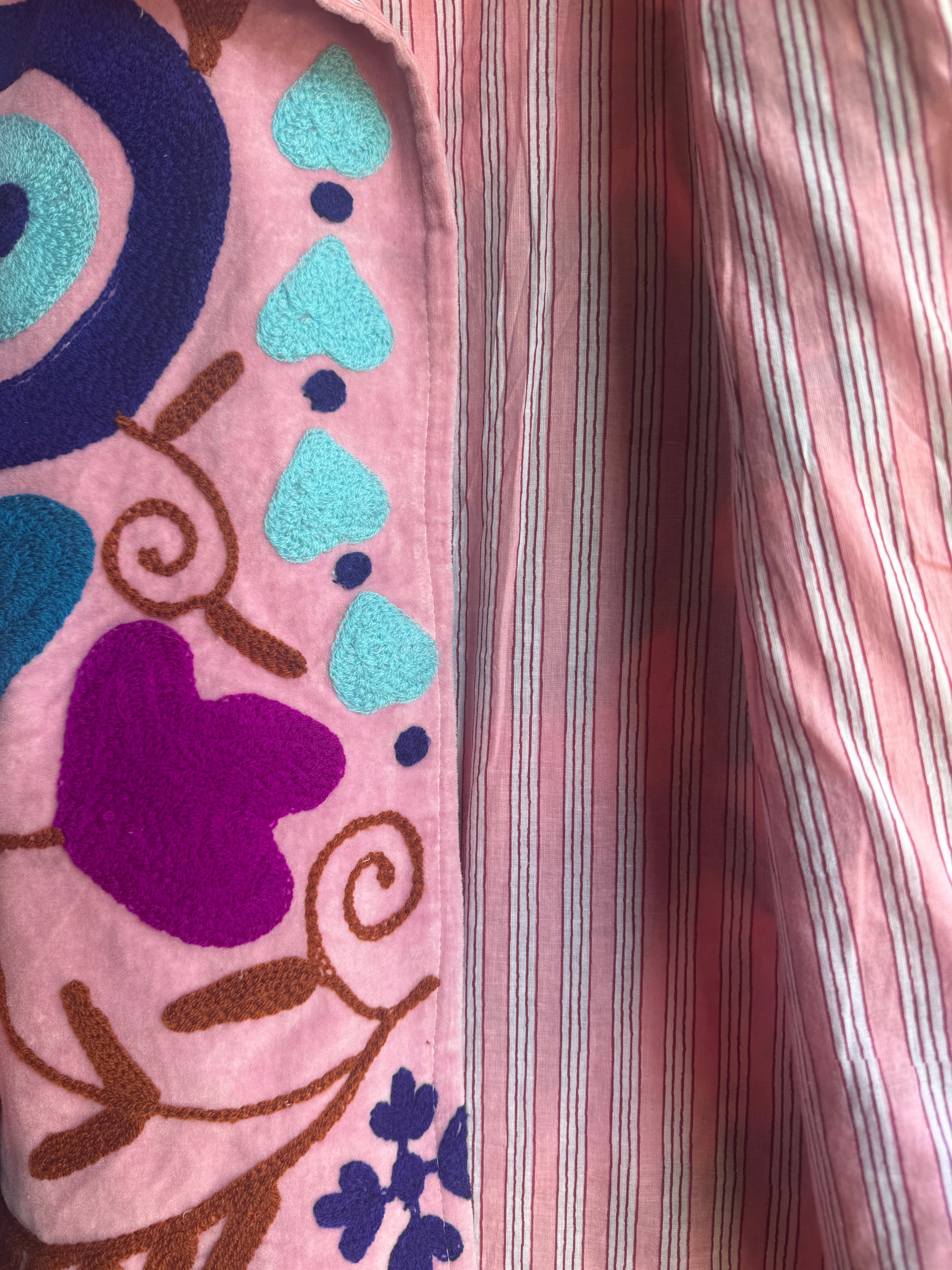 The sister jacket has a embroidered garden of turquoise, berry, cumin colored flowers and vines with a classic blue circle evil eye to keep those unwanted gazes at bay. This beauty is made of the same luxurious cotton velvet base only in the prettiest of pinks. Sweet pink striped 100% cotton lining. 2 side pockets. Size Large with a 48" chest measurement.