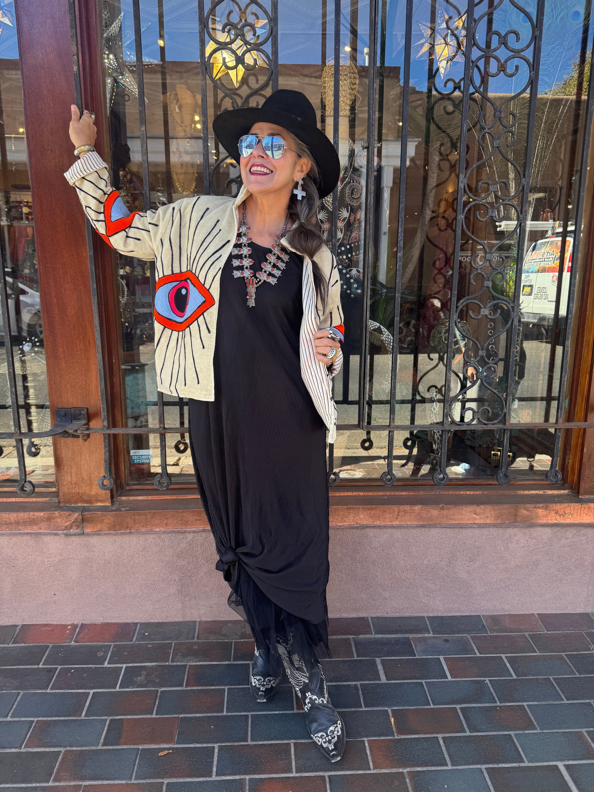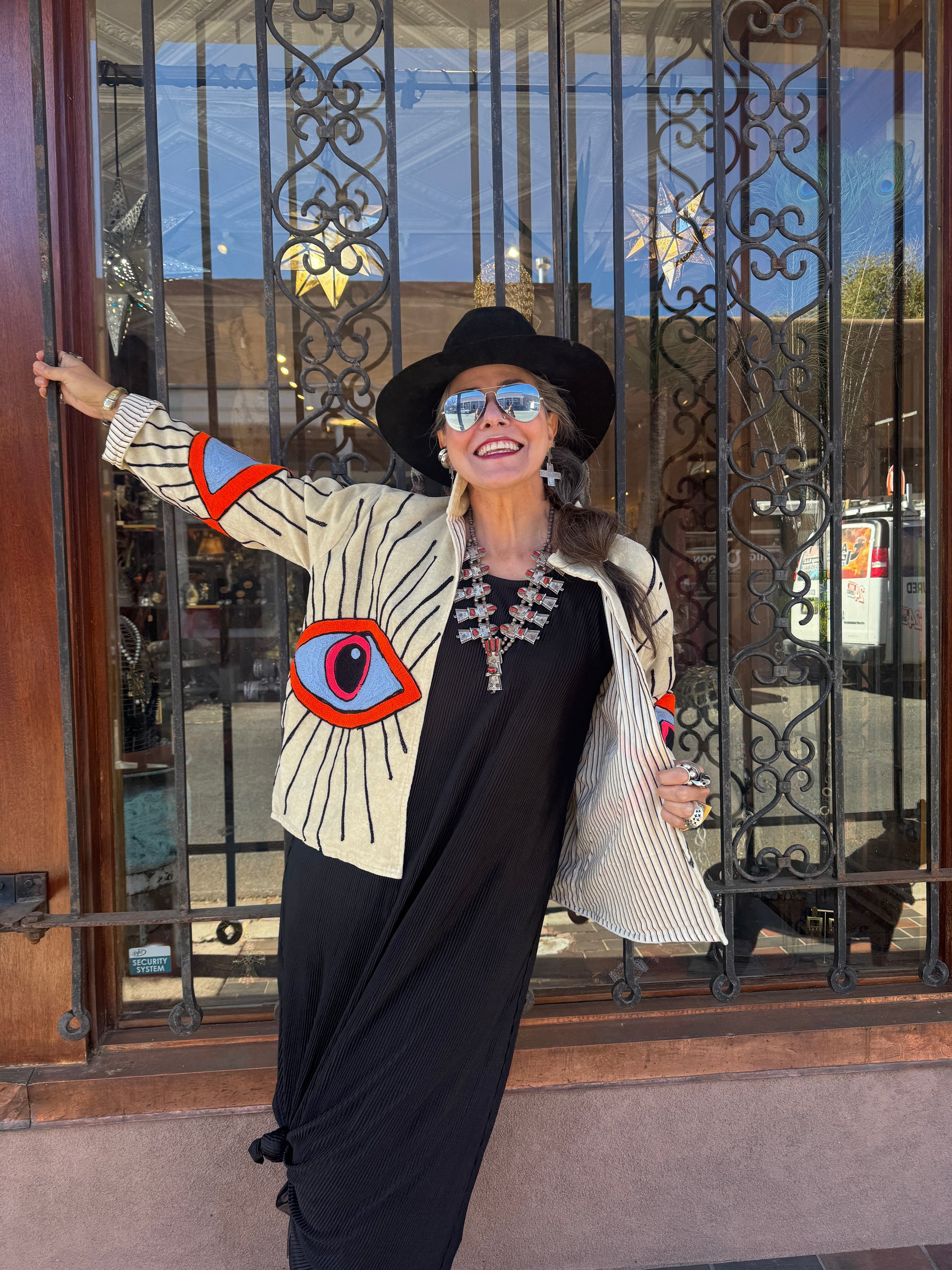 Get cozy in this luxurious cotton velvet jacket that will have all eyes on you! Beautiful bone white velvet with brilliant embroidered eyes of red and blue. Bold black linear lashes give a flattering verticality to this piece. The awesome eyes are found on the front, arms and back. The cut of this jacket is boxy and relaxed with an open nehru collar. Roll the sleeves up to show the cute lining. Fully lined in 100% cream & black striped cotton. 2 side pockets. Size XL with a 50"chest.