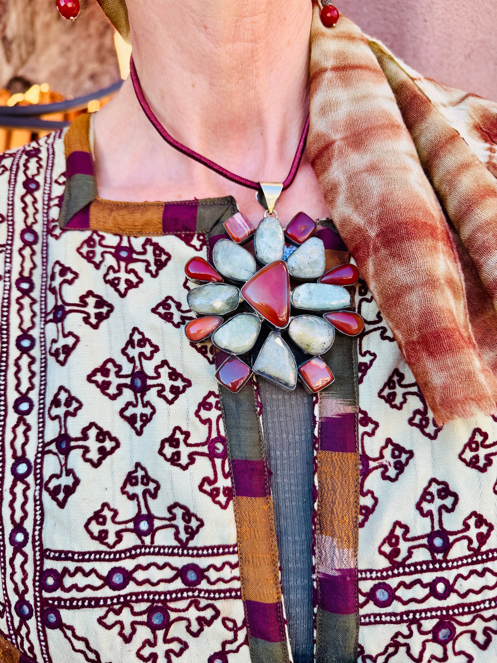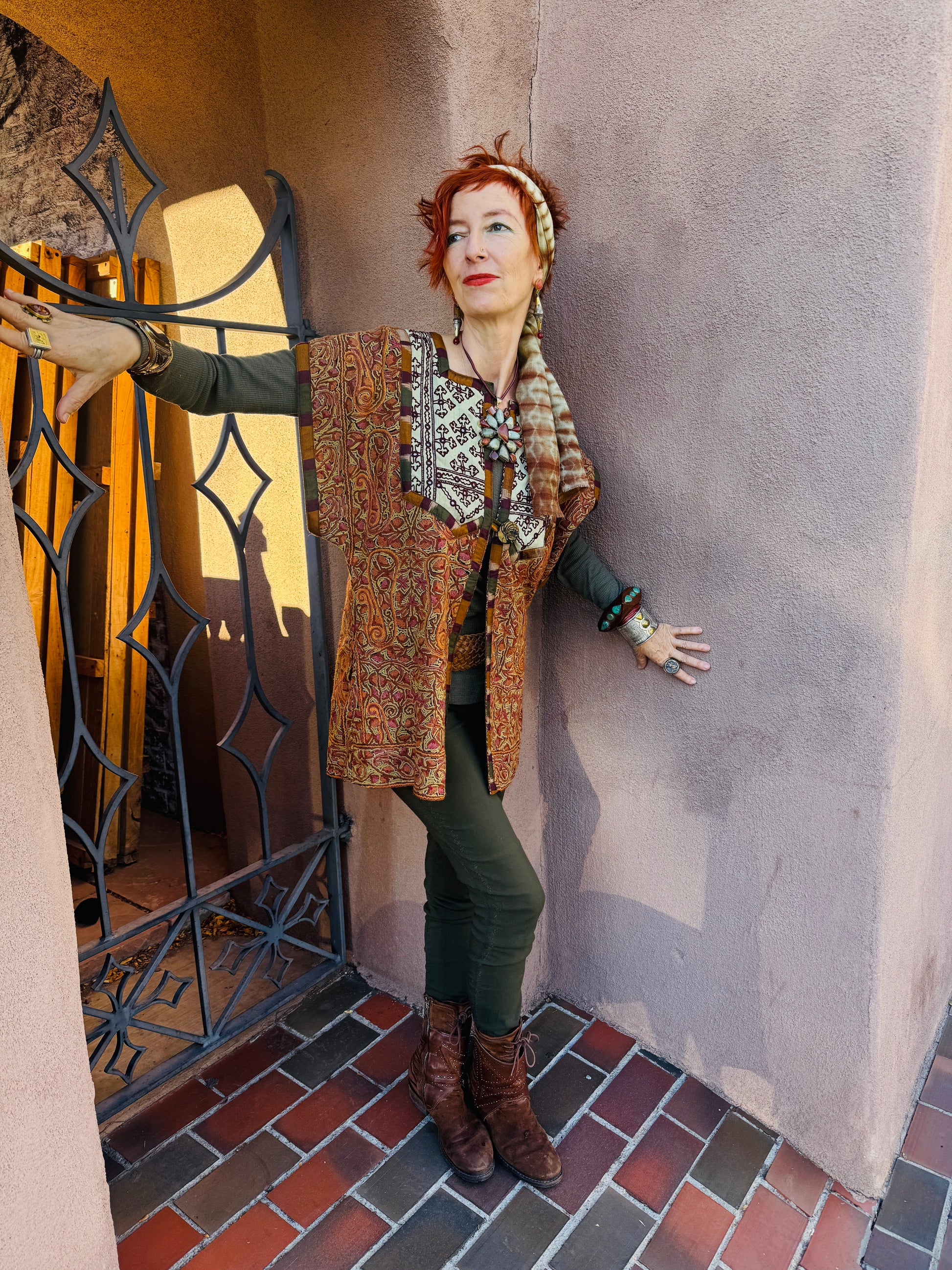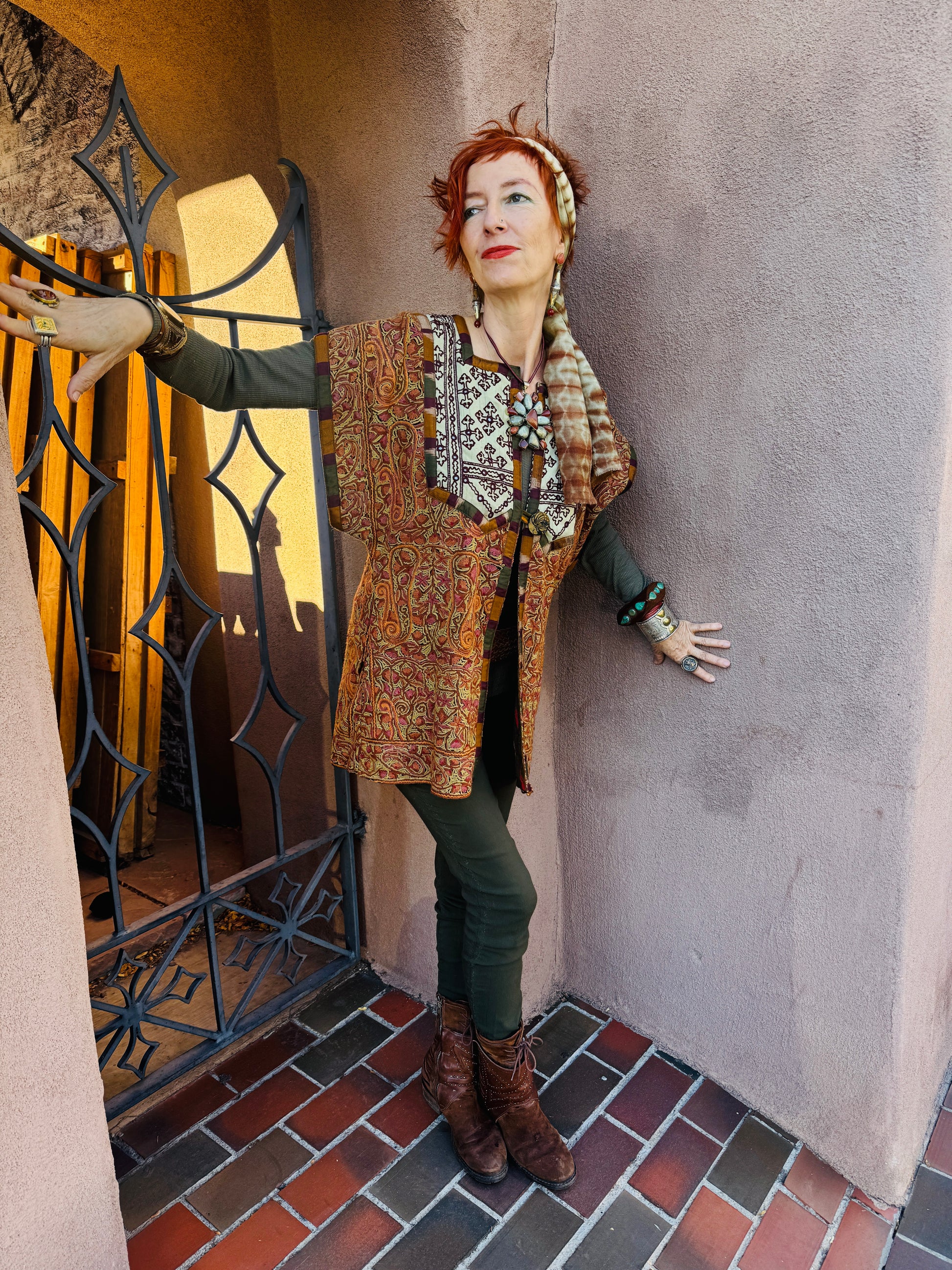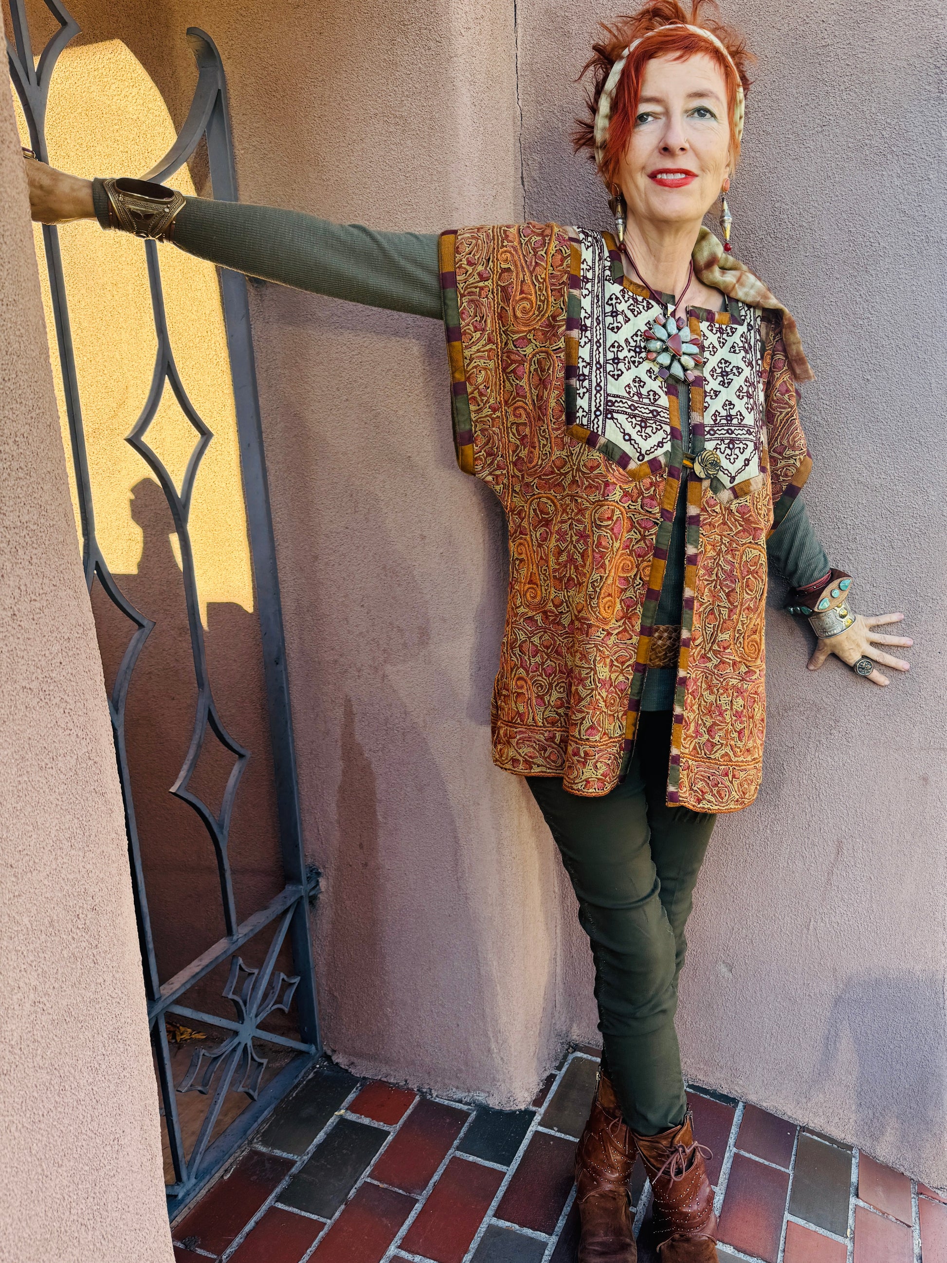 A cultural combo of coolness and exquisite hand-embroidery makes this wide drop, capped short-sleeve jacket rich in both color and design. The base of this one of a kind piece is made of extraordinary Kashmiri wool which is so soft and supple it feels like velvet. It is one glorious swath of hand-embroidered crewel work with intertwining hand stem, satin and french knots of floral, paisley, star and braided crewel work. The earthy yet romantic color story is an Autumnal dream in pecan, turmeric, ochre, tobacco and red-dotted mauve stars, flowers and fans. The fabulous front and back yoke hails from Afghanistan, salvaged from an upcycled light sage colored dress with the deepest sangre red cross hand-embroidered motifs all over. Meticulously placed hand mirror work gives this piece an even more revered richness. The yoke and crewel base is piped in a handsome Uzbek ikat silk in more autumnal forest green, deep old gold spice and sangre. More gorgeous earthy tones of ikat lines this fabulous creation albeit from the softest Indian cotton. A single button closure and 2 pockets keep you nice and cozy. Size Small, 40.5” chest measurement with 26” wide arm opening. A regal and substantial piece both in style and weight!