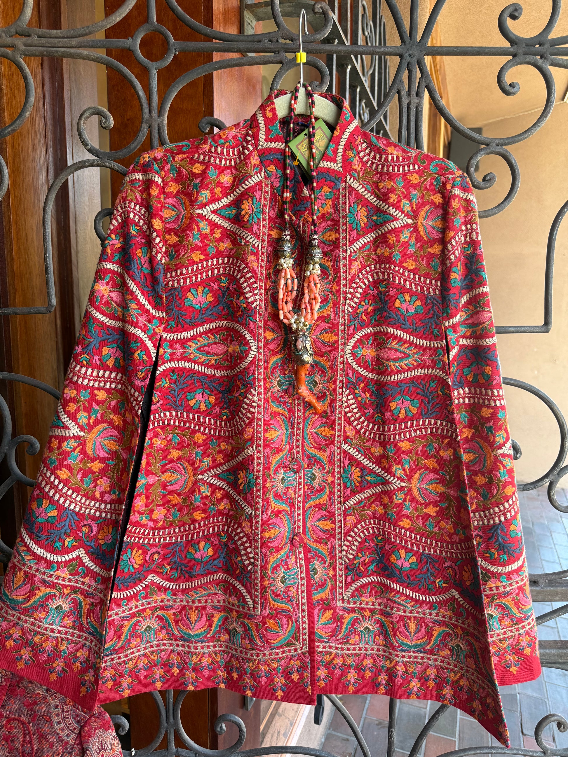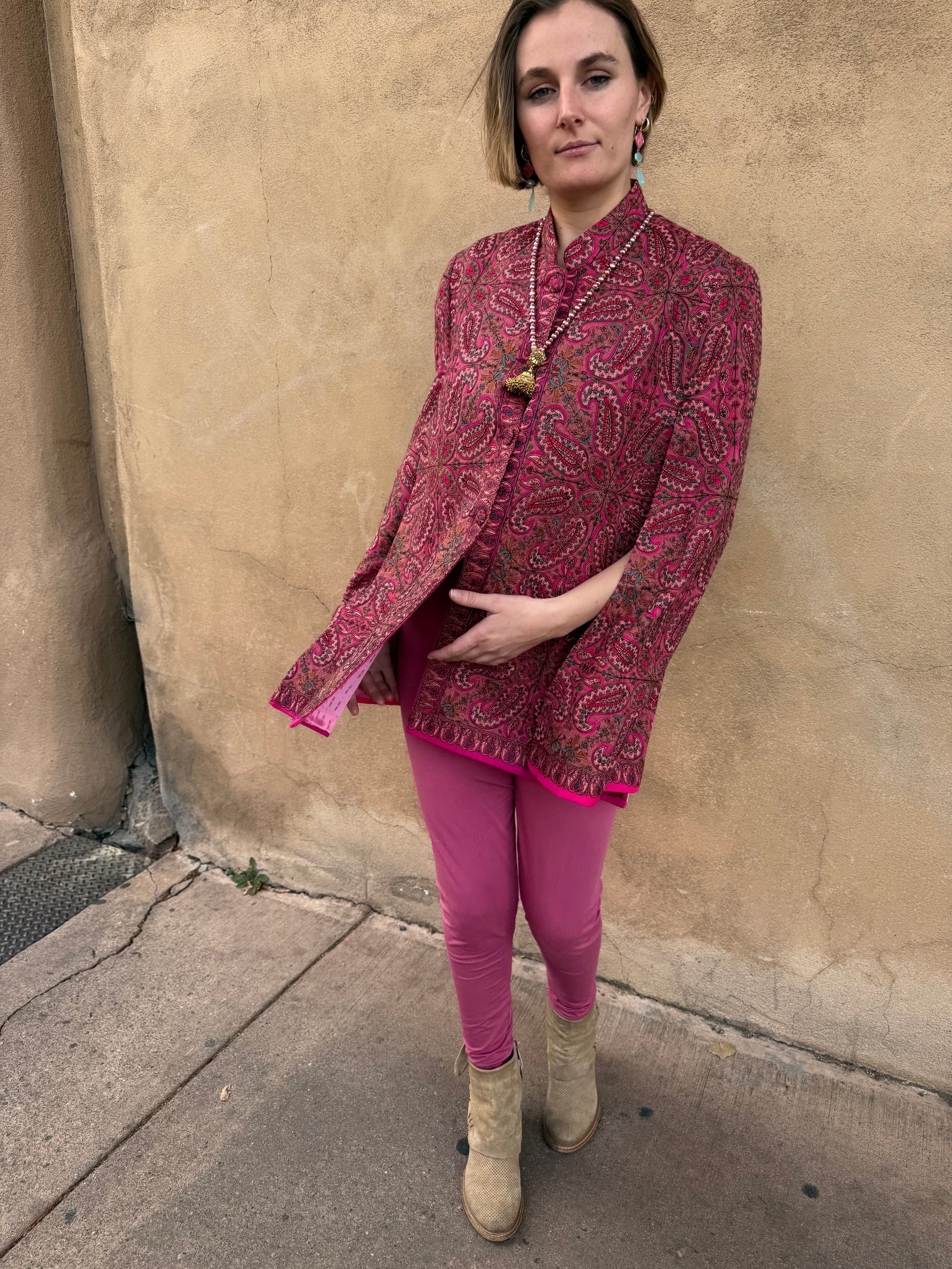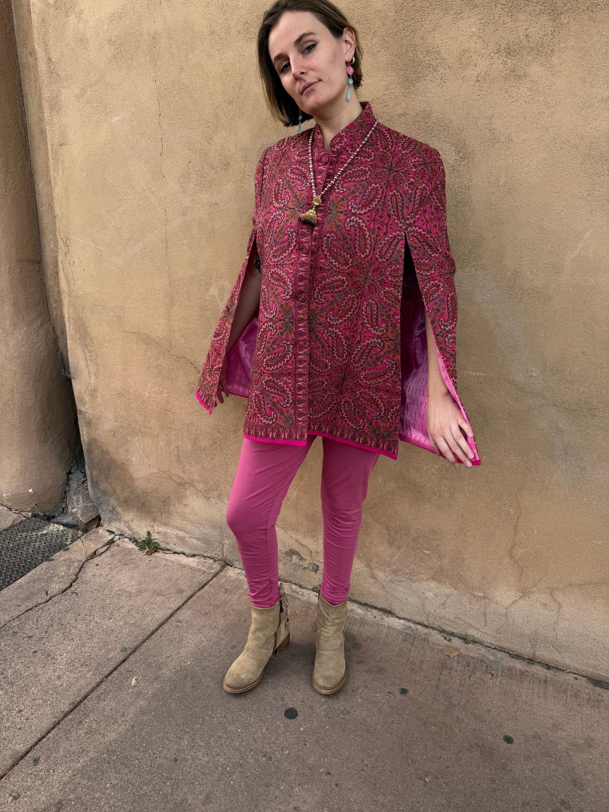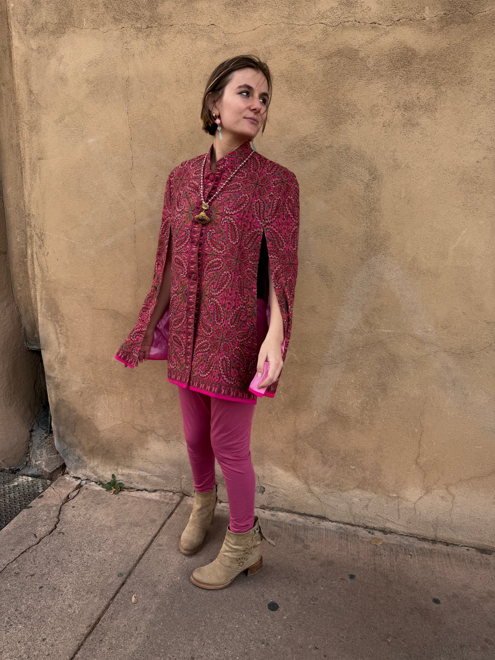 A veritable pink paisley garden in the form of a soft Kashmir cape! Happiness abounds in this chic and effortless piece. Paisley is the motif! You'll find an allover exquisitely embroidered grid of paisley that blossom into a greater floral motif. Multiple shades of pink: raspberry, soft coral pink, hot magenta pink. All the pinkness is peppered with embroidered soft turquoise tulips, and red infused paisley centers. The nehru collar, lapel and cuffs have a garden of embroidered paisleys. Even the adorable buttons have paisley and tulips embroidered on them. One of a kind wearable art. Elegant embroidery at its finest. This pink paisley Kashmir cape not only keeps you warm, but keeps you chic. Fully lined in a pink synsilk satin. Size small/medium. 34" shoulder measurement. OOAK. Red floral also available!