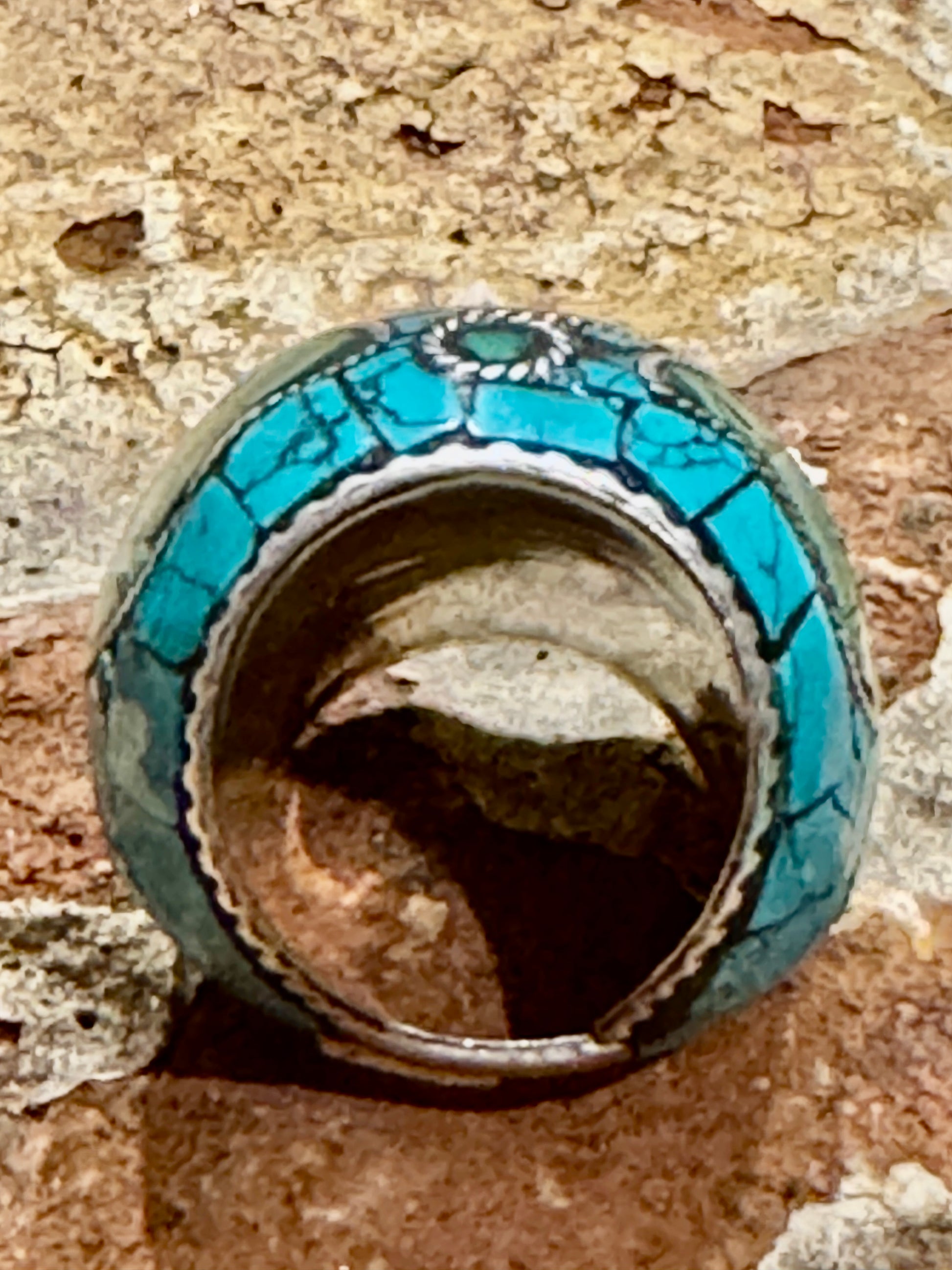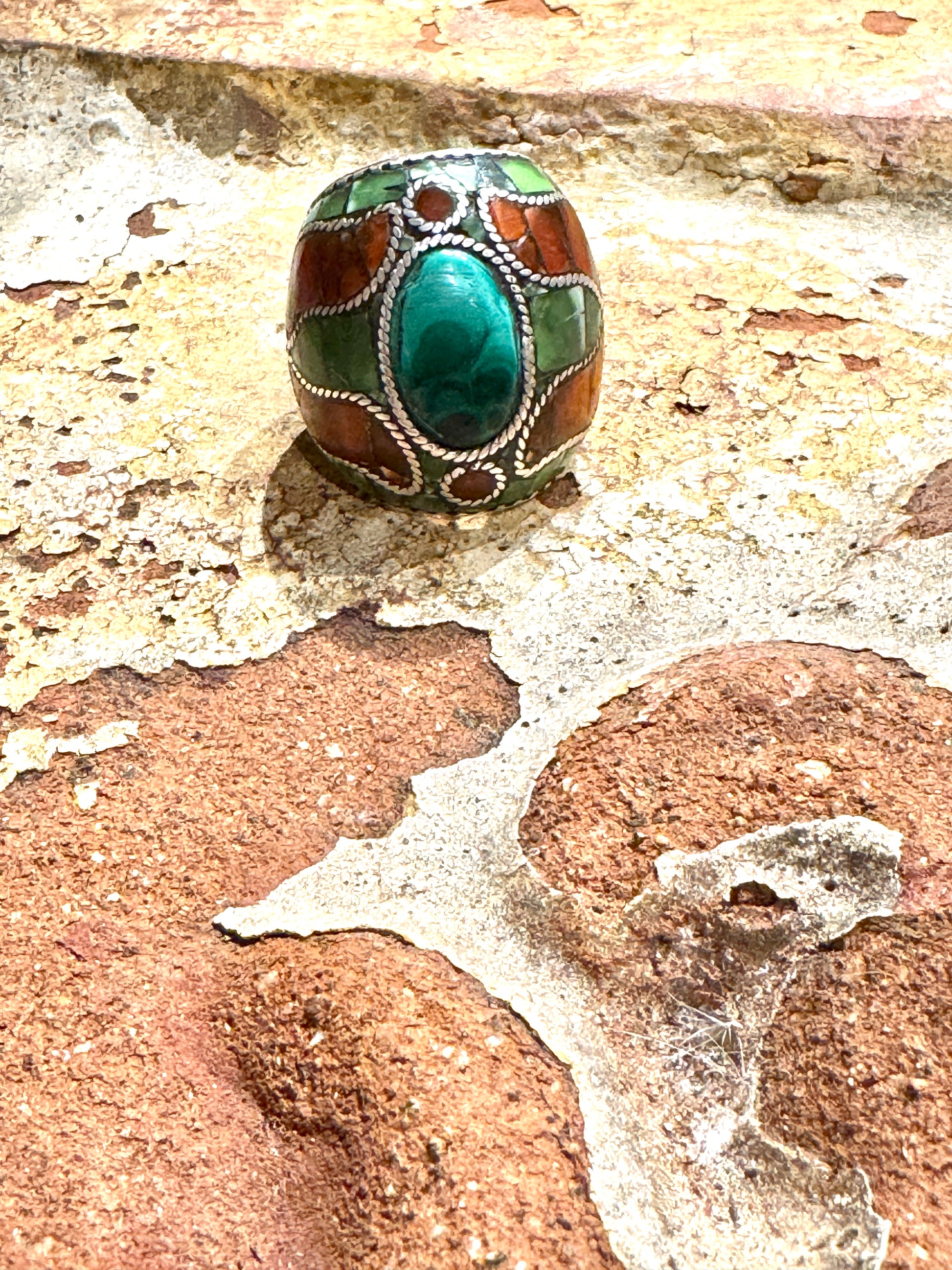 These amazing three rings are each unique but share the same 3D hollow saddle construction. Rendered in 925 sterling silver and clad with a tight and smooth mosaic of malachite, turquoise, lapis, labradorite and coral stones. Made in India’s crown state of Kashmir, these are collectors pieces for those who like strong statement jewelry.