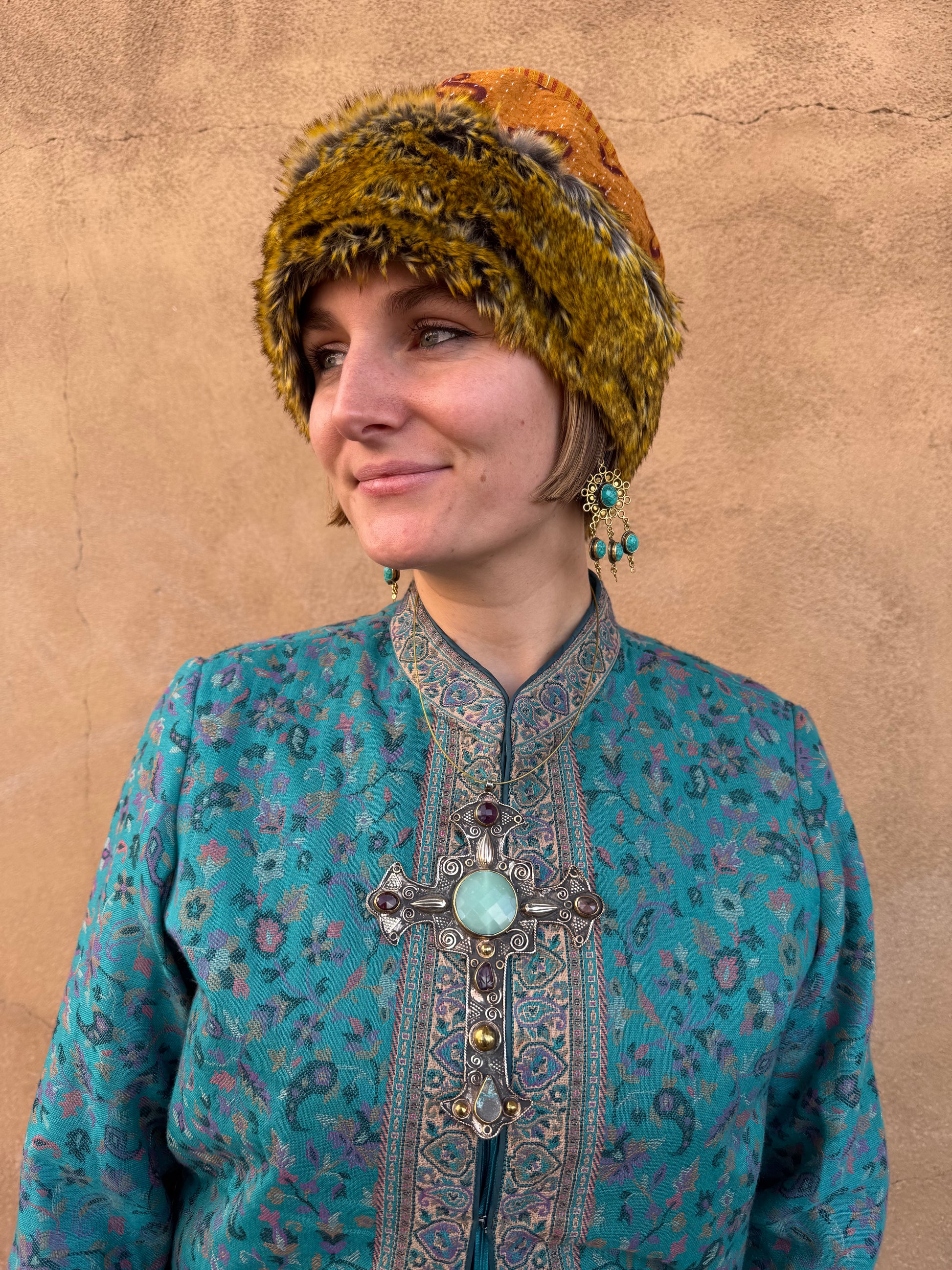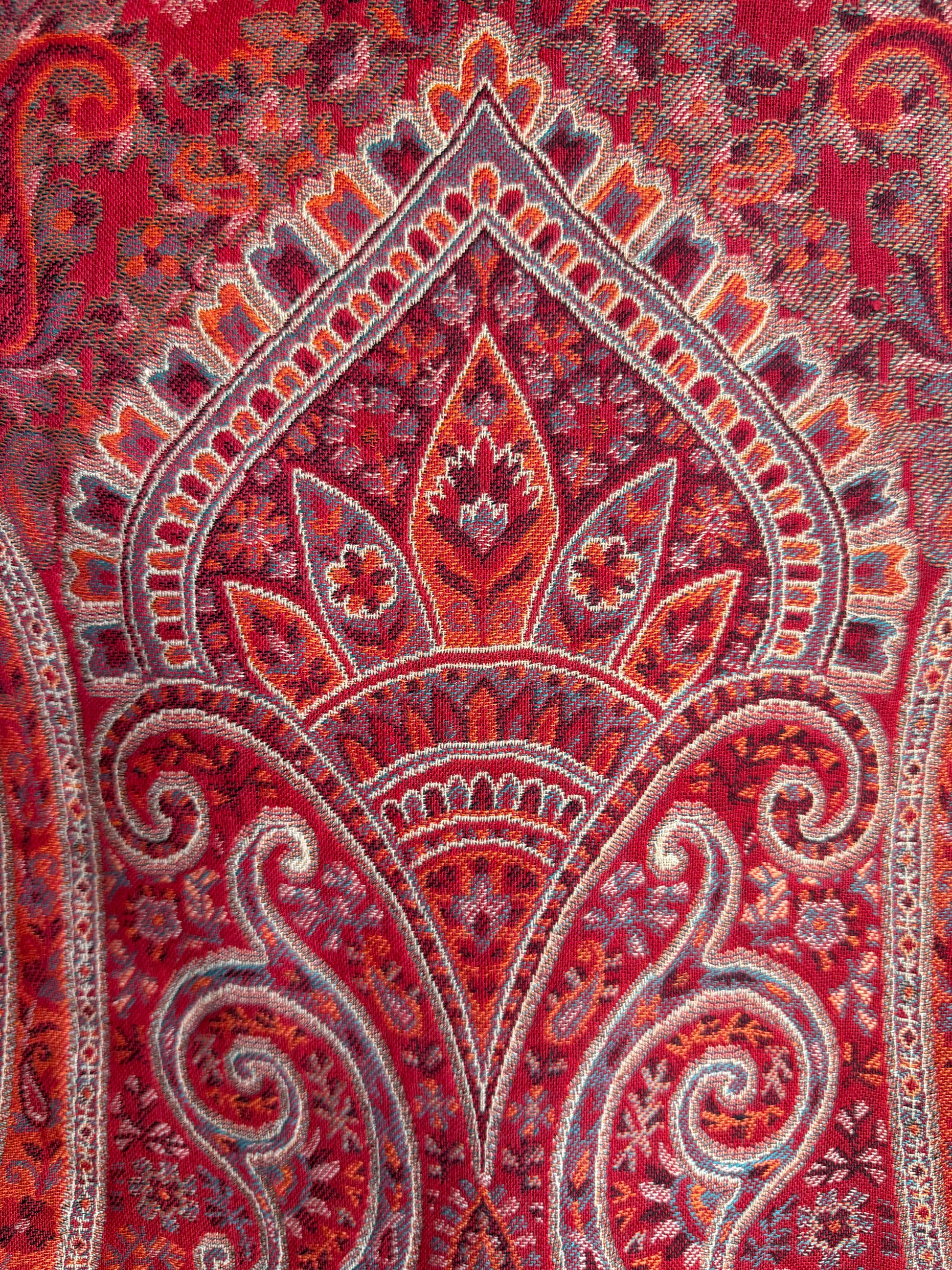 A timeless classic cut made with THE softest kashmiri wool in a floral and paisley paradise brocade. This turquoise Kashmiri coat has an effortless elegance with the all over floral and paisley brocade, an elongating vertical panel lapel and classic nehru collar. The beautiful brocade soft wool has luscious shades of plum, coral and forest green, with a soft cream lapel, cuff and hem of paisley and flowers. Lined in a coordinating sage turquoise satin synsilk, it slips on easily over a sweater. The cut of this coat is ideal for an inverted triangle shaped figure, with a straight line to the hips. The single hidden hook closure allows for the only flare in the straight line, which is perfect for the small hipped gals. Two side vent pockets. Size Small, 40" chest. Gorgeous red paisley available below!