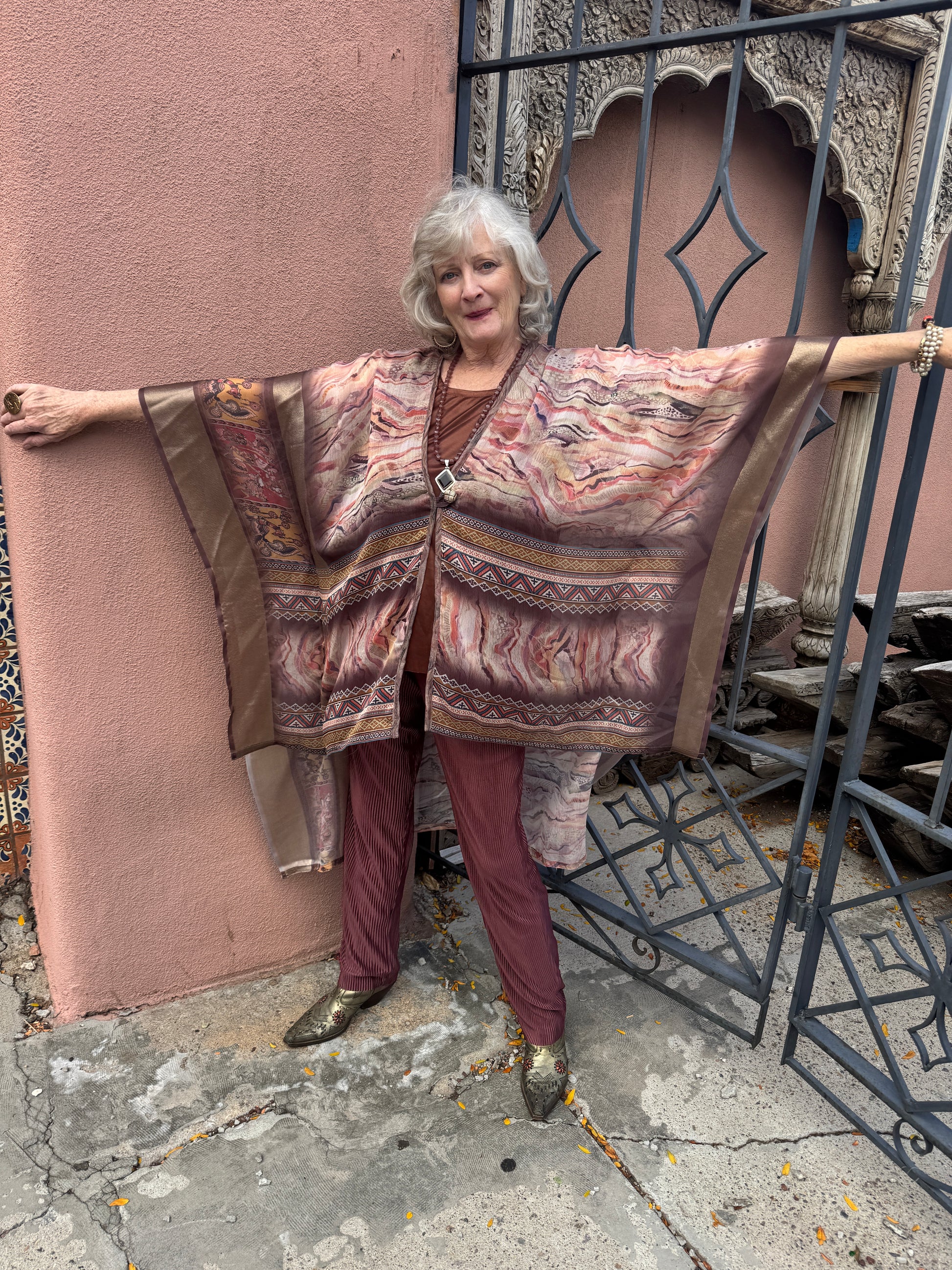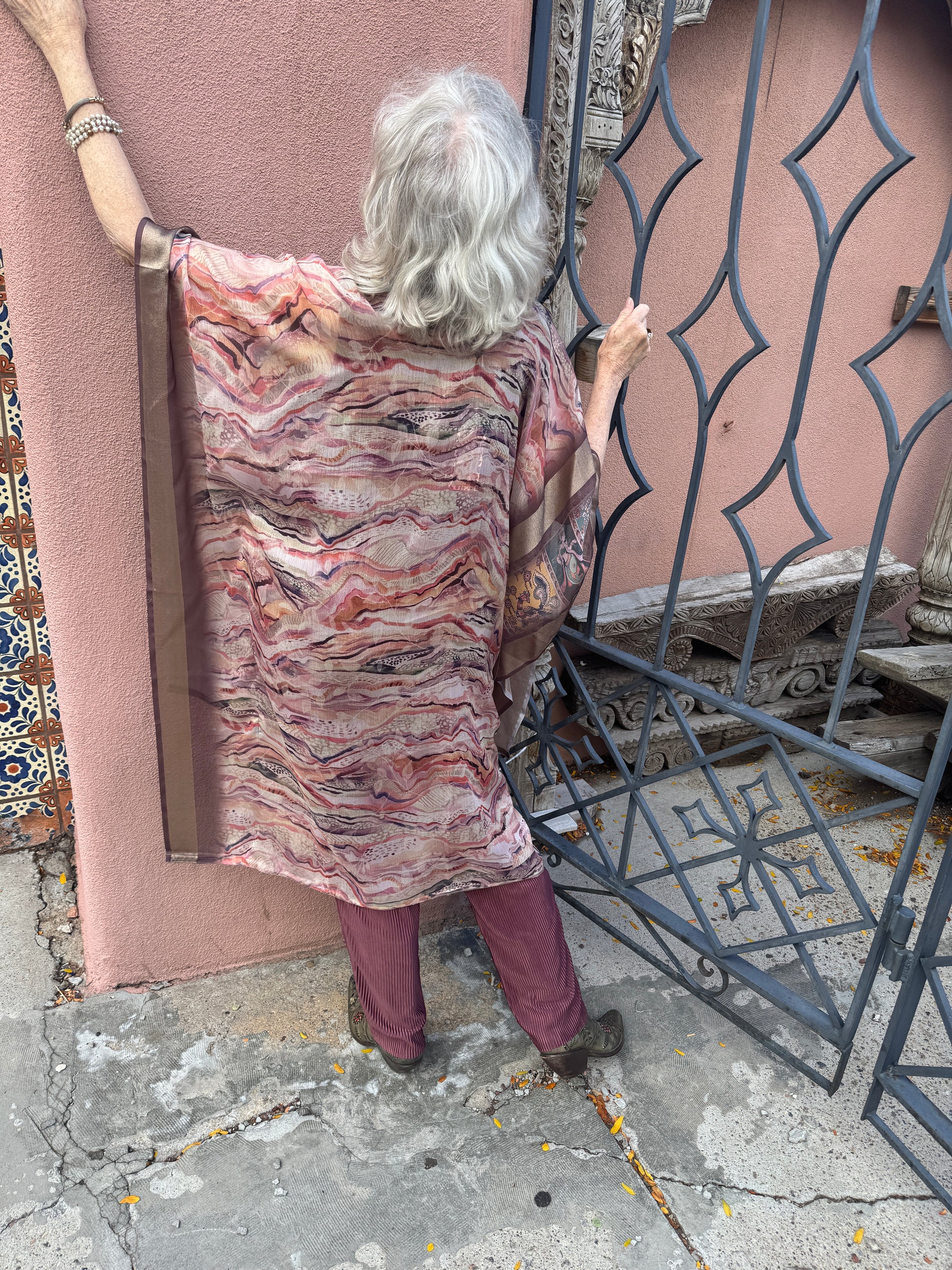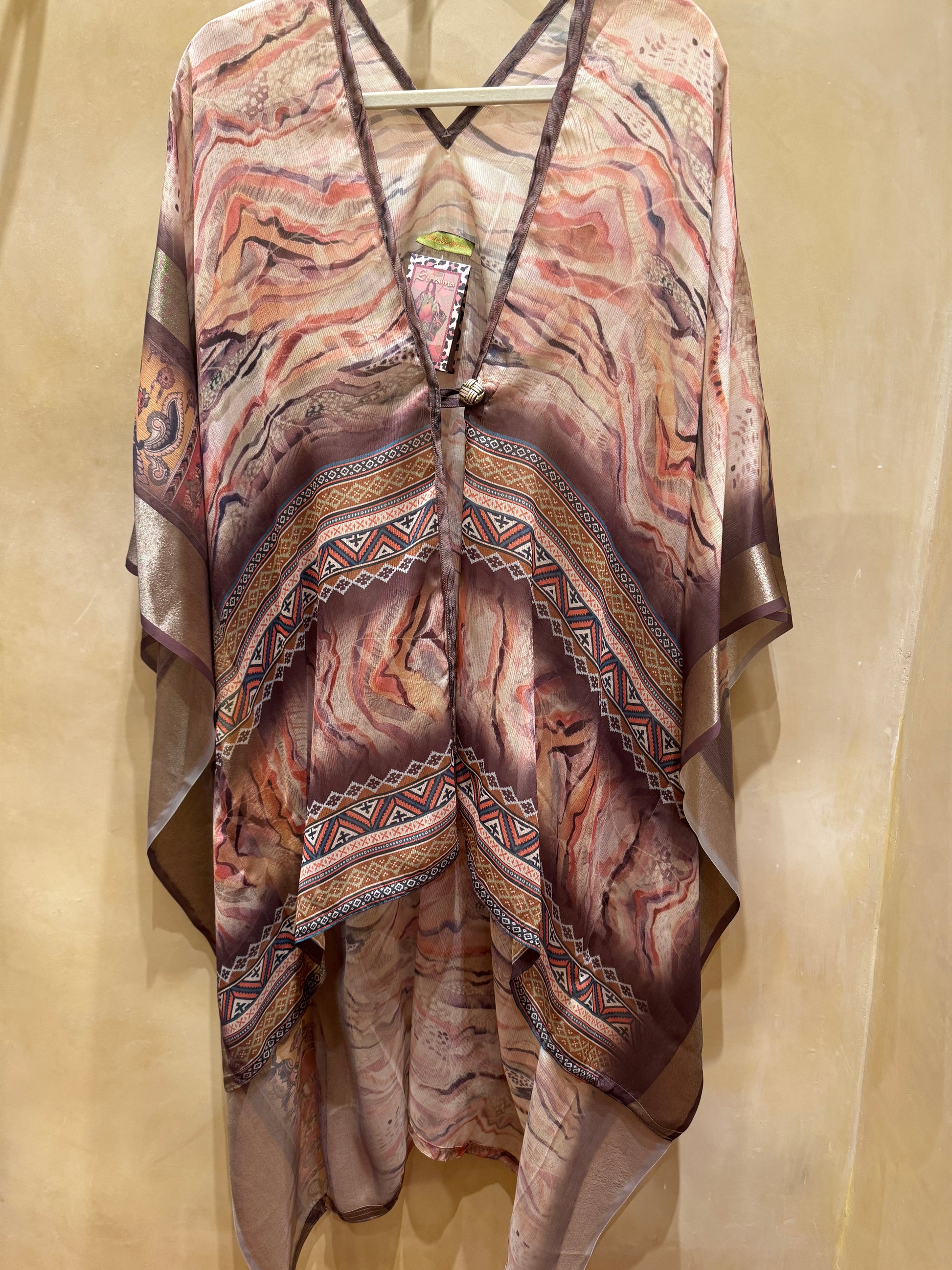 Our lovely classic the Le Mullet kaftan coat. Light and airy, a layer for all seasons. Hi-low hem. A richly printed marbleized synsilk In soft light autumn colors. One of a kind. One size fits most. Single button closure.