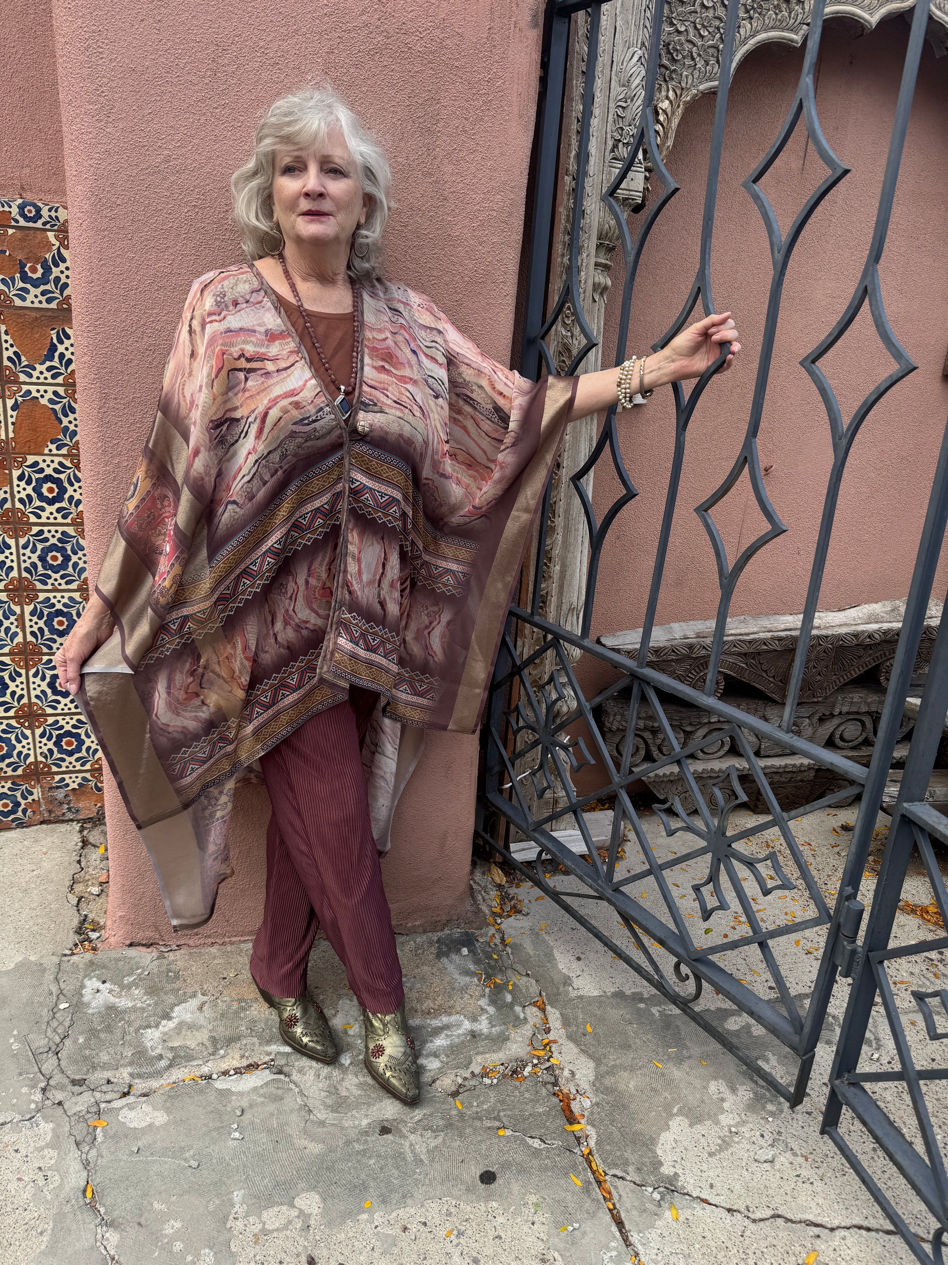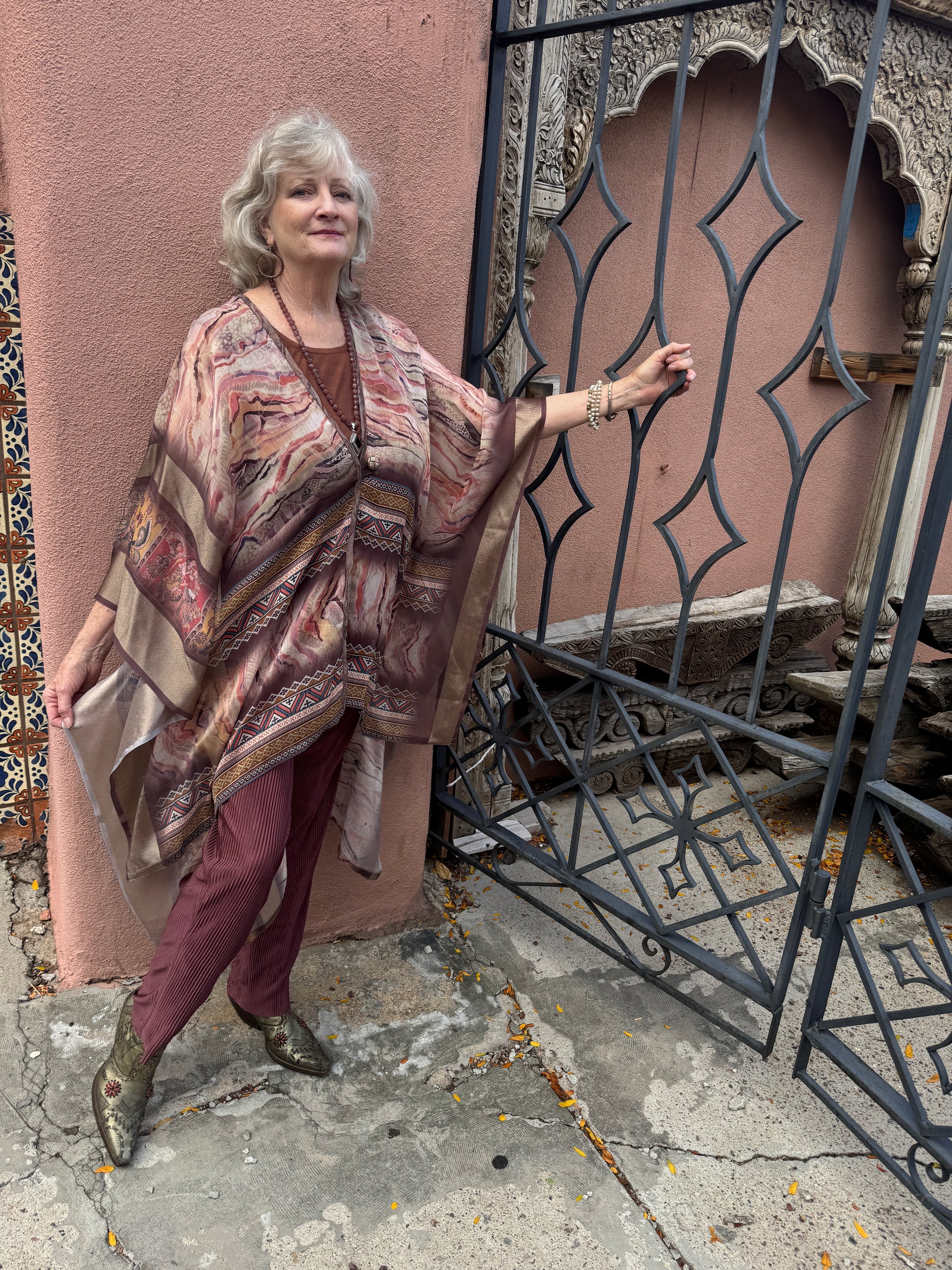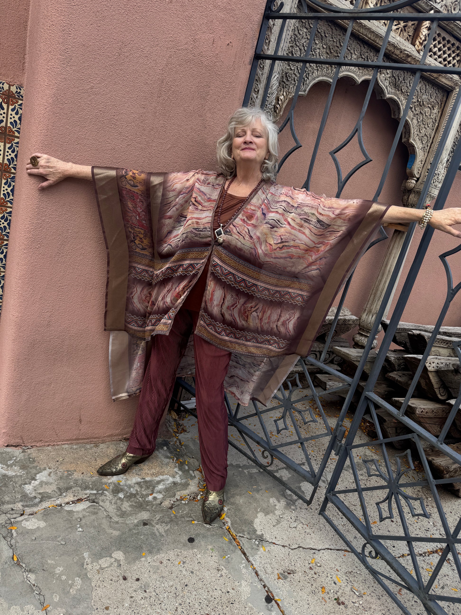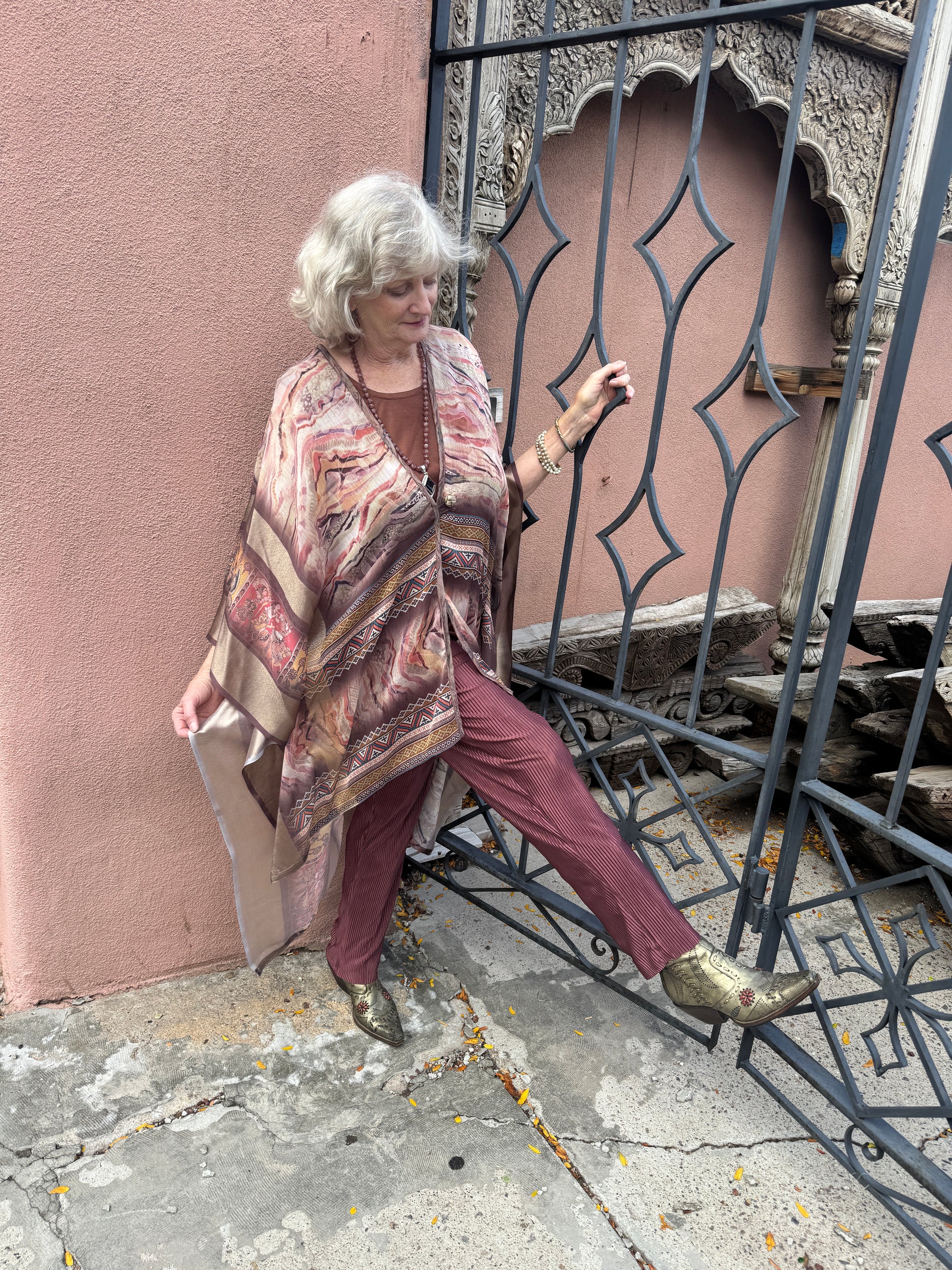 Our lovely classic the Le Mullet kaftan coat. Light and airy, a layer for all seasons. Hi-low hem. A richly printed marbleized synsilk In soft light autumn colors. One of a kind. One size fits most. Single button closure.