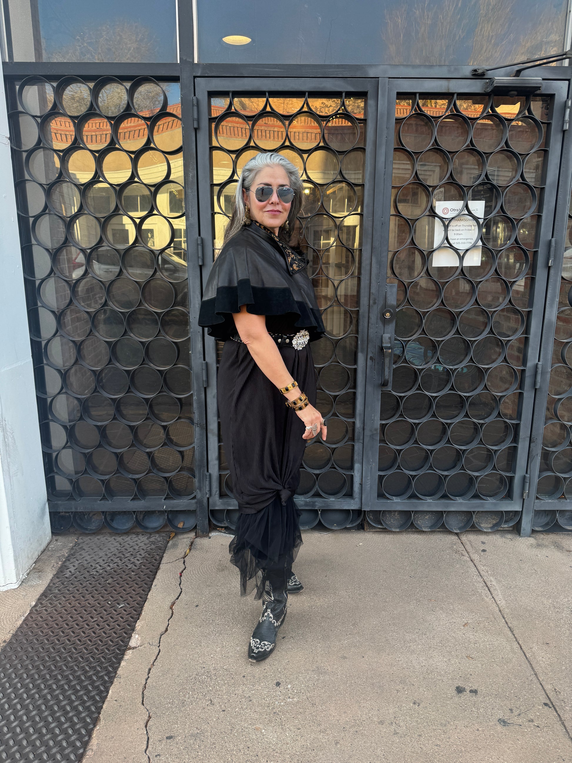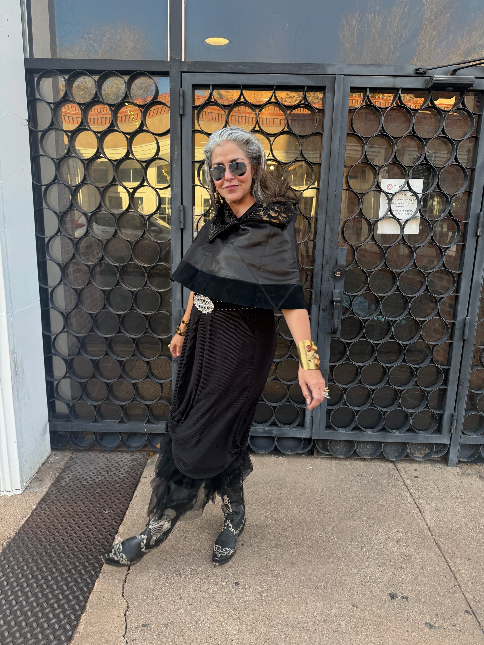 A little bit rock n' roll with a smidge of Phantom of the Opera. Vintage black leather with rich repurposed gold & black velvet brocade lining, and black suede trim. Yes, please! This piece is lovingly upcycled from a gently worn leather mini-skirt. The leather is soft and buttery to the touch. The bias cut and sewn gores/panels give the flair that made this design repurpose possible. The zip closure is offset from center, creating a chic neckline. The sweet suede hem has a ruffle gather which gives the fall great flair. This elegant piece is still wearable as a mini-skirt for those micro gals measuring size XXS with a 27" waist and 18" length.