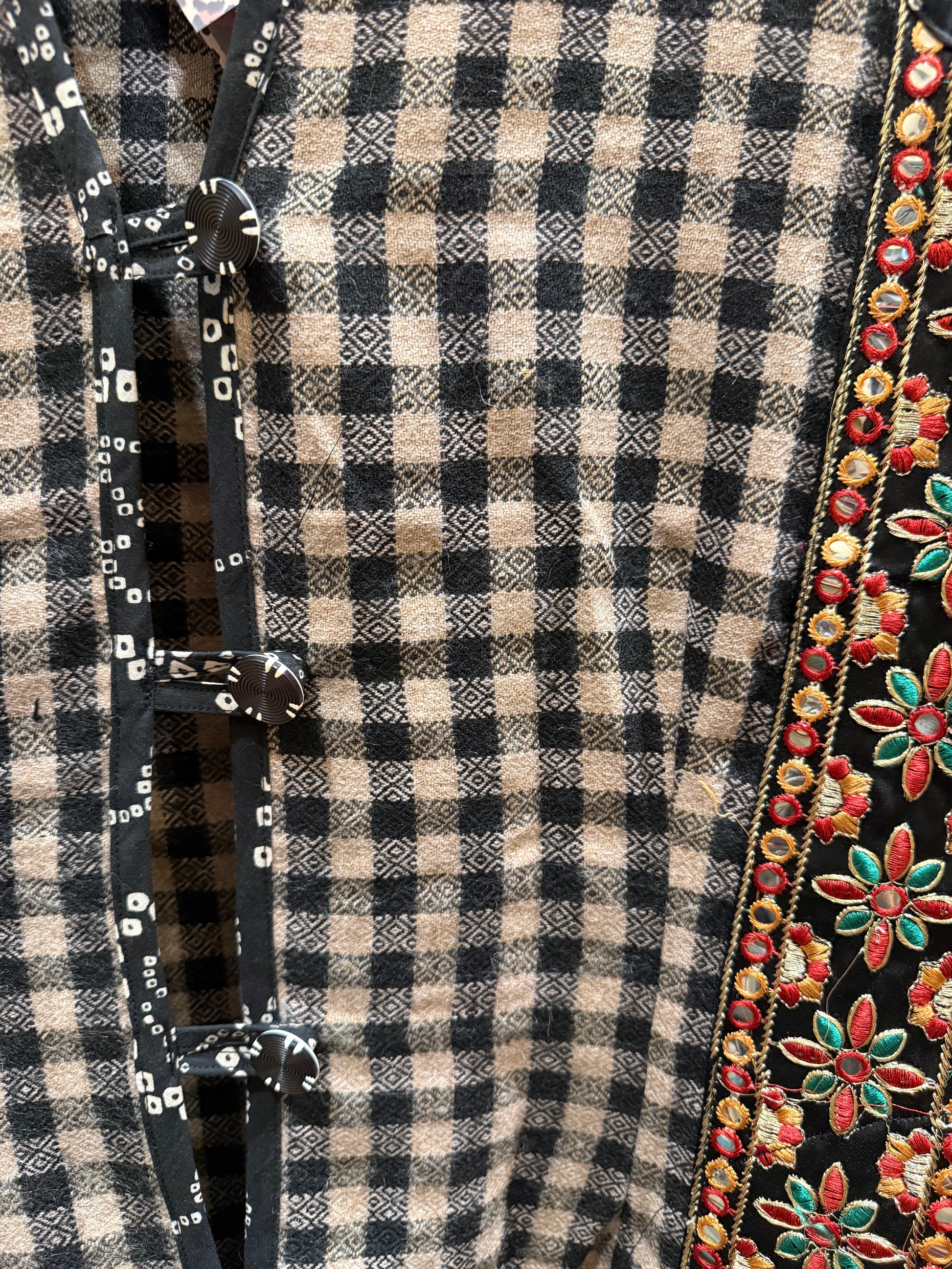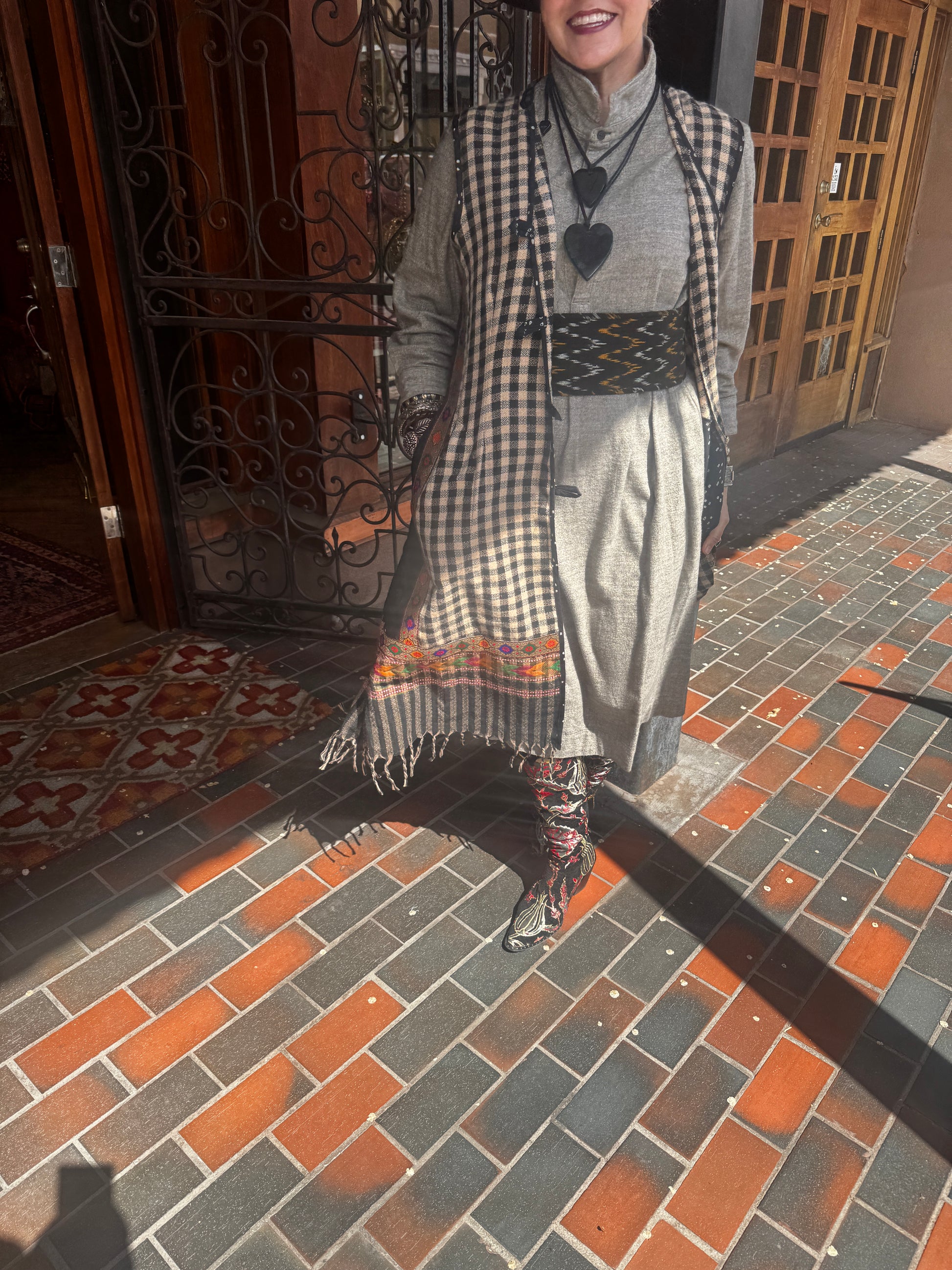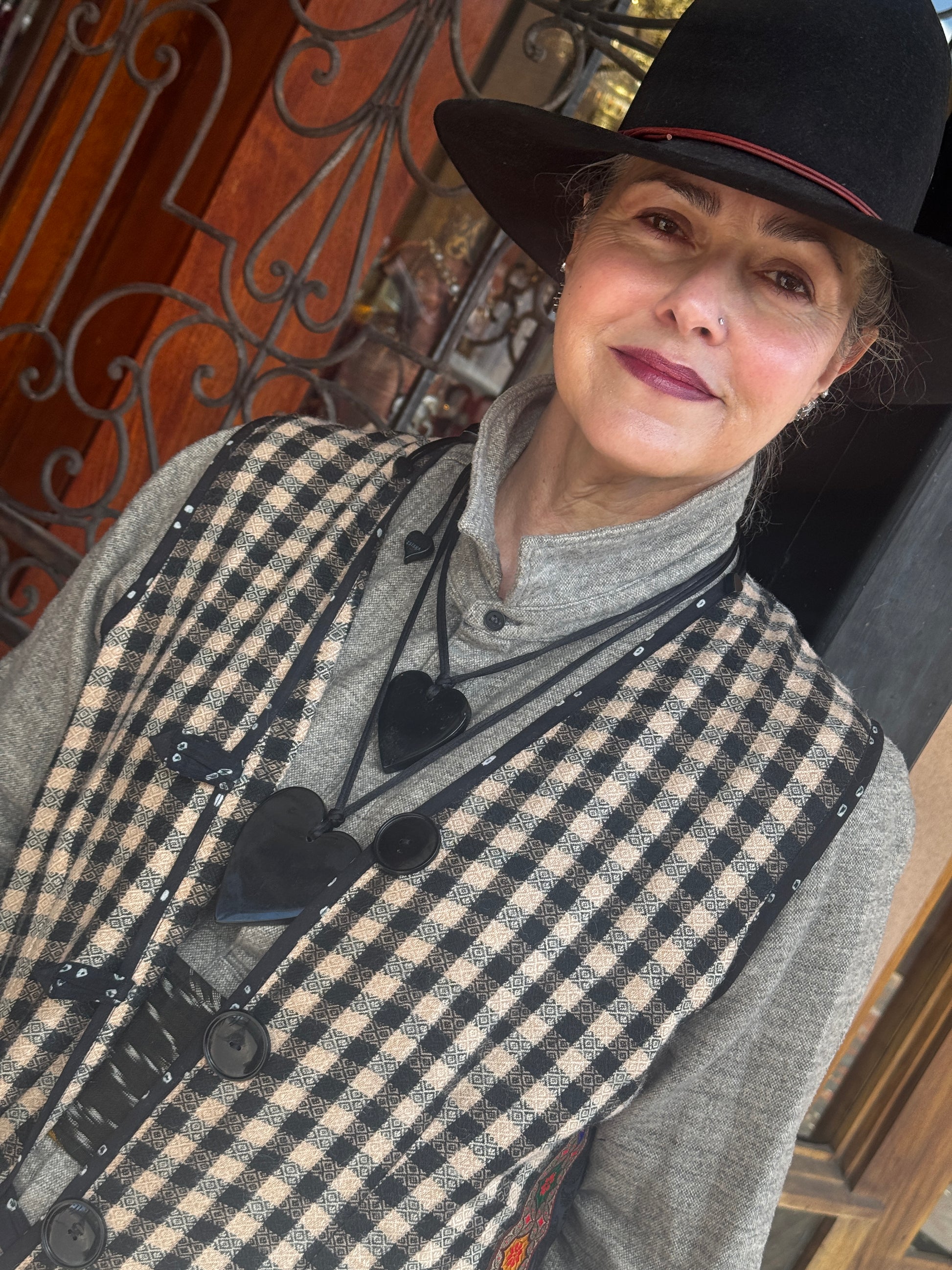 Love. Love. Love. All we need is LOVE! And as much as possible. We've got a crop of much anticipated Love Vests to offer our Serrahna love birds. These fun and cozy vests are made from upcycled gorgeous checkered sherpa wool that is soft like fleece and perfect for those with wool allergies. Sherpa wool is hypo-allergenic and soft to the touch. The fun checkered weave leads down to a patterned hem with fringe. Each vest has unique trim work with hand-blocked cotton and a coordinating upcycled brocade with LOVE applique in more color-pop cotton lettering. Two side vent cotton lined pockets. Button closure. Norma is wearing a Large size.