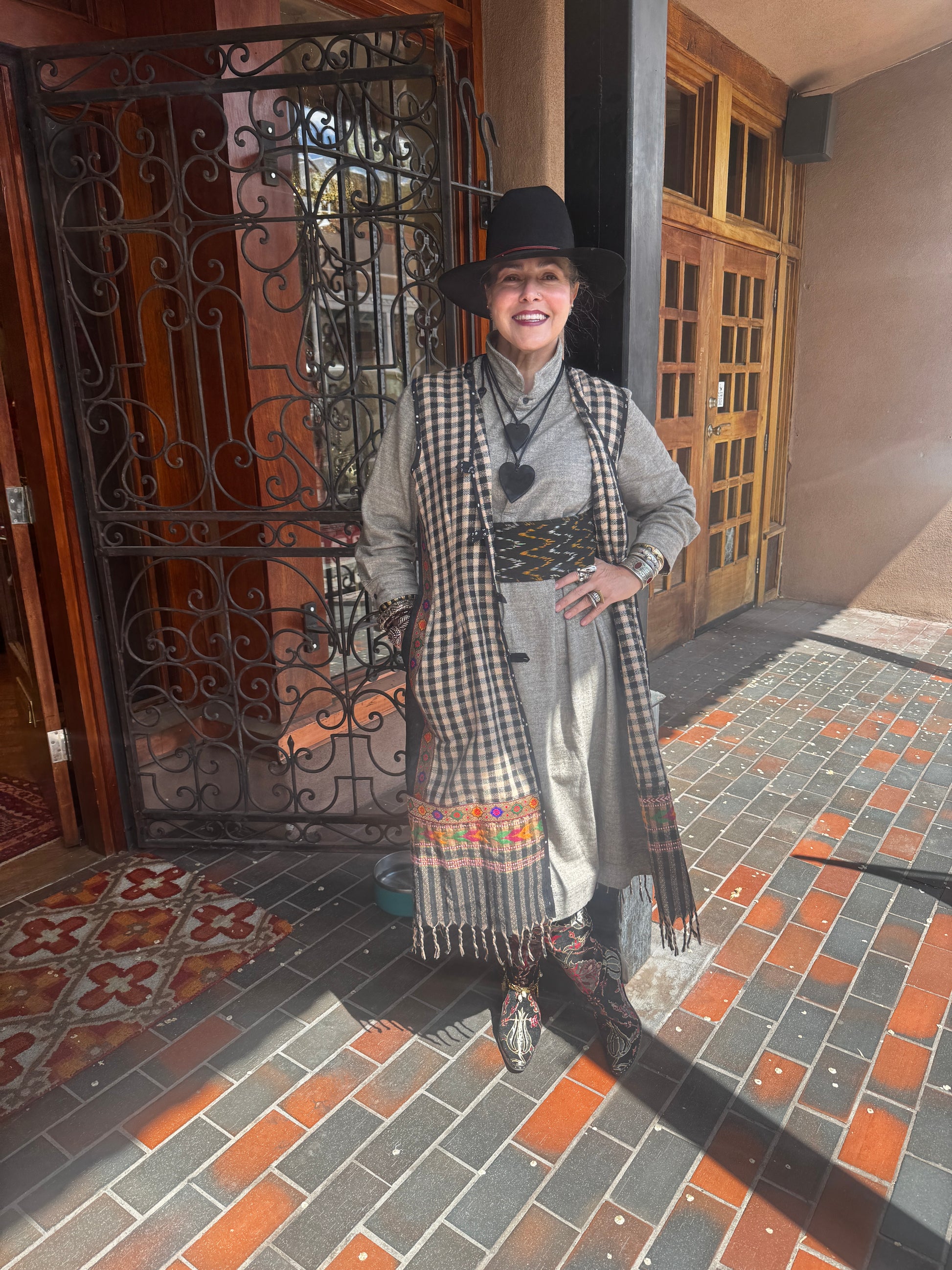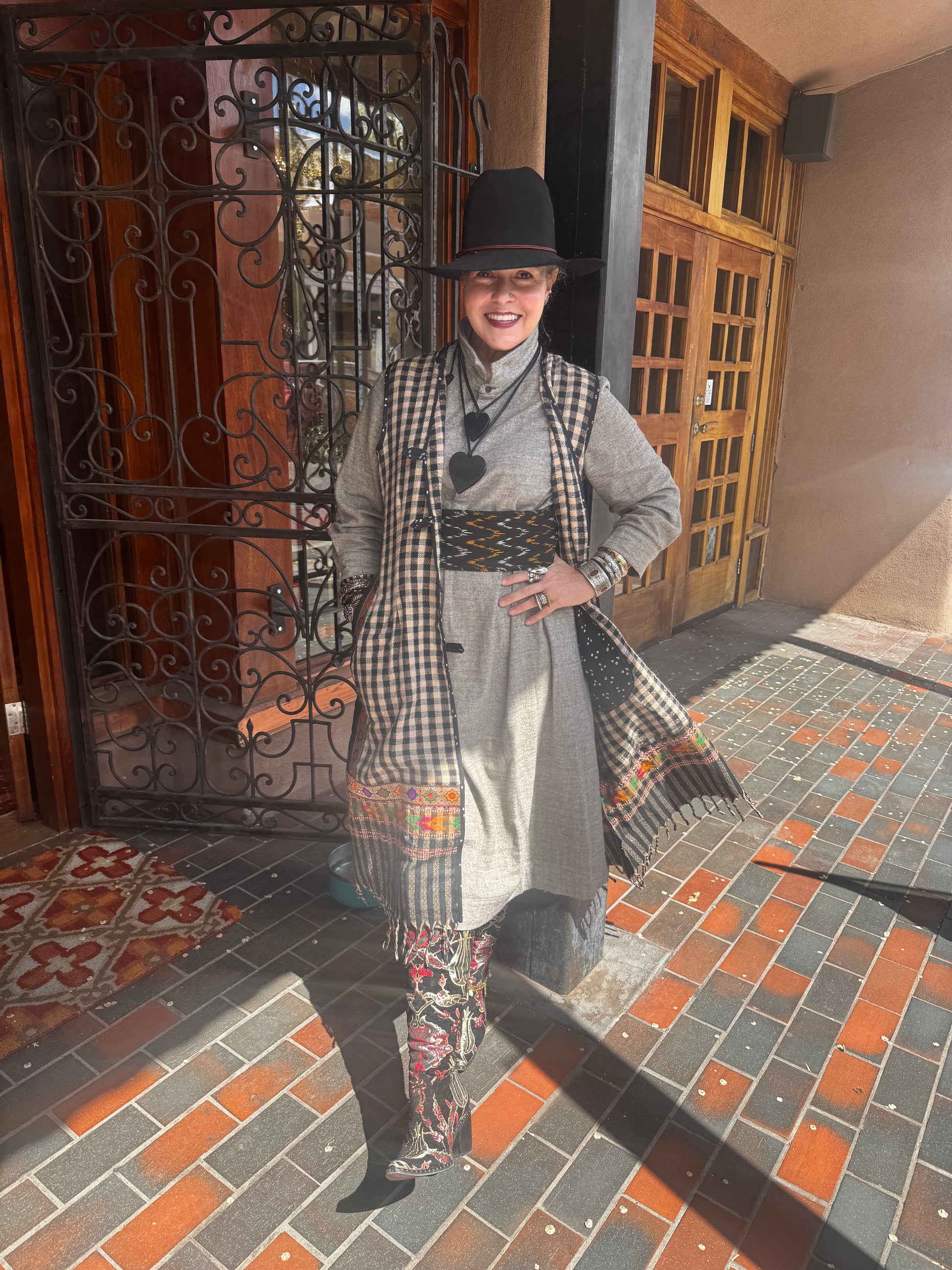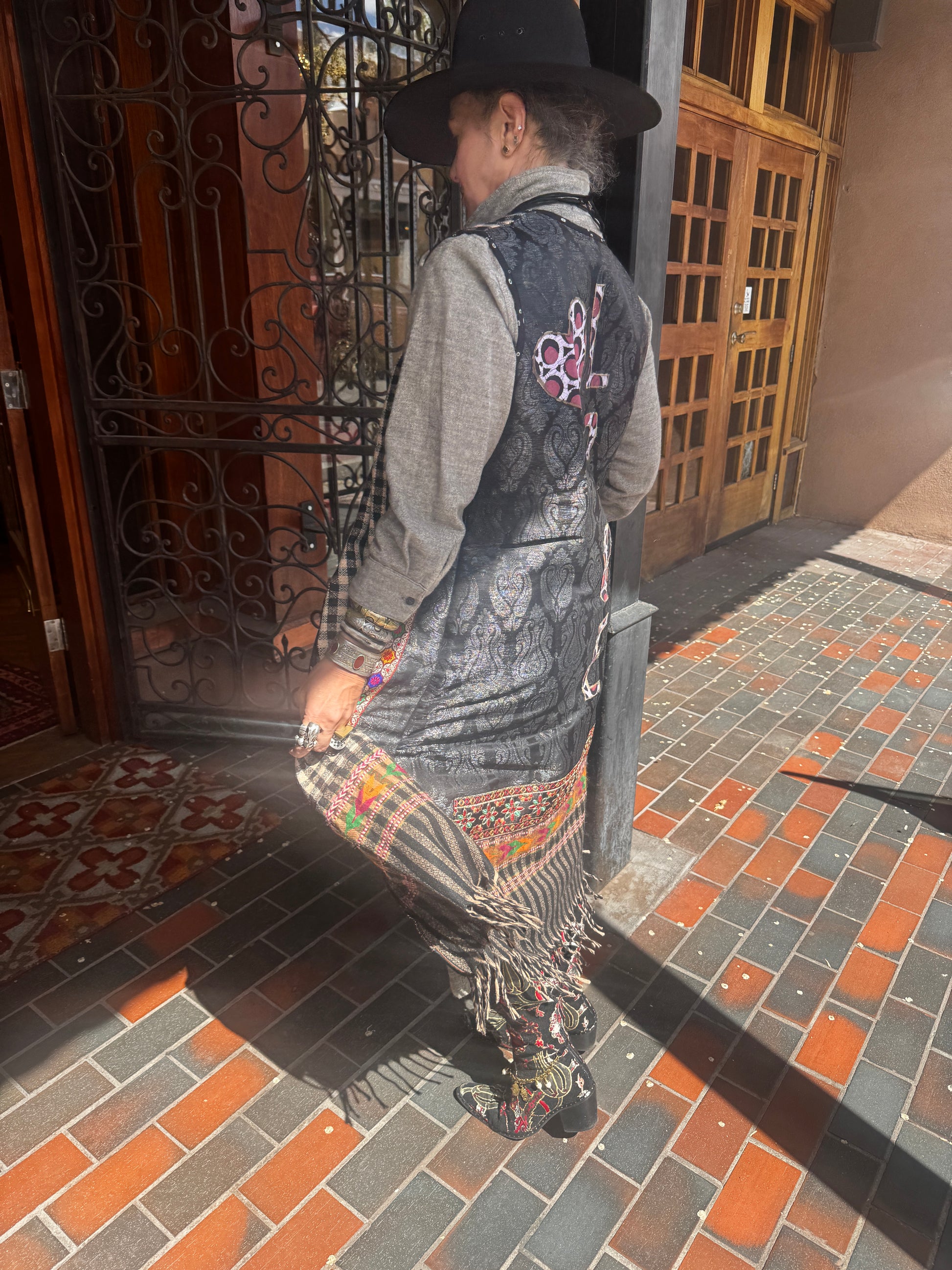 Love. Love. Love. All we need is LOVE! And as much as possible. We've got a crop of much anticipated Love Vests to offer our Serrahna love birds. These fun and cozy vests are made from upcycled gorgeous checkered sherpa wool that is soft like fleece and perfect for those with wool allergies. Sherpa wool is hypo-allergenic and soft to the touch. The fun checkered weave leads down to a patterned hem with fringe. Each vest has unique trim work with hand-blocked cotton and a coordinating upcycled brocade with LOVE applique in more color-pop cotton lettering. Two side vent cotton lined pockets. Button closure. Norma is wearing a Large size.