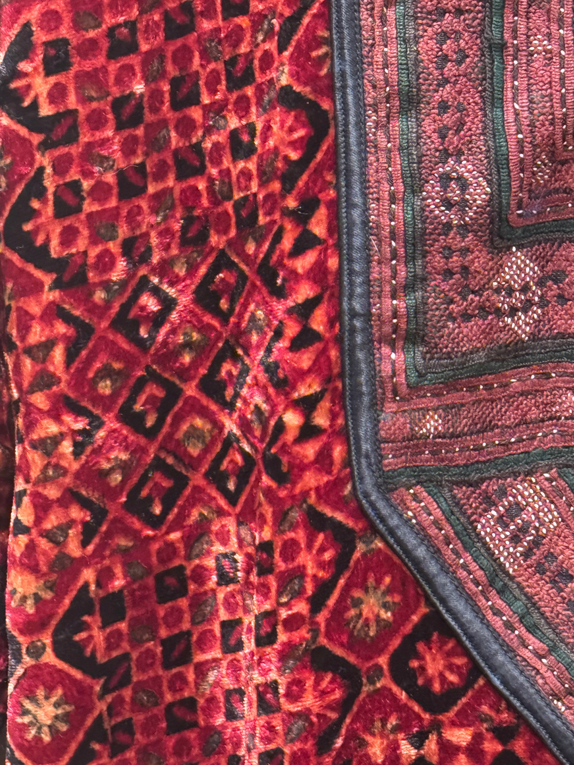 On both the front and back of the garment lies one of a kind, hand stitched appliqué by talented Afghan women - originally made for traditional dresses. The muted reds subtly stand out against the fire reds and oranges of the soft, luxurious velvet fabric.