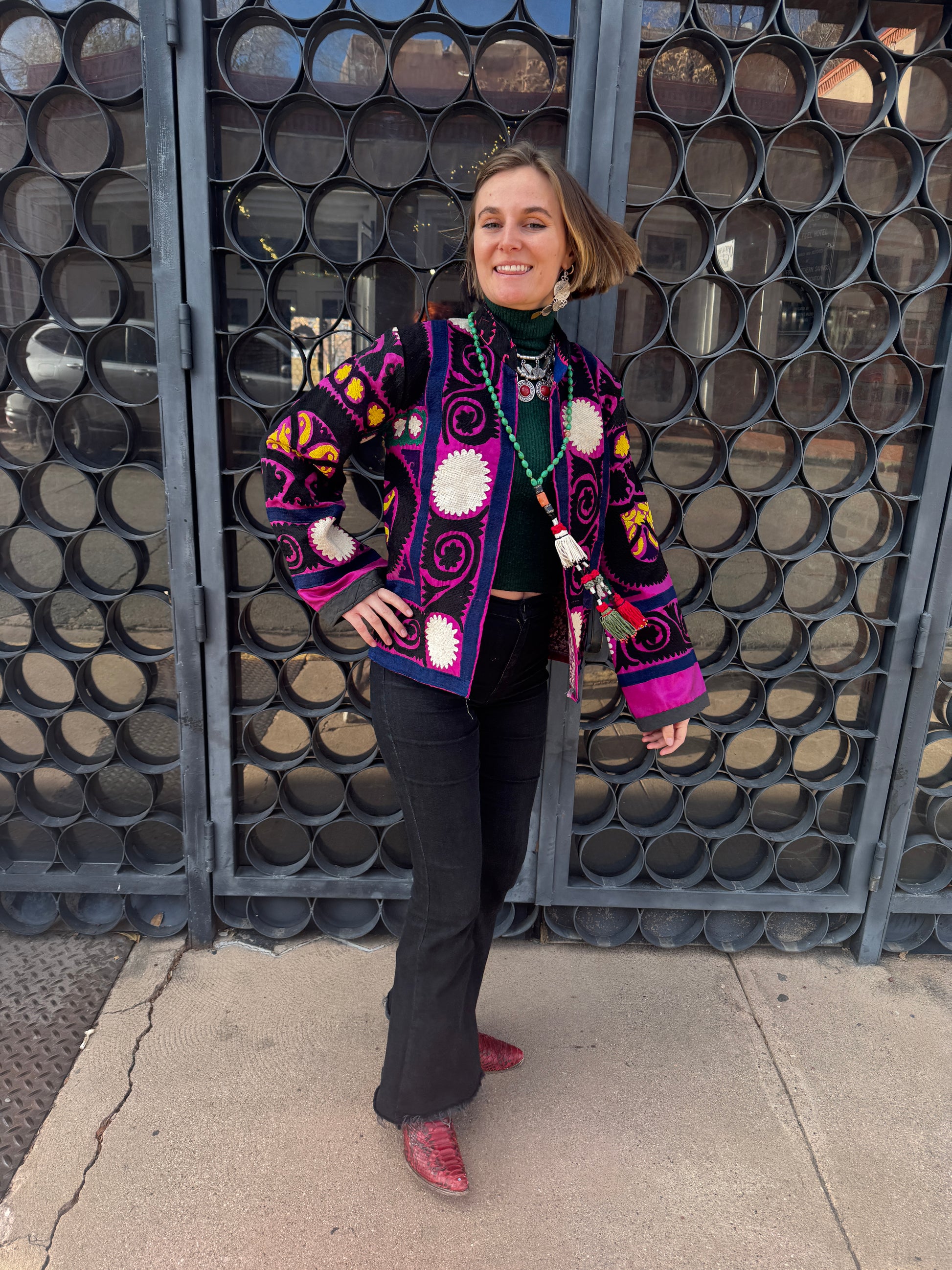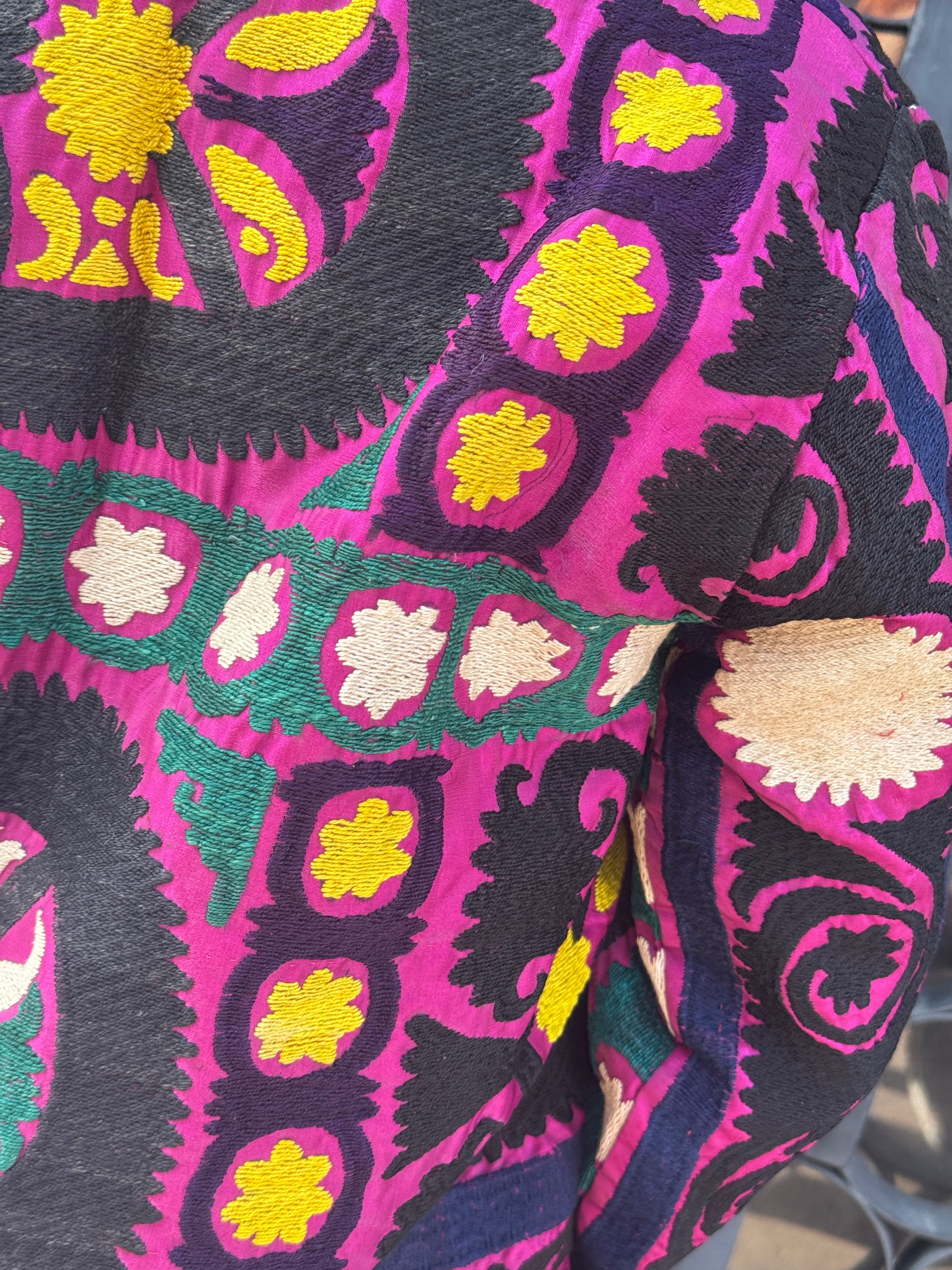 This vintage jacket is a BEAUTY! Rich Uzbek Suzani hand, embroidery in shades of black, cream, yellow, navy teal, dark purple, and deep jade, on a base of rich magenta silk. The colors really pop! The lining is a small pink and white cotton floral print. I approximate this age to be around 30 to 40 years old. It is in mint condition! Size small 40 inch chest. OOAK.