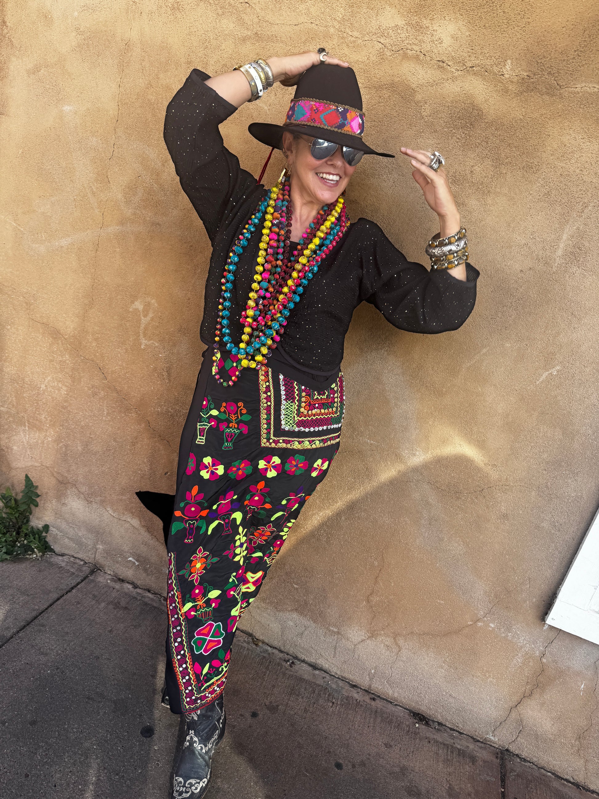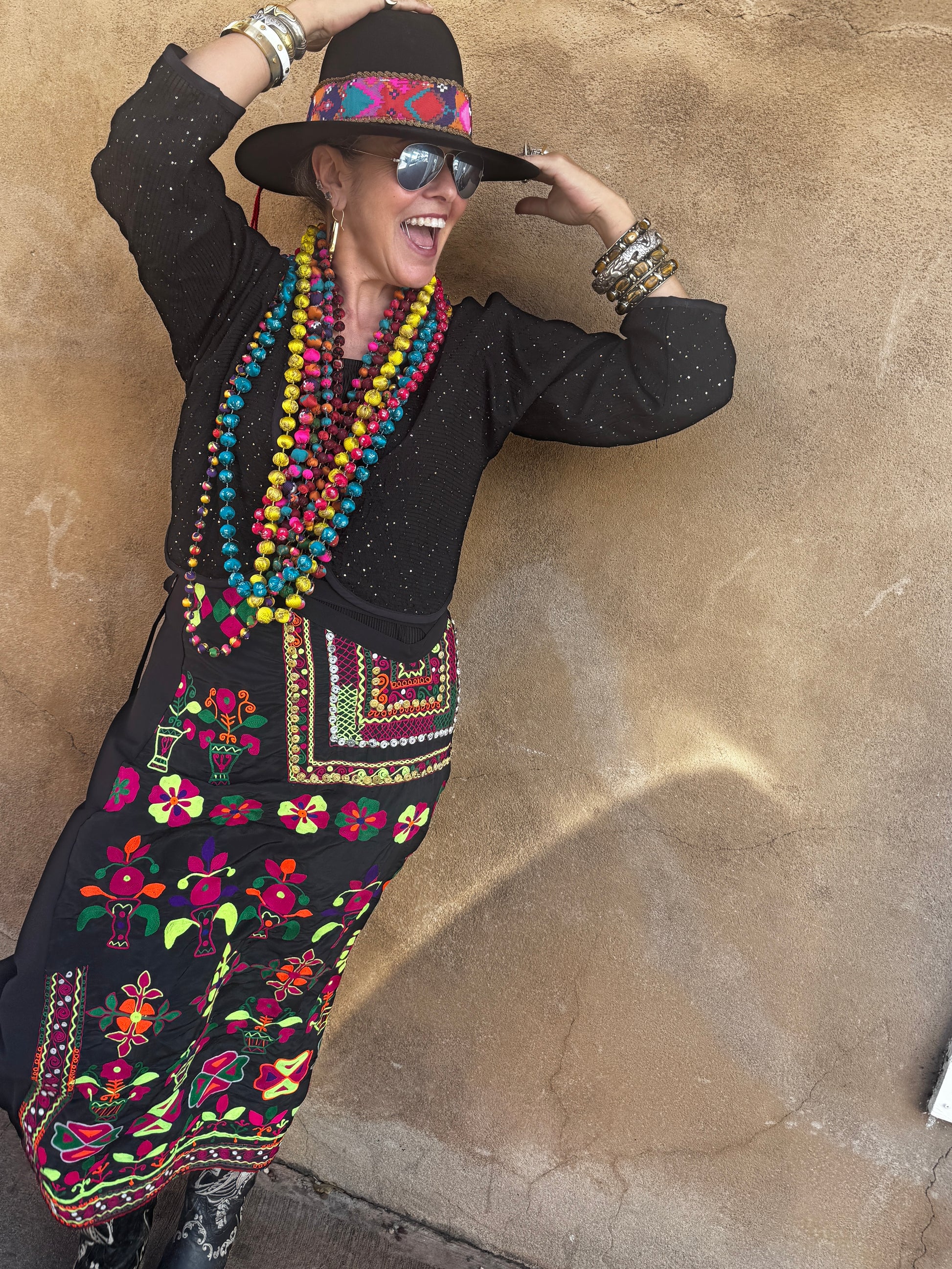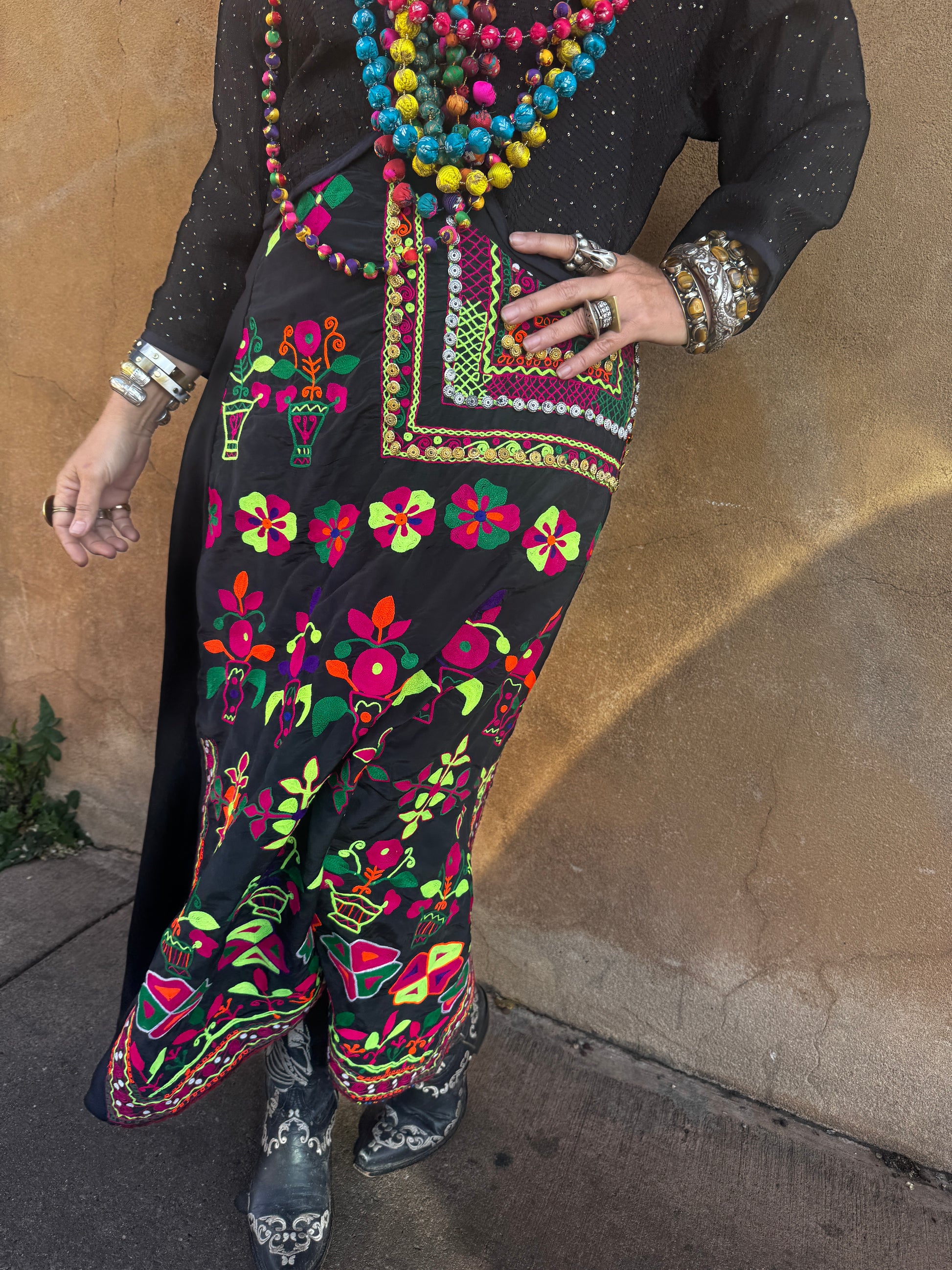 The Muy Linda wrap skirt is a jolt of happiness, style, and comfort. A lightweight black synsilk makes up the ease of the long wrap skirt. The fantastical and fun bouquets of brightly embroidered tribal flowers bloom allover! Bold neon'esque pinks, greens and yellows delight the eye. This fabulous upcycled embroidery hails from a vintage Kohistan textile. Some of the colorful flowers are sprouting from pots whilst others float in singular whimsy. A lovely matrix of vintage gold and silver buttons flatter at the waist. The cut of this skirt will flatter all who wear because of the thoughtful bias and cut of the textile. It falls at all of the right places complimenting a feminine silhouette. Size M/L because of the forgiving wrap sensibility. OOAK awesomeness!