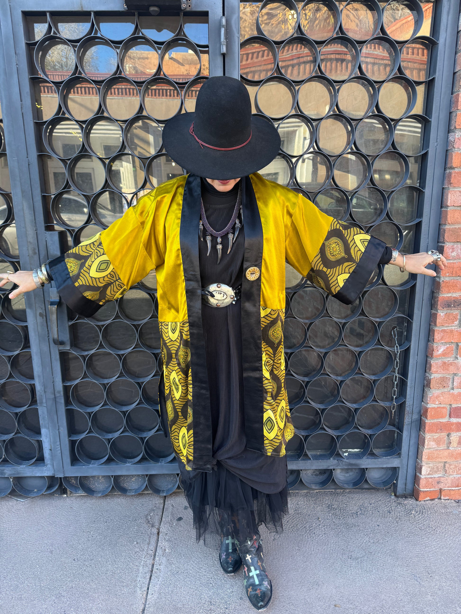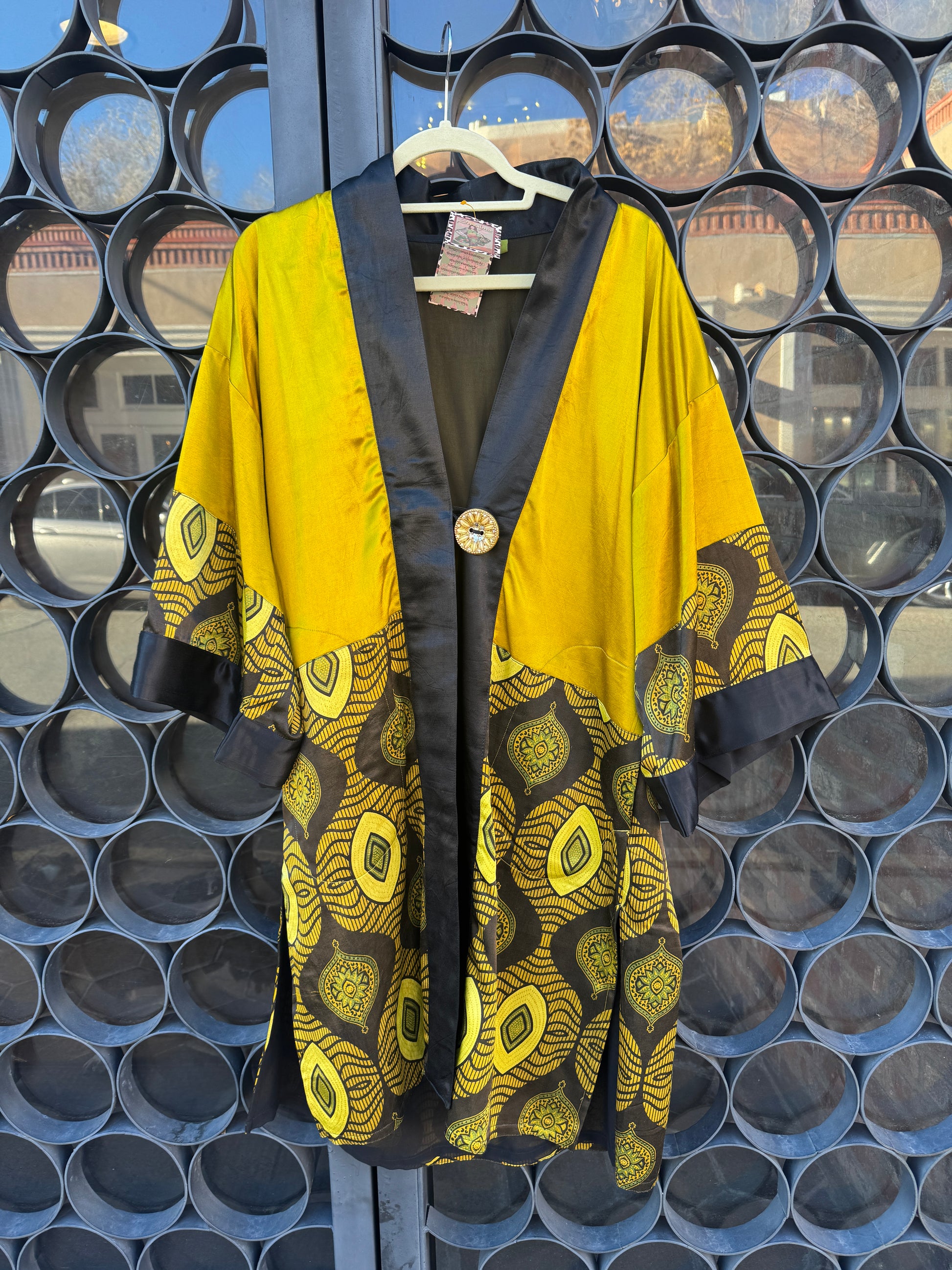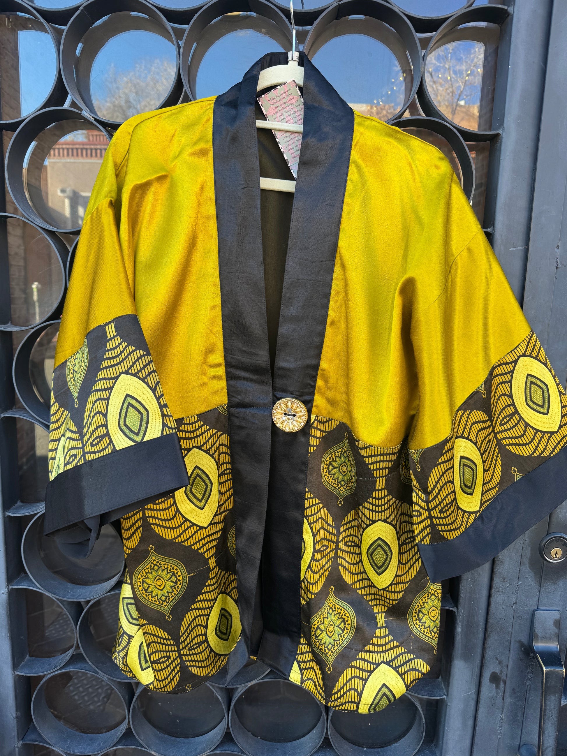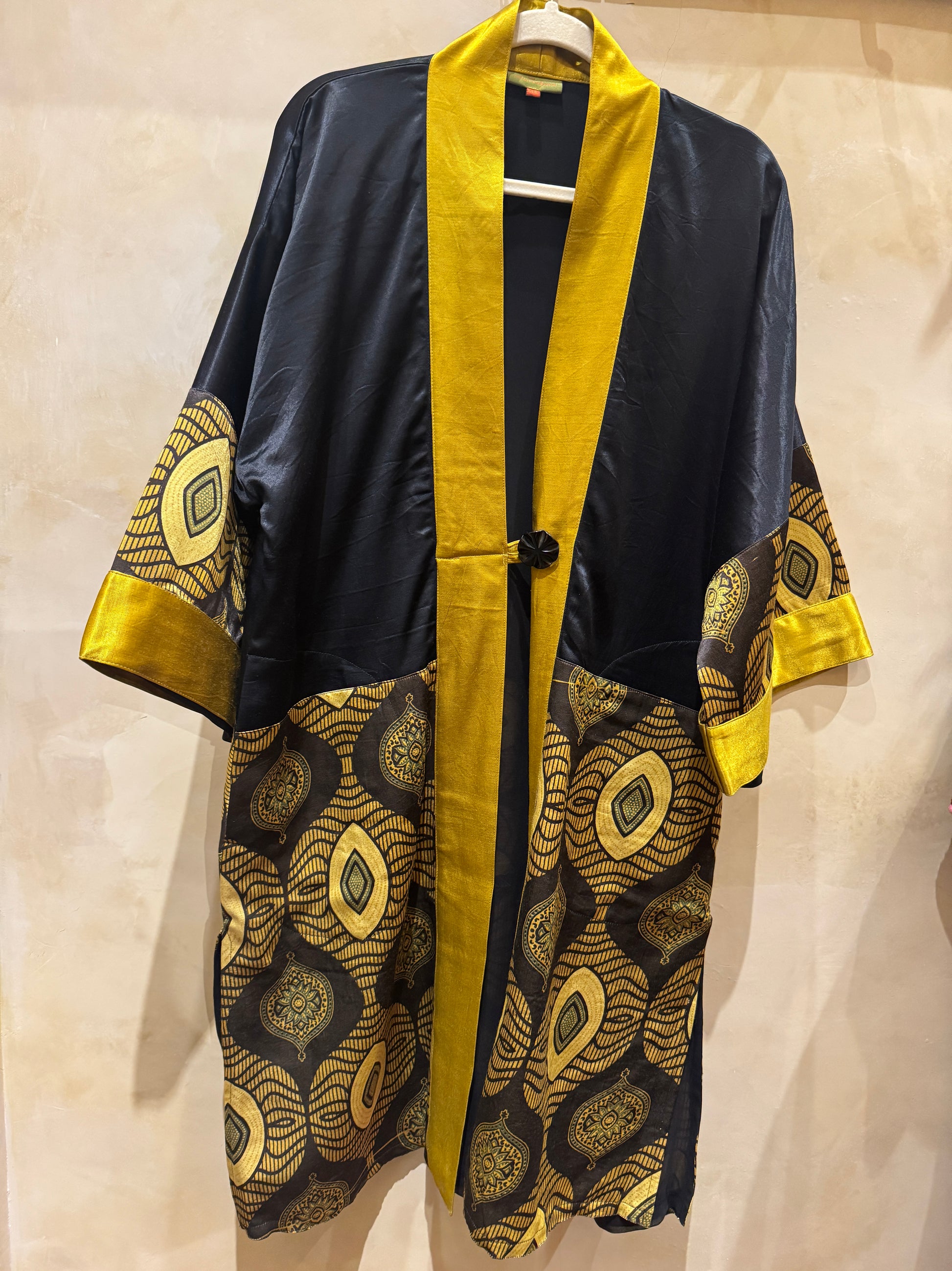 Sumptuous silky safari of color and design in this Nairobi Button Kimono! The color is a journey into the mystic! Striking silk golden chartreuse packs a powerful punch in both satiny weight and wow, set beside an elegant black silk lapel. The Nairobi queen sets full sail with the bottom portion of this fabulous kimono and 3/4 sleeve. Bold geometric golden ovals, antiqued sage floral lanterns, and squiggle waves that undulate the pattern. The chartreuse is found throughout the geometry of the print mixed with the deepest espresso that is rich and exotic. The kimono style is elegant and layers so brilliantly. Two side vent pockets. Single button closure. Fully lined in black georgette. OOAK. Two kimonos with the same color story only 1 is long and 1 is short, dimensions listed on variants below. The 2 other short kimonos have the same fabulous Nairobi print but 1 is in the golden chartreuse and the other in the only rich red garnet colored Norma is modeling, dimensions listed in variants below.