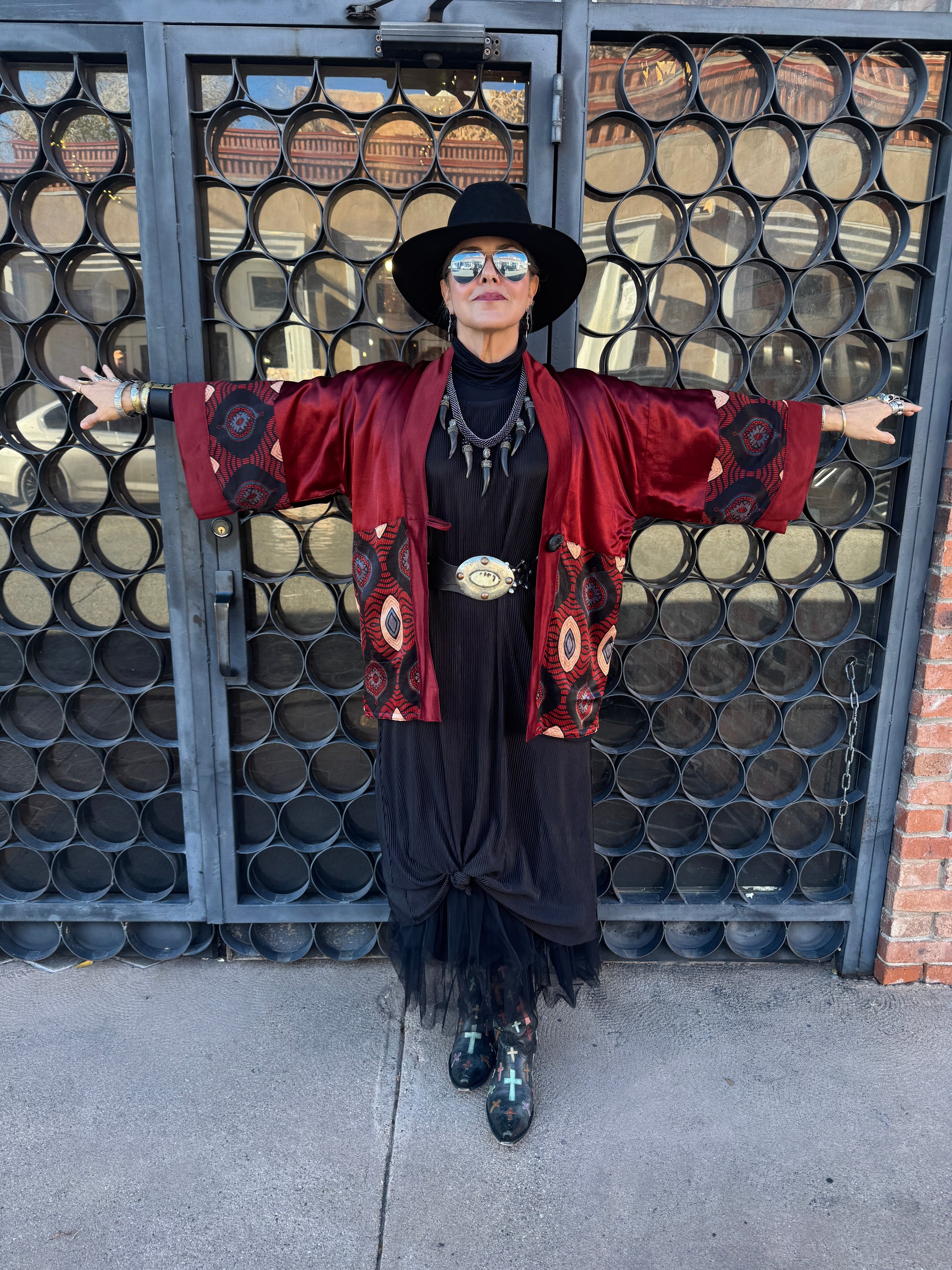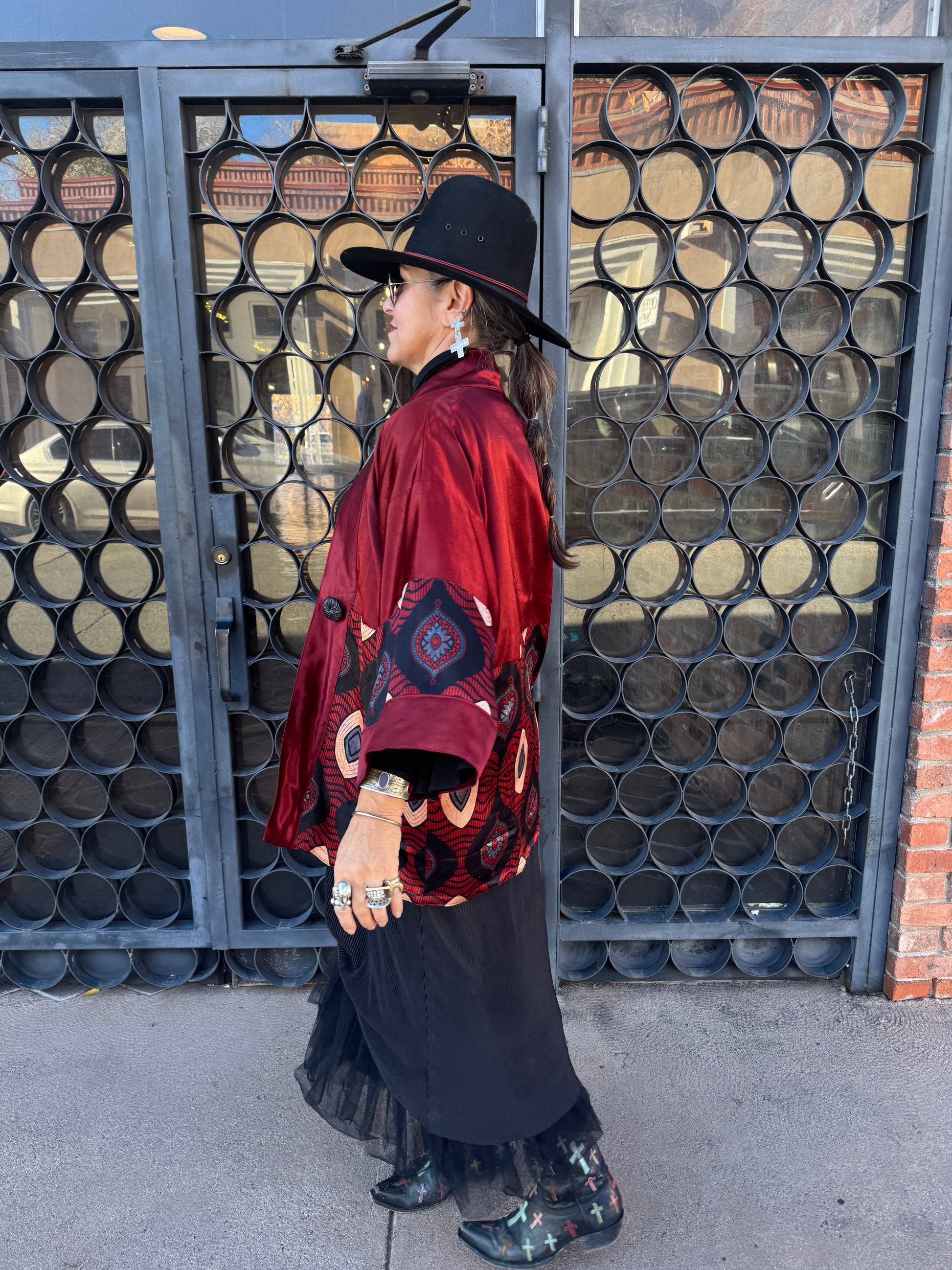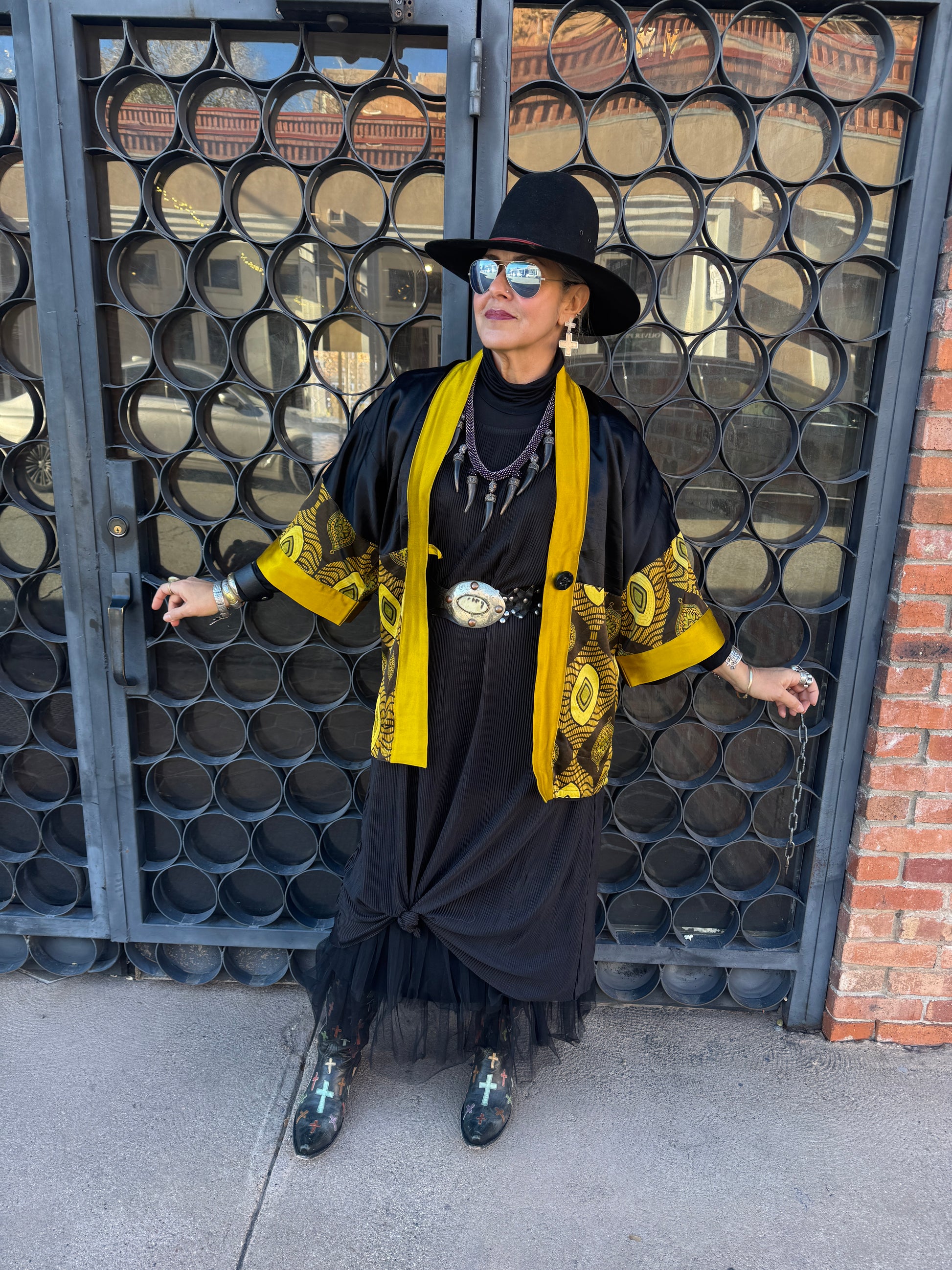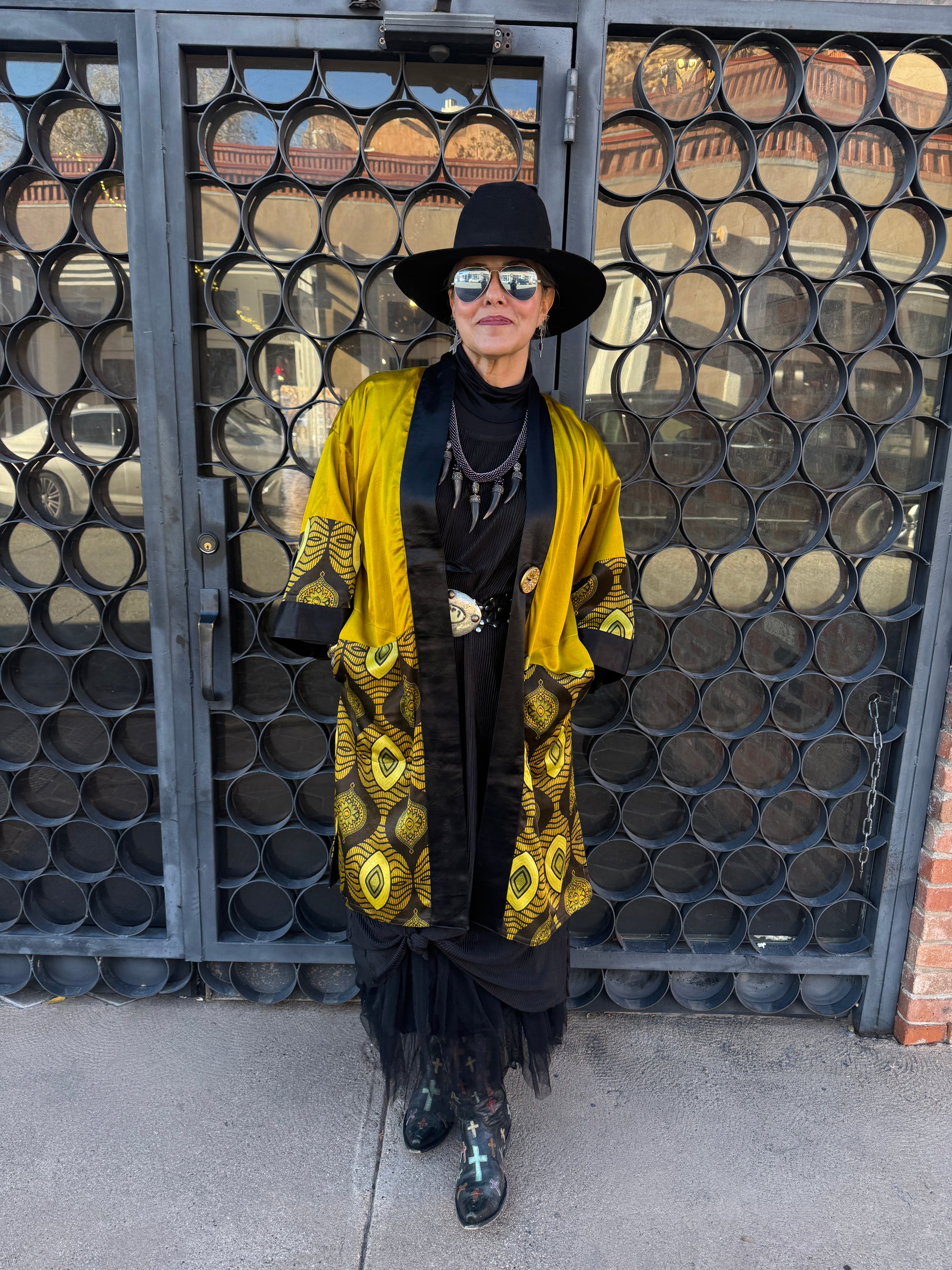 Sumptuous silky safari of color and design in this Nairobi Button Kimono! The color is a journey into the mystic! Striking silk golden chartreuse packs a powerful punch in both satiny weight and wow, set beside an elegant black silk lapel. The Nairobi queen sets full sail with the bottom portion of this fabulous kimono and 3/4 sleeve. Bold geometric golden ovals, antiqued sage floral lanterns, and squiggle waves that undulate the pattern. The chartreuse is found throughout the geometry of the print mixed with the deepest espresso that is rich and exotic. The kimono style is elegant and layers so brilliantly. Two side vent pockets. Single button closure. Fully lined in black georgette. OOAK. Two kimonos with the same color story only 1 is long and 1 is short, dimensions listed on variants below. The 2 other short kimonos have the same fabulous Nairobi print but 1 is in the golden chartreuse and the other in the only rich red garnet colored Norma is modeling, dimensions listed in variants below.