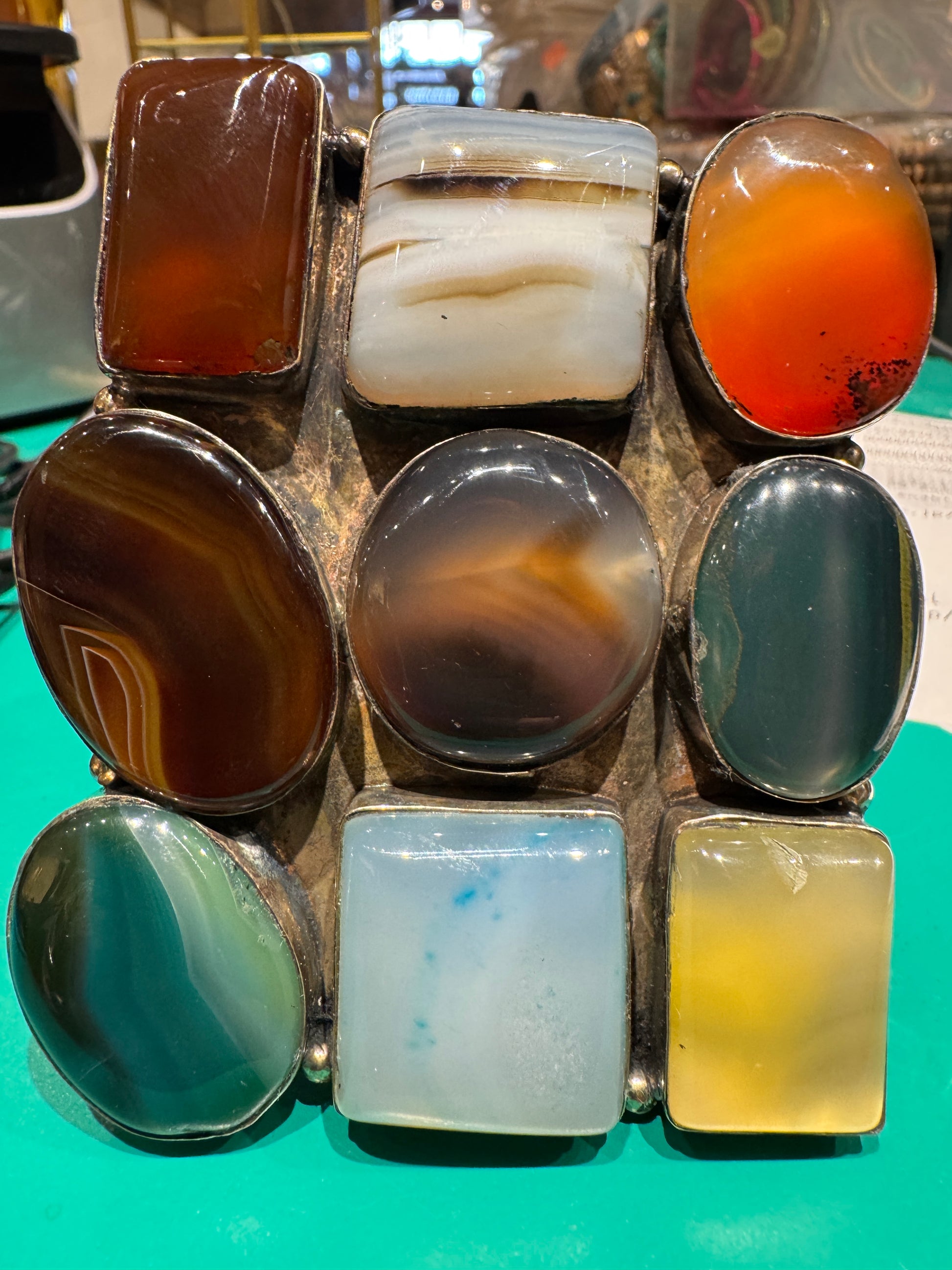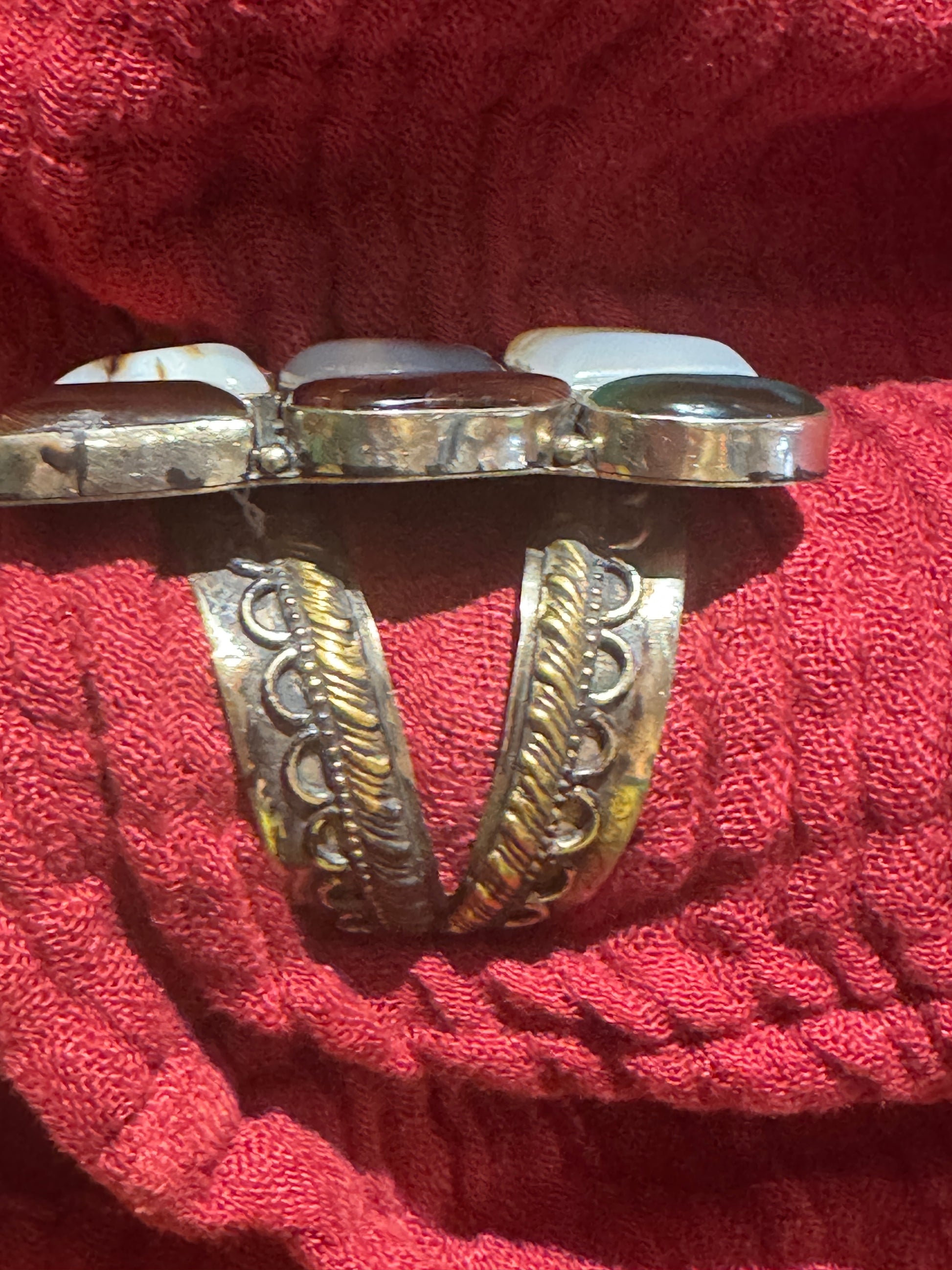 Tic tac toe of coolness in this awesome 9 stone matrix jumbo cuff! Hardcore tribal mixed metal ornate with half moons, gilded dots and tides that anchors this fabulous cuff. The gemstone matrix of round, square and oval cabochons of onyx, agate, carnelian and chalcedony is the pièce de rèsistance! This handsome and substantial piece is uni-sex and will fit the large-boned guys and gals. 2.5” x 3” with a significant weight.