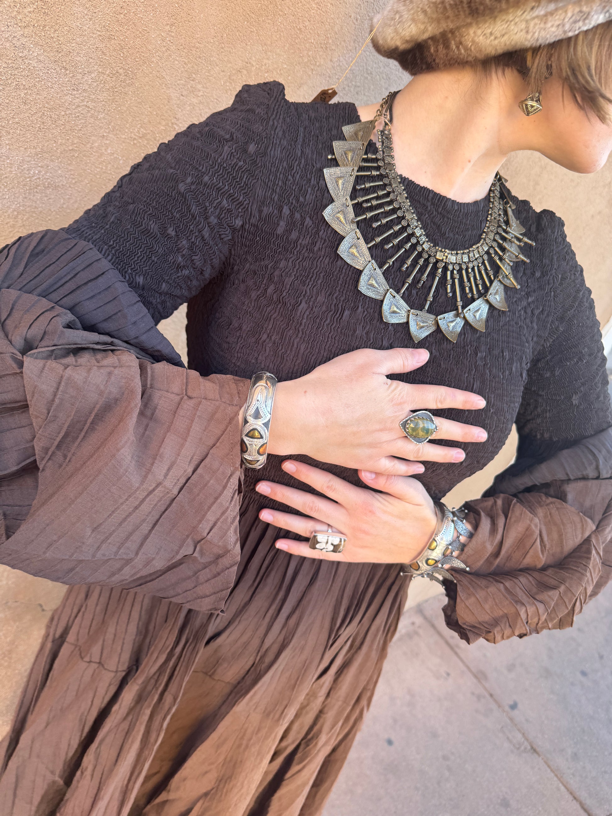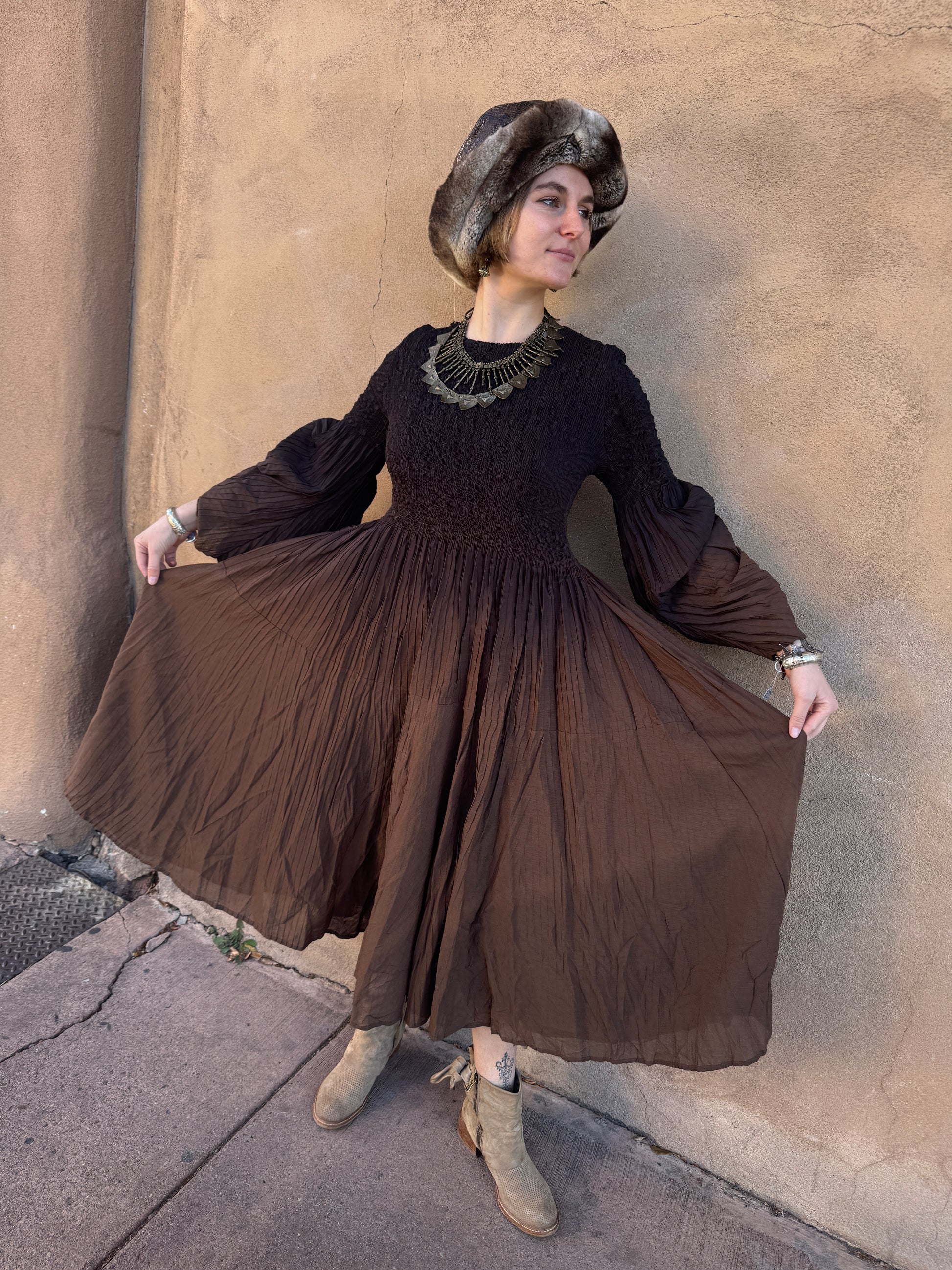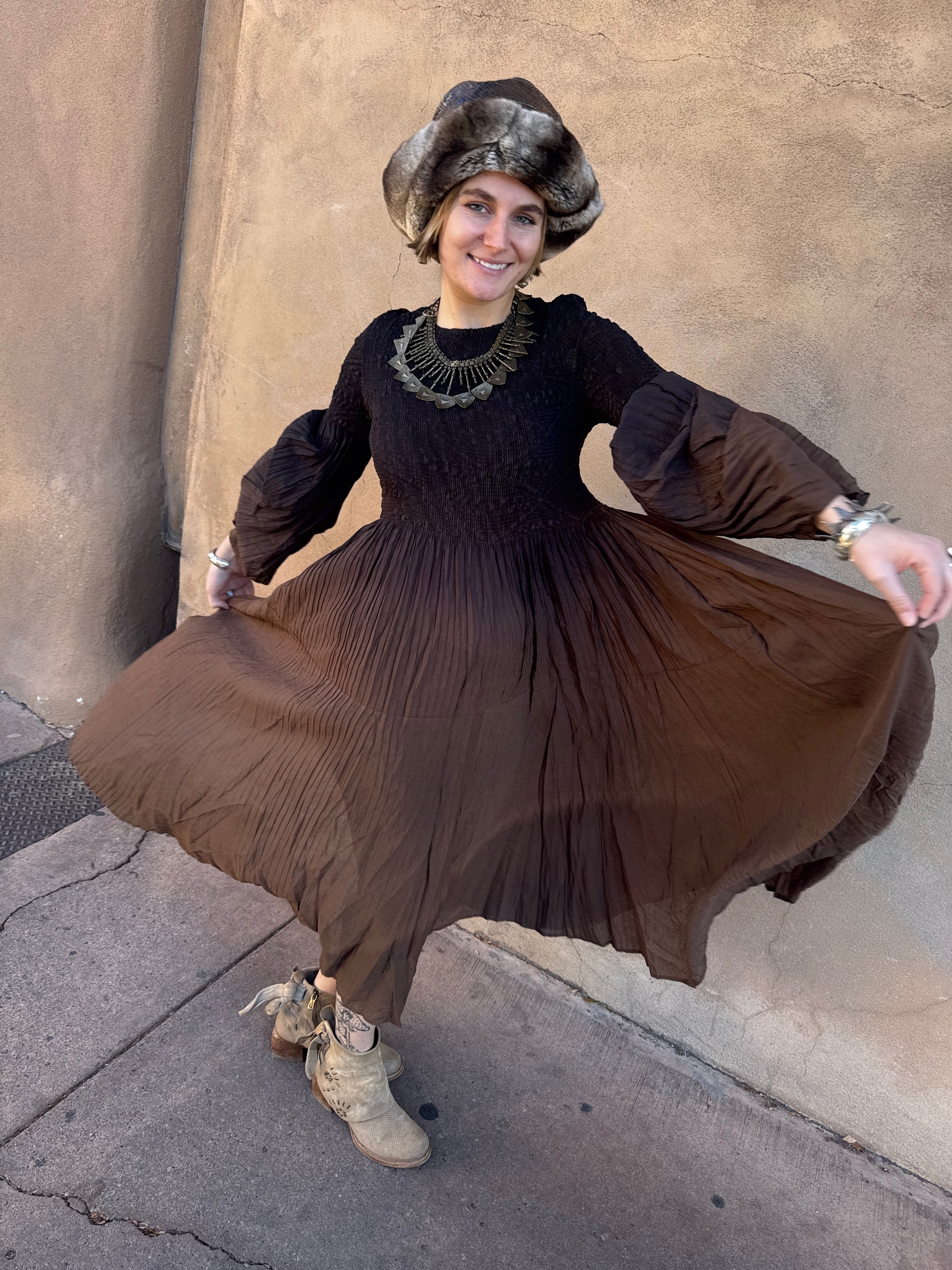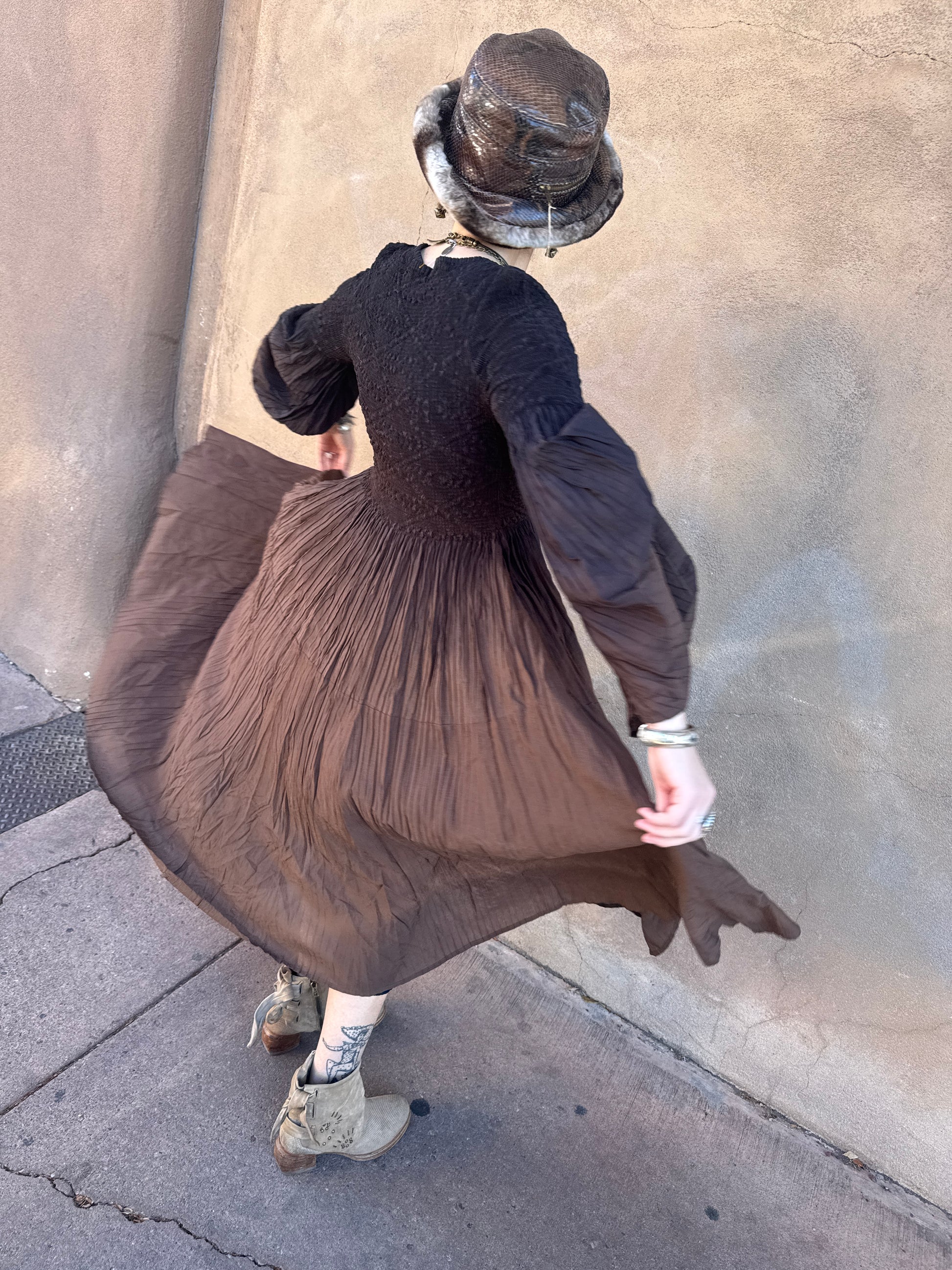 The ruched / accordion style crushed fabric has the capacity to comfortably stretch from a size XS to a medium. Towards the top, the garment starts out with a deep espresso brown color then effortlessly melts into lighter, gorgeous shades of creamy browns and bronzes.