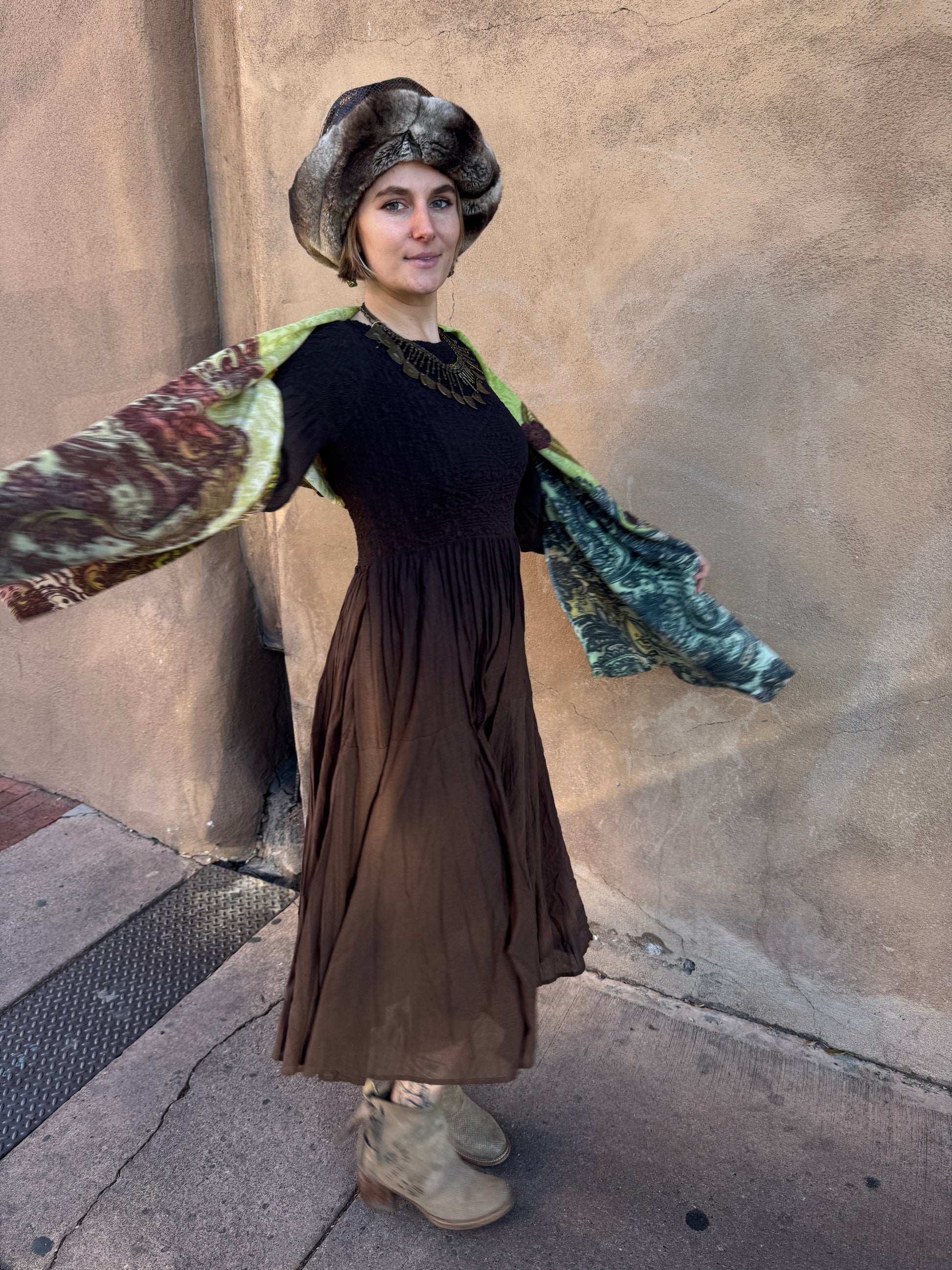 This look is styled with our real chinchilla fur / snake skin bucket hat, Turkish and Tuareg mixed metal bracelets, necklaces, and earrings, as well as a paisley pashmina shawl.