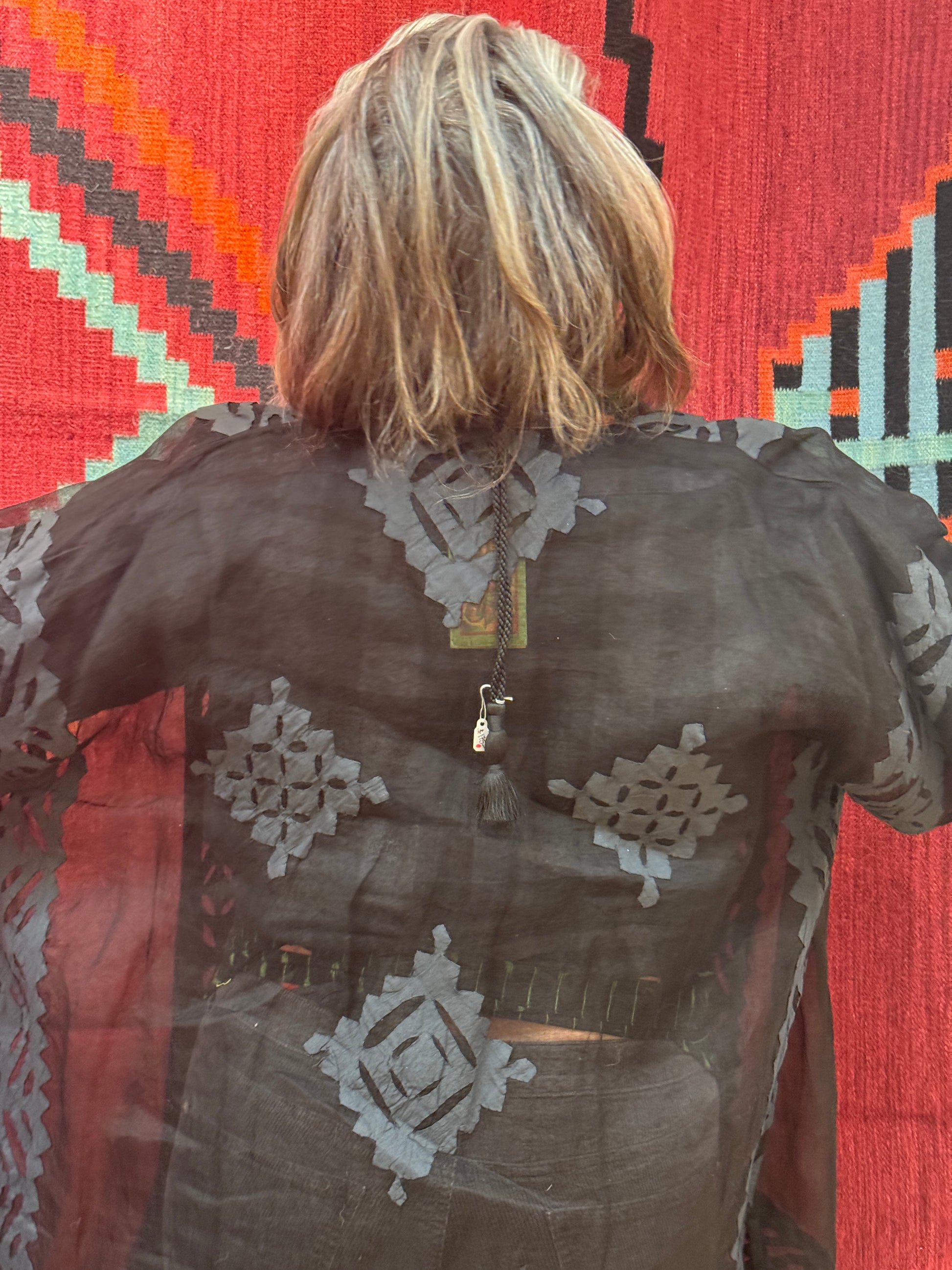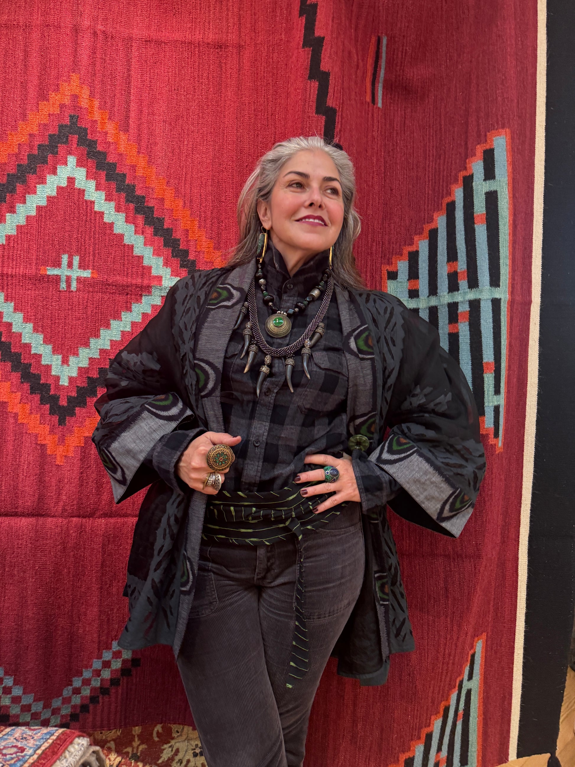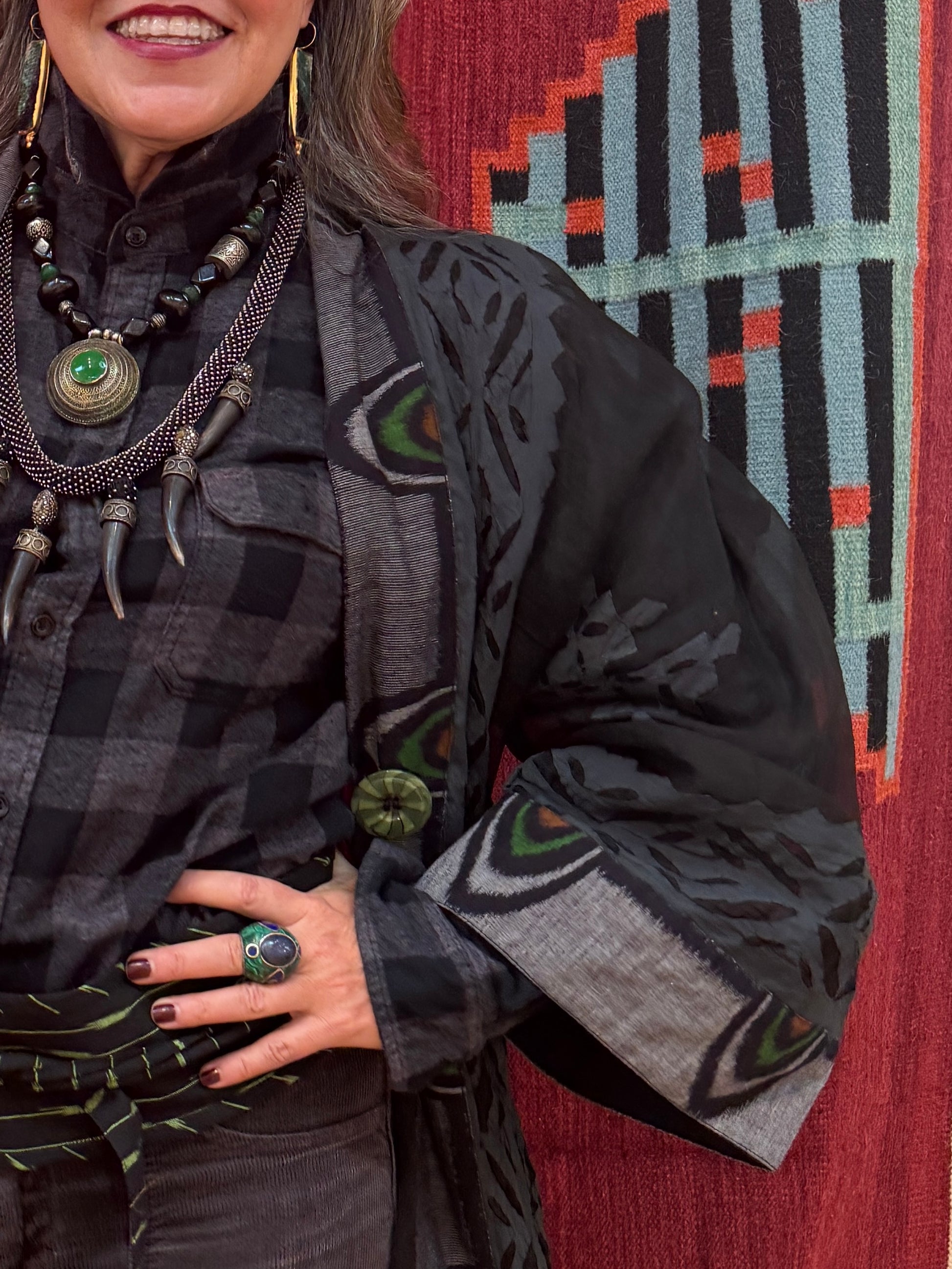 A stunning combination of black organza, appliquè and ikat in this Button Kimono fit for a Maharani. The main body of this kimono is made of sheer gauzy black organza with a beautifully placed black cotton appliquè along lapel, cuffs, sleeves and back. Striking wide swaths of black and white/grey ikat with peaks of green and curry at the cuffs and lapel. Single button closure with a large green resin candy button. This beauty is a size XXL with a 56” chest. No pockets, 3/4 sleeve. Norma is also wearing our reversible belt and Afghan pendant necklace with the hand-crocheted “claw” sparkle necklace linked below.