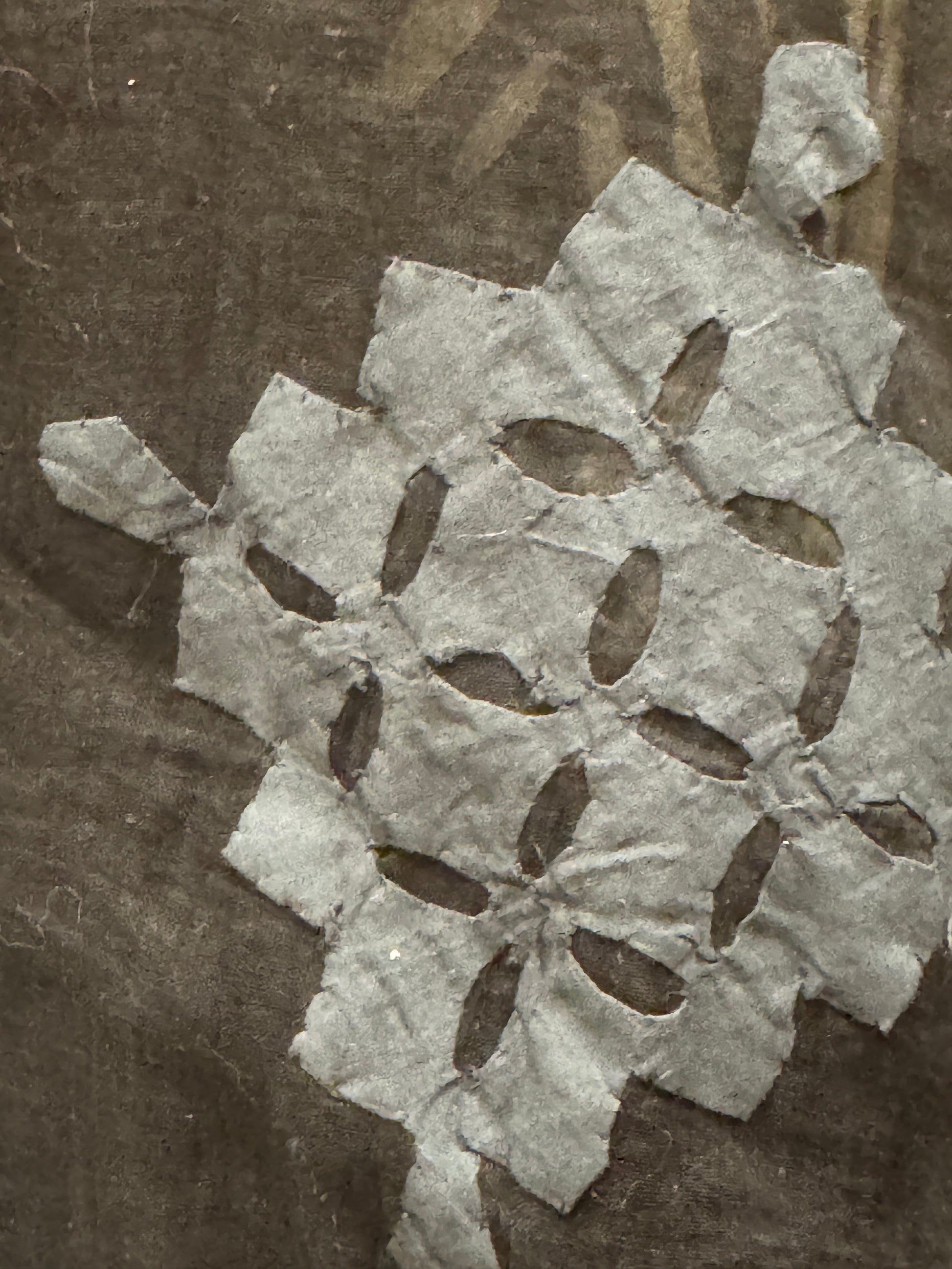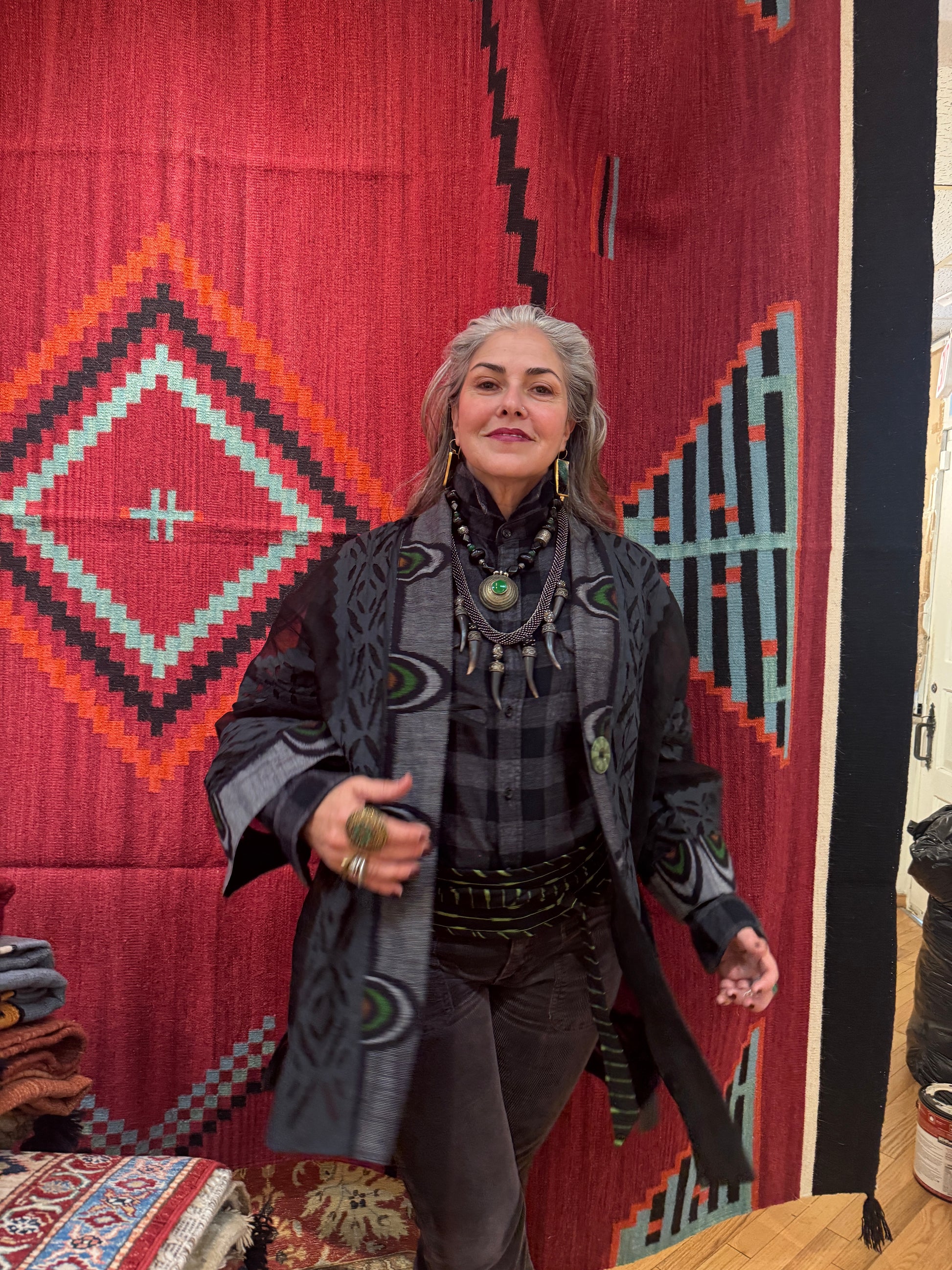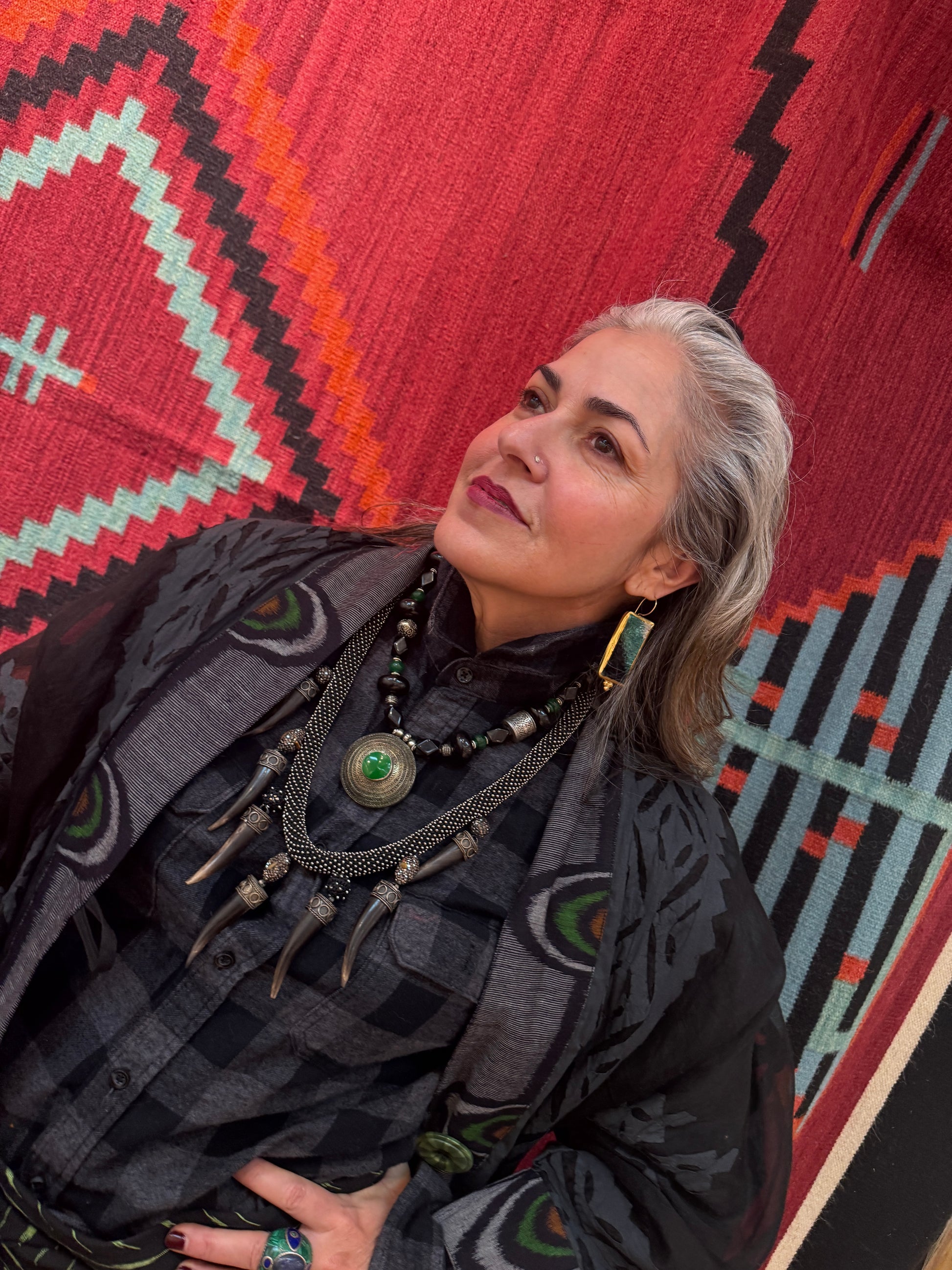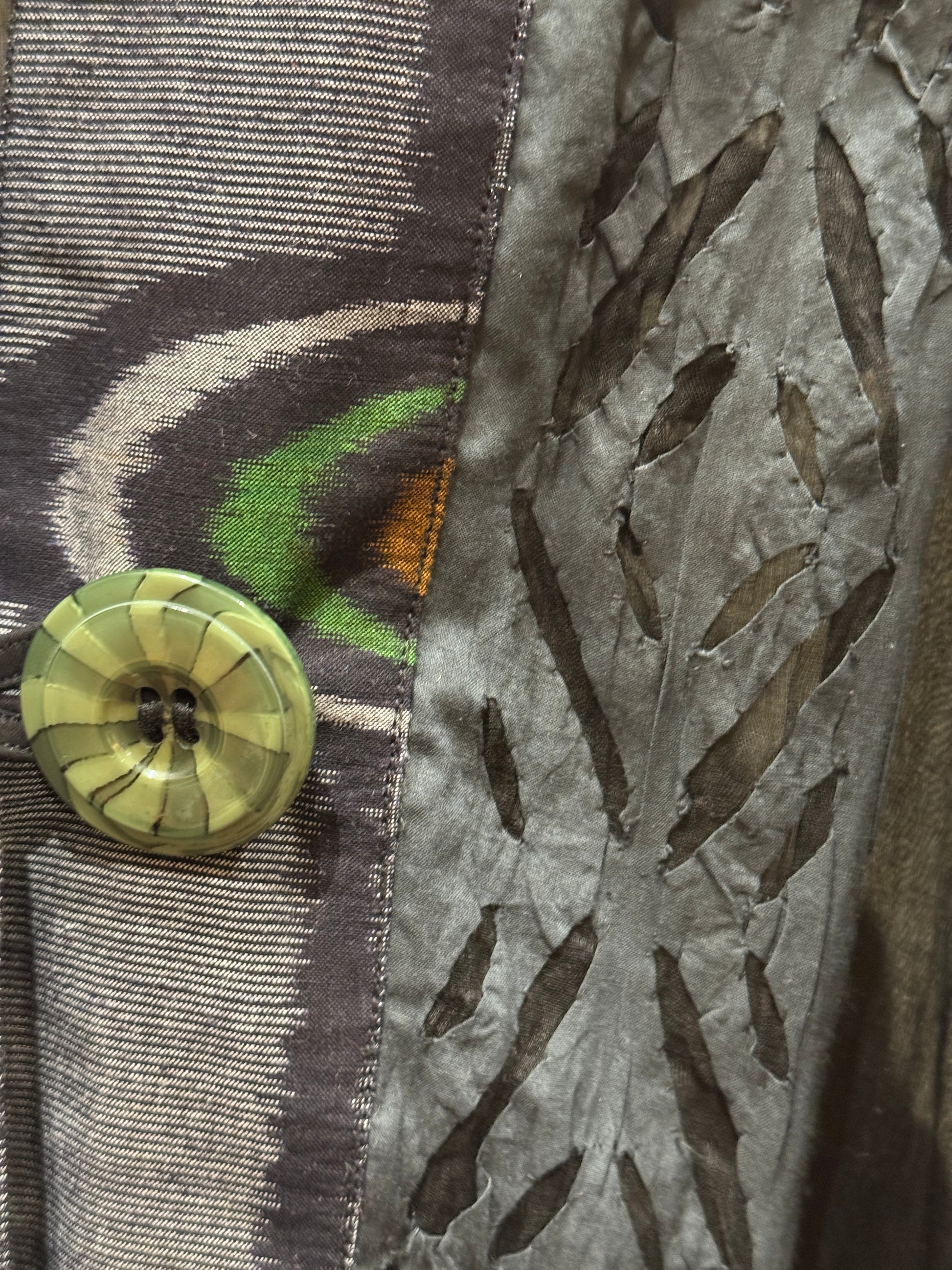 A stunning combination of black organza, appliquè and ikat in this Button Kimono fit for a Maharani. The main body of this kimono is made of sheer gauzy black organza with a beautifully placed black cotton appliquè along lapel, cuffs, sleeves and back. Striking wide swaths of black and white/grey ikat with peaks of green and curry at the cuffs and lapel. Single button closure with a large green resin candy button. This beauty is a size XXL with a 56” chest. No pockets, 3/4 sleeve. Norma is also wearing our reversible belt and Afghan pendant necklace with the hand-crocheted “claw” sparkle necklace linked below.