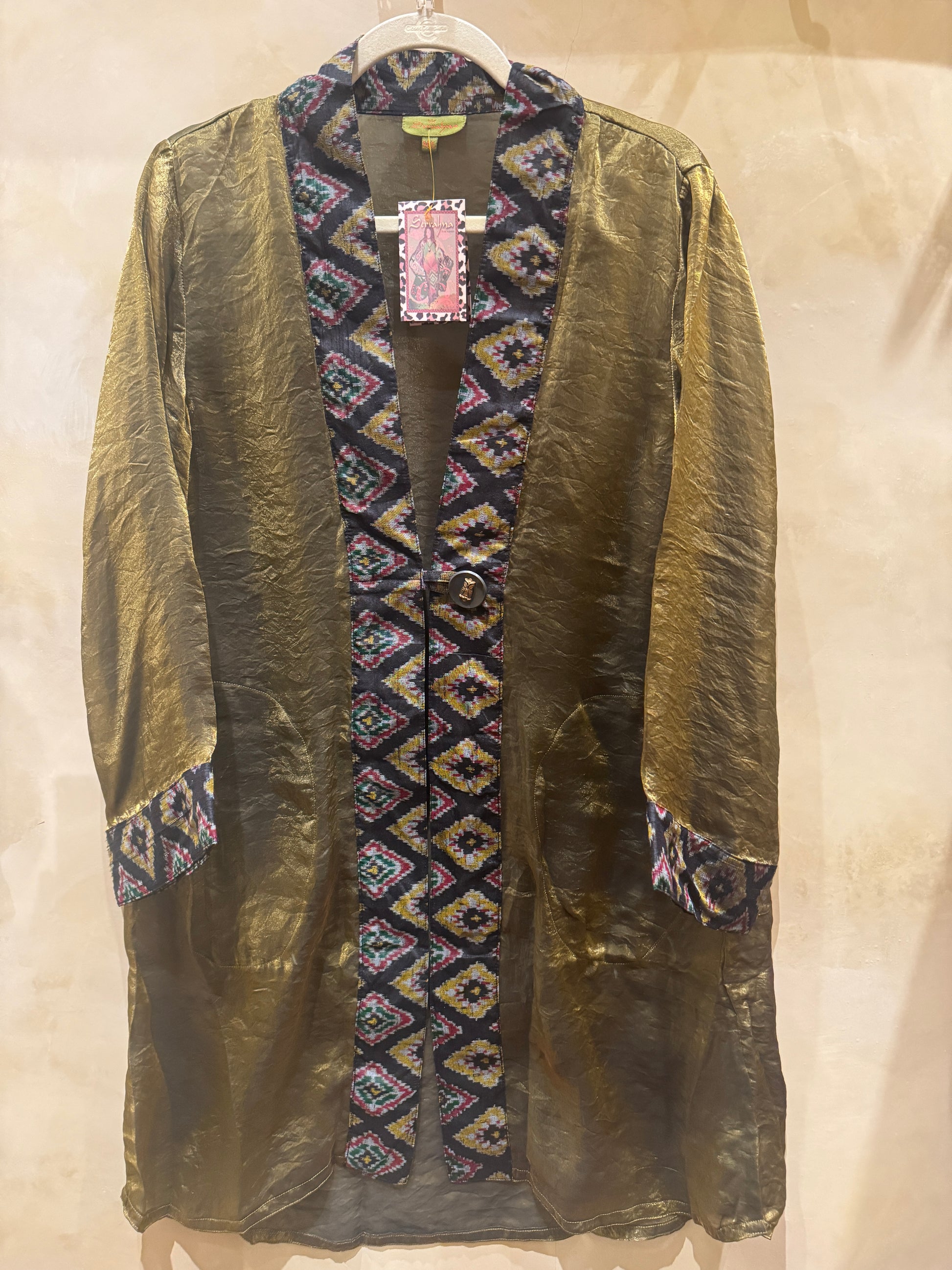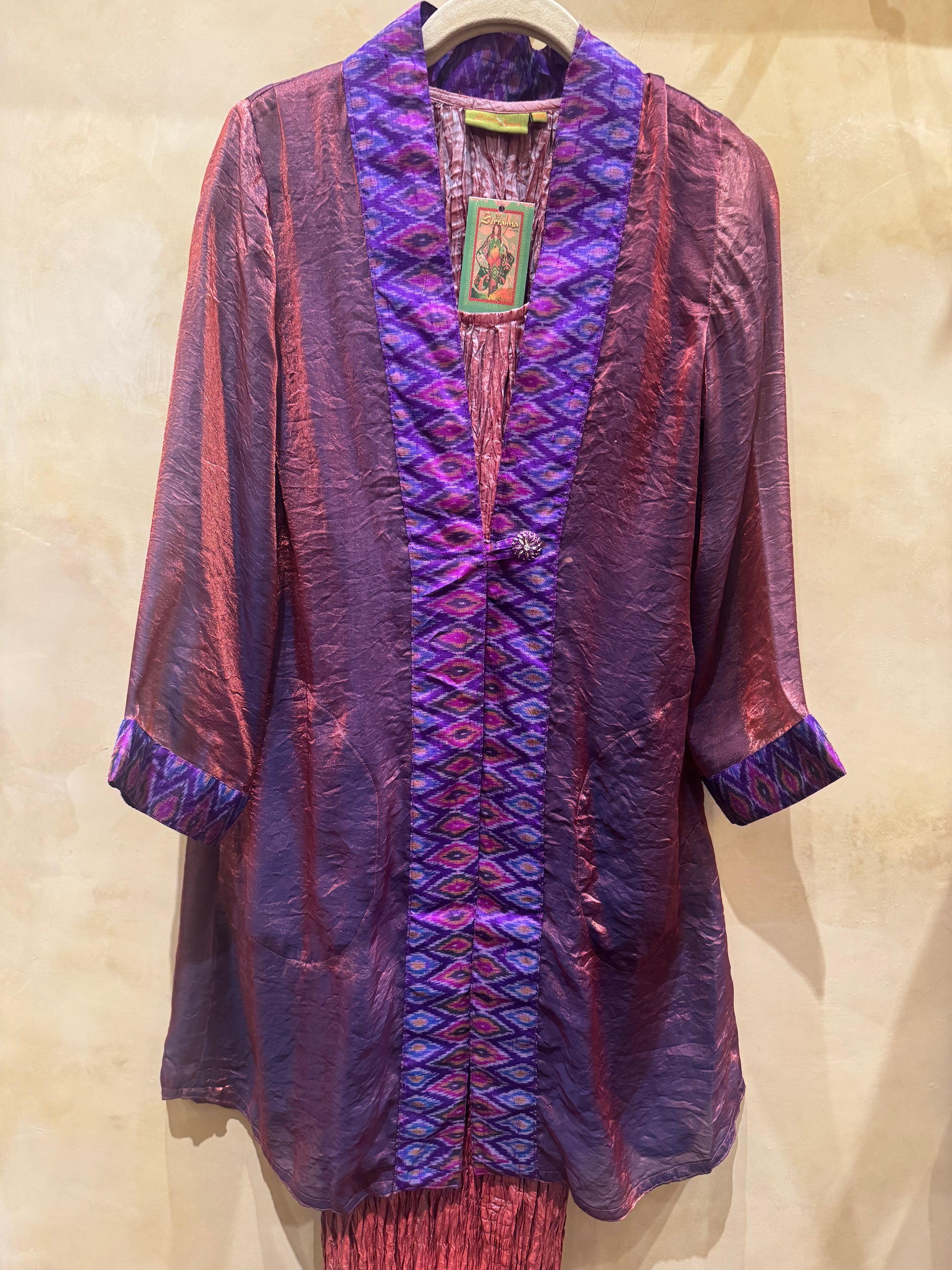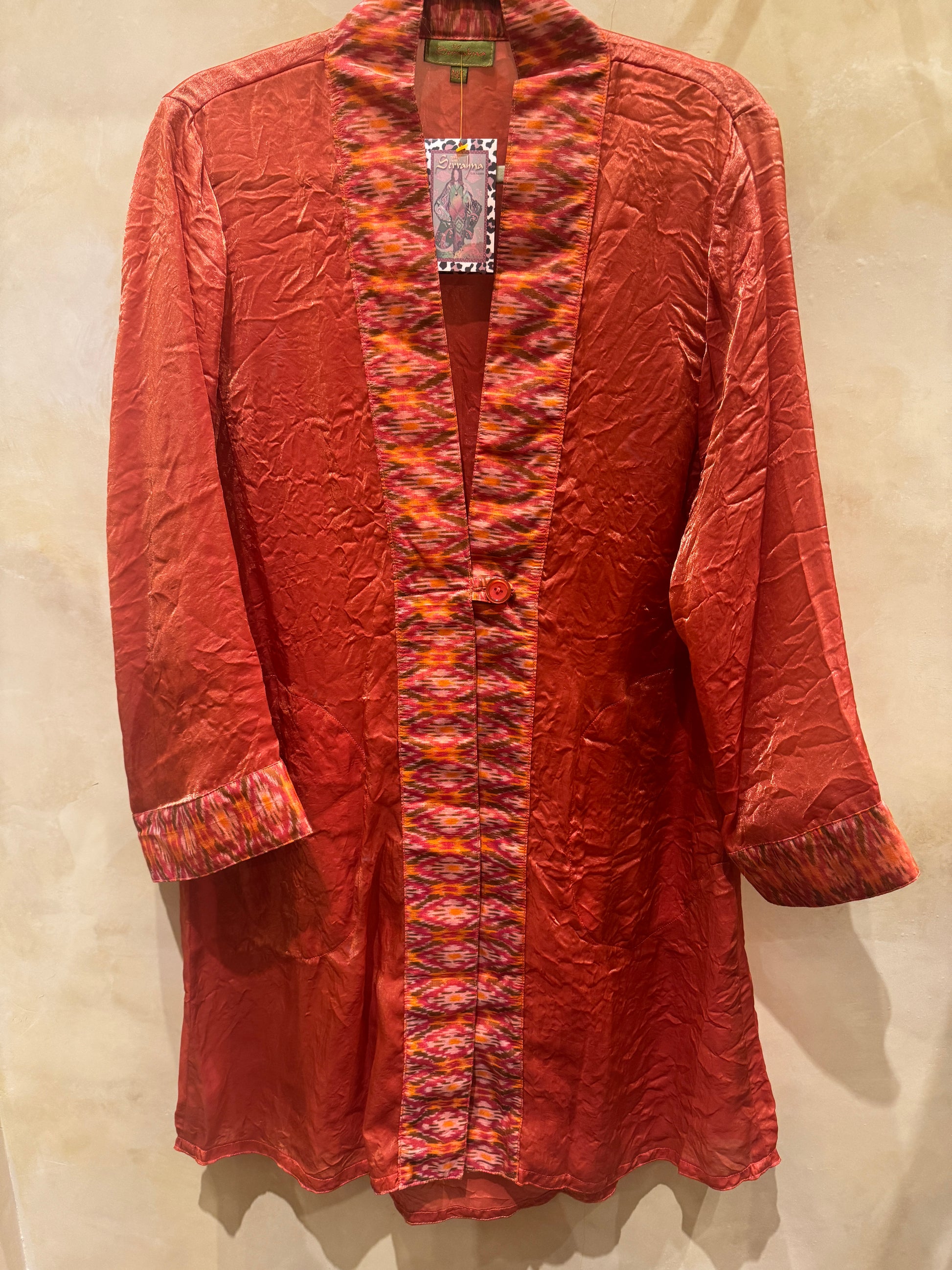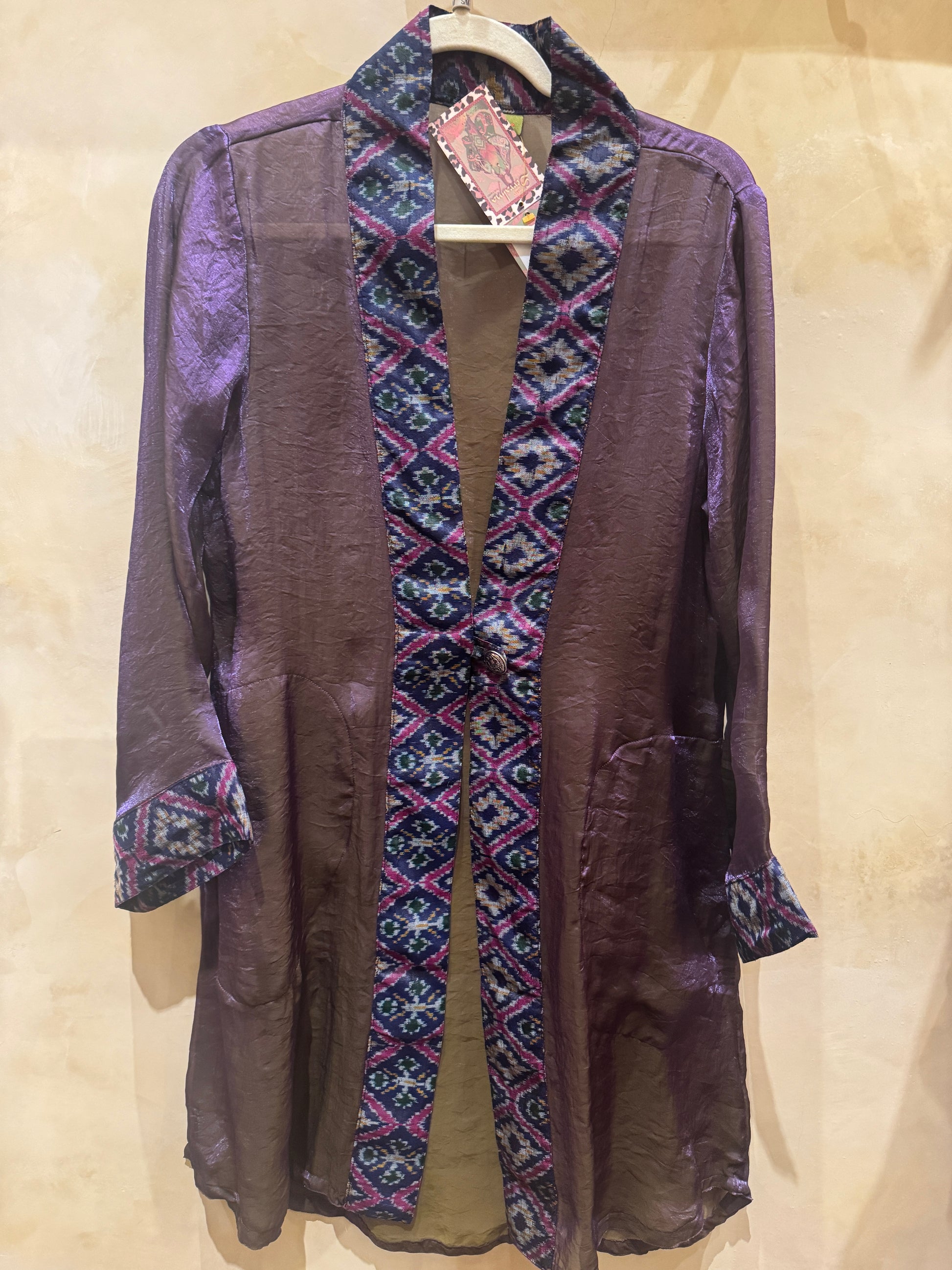 The trim is 100% silk ikat with colors that provide extra sophistication. Two roomy pockets and a chunky button adorn this beautiful piece as well. Many dynamic colors to choose from below.