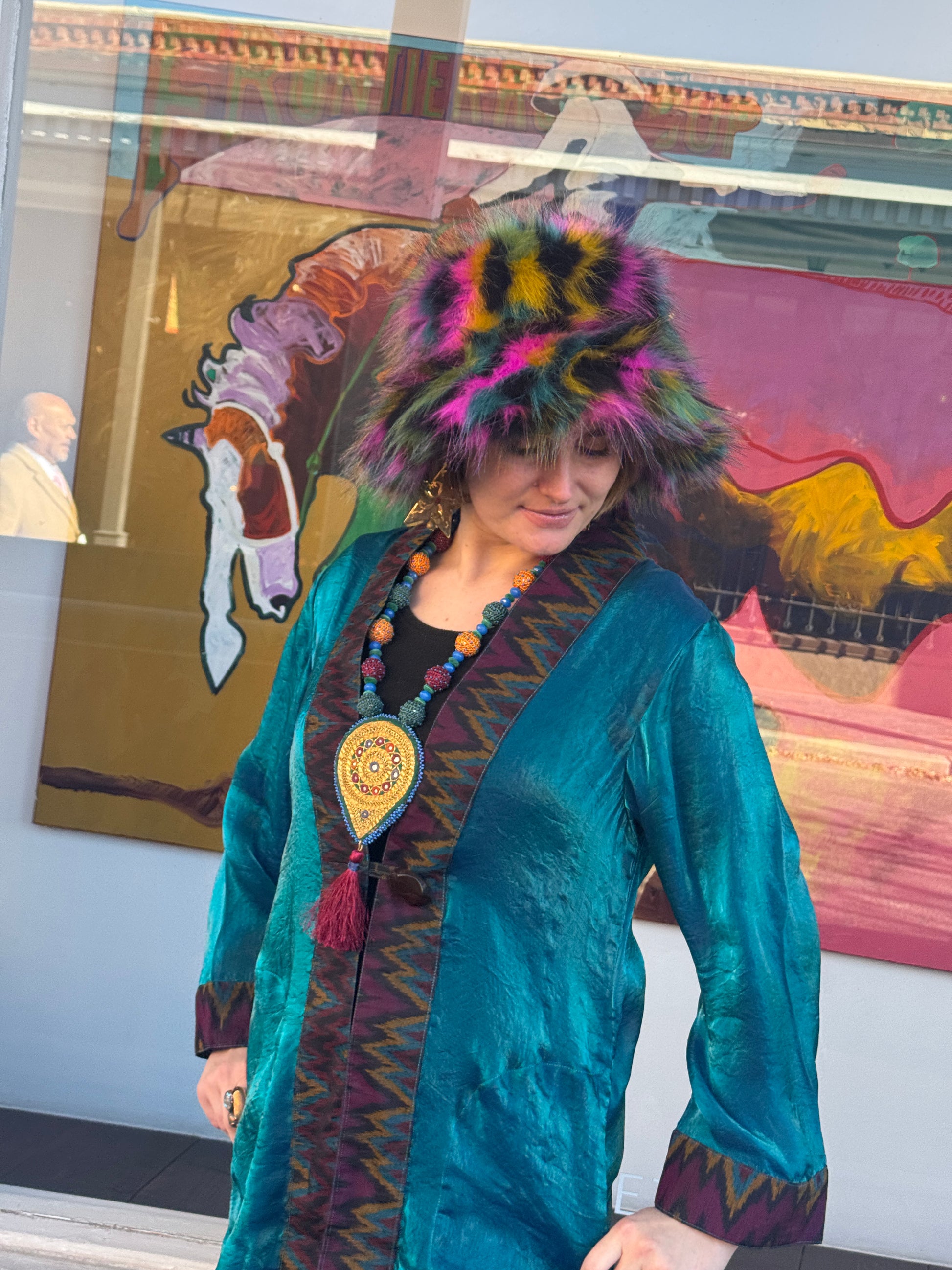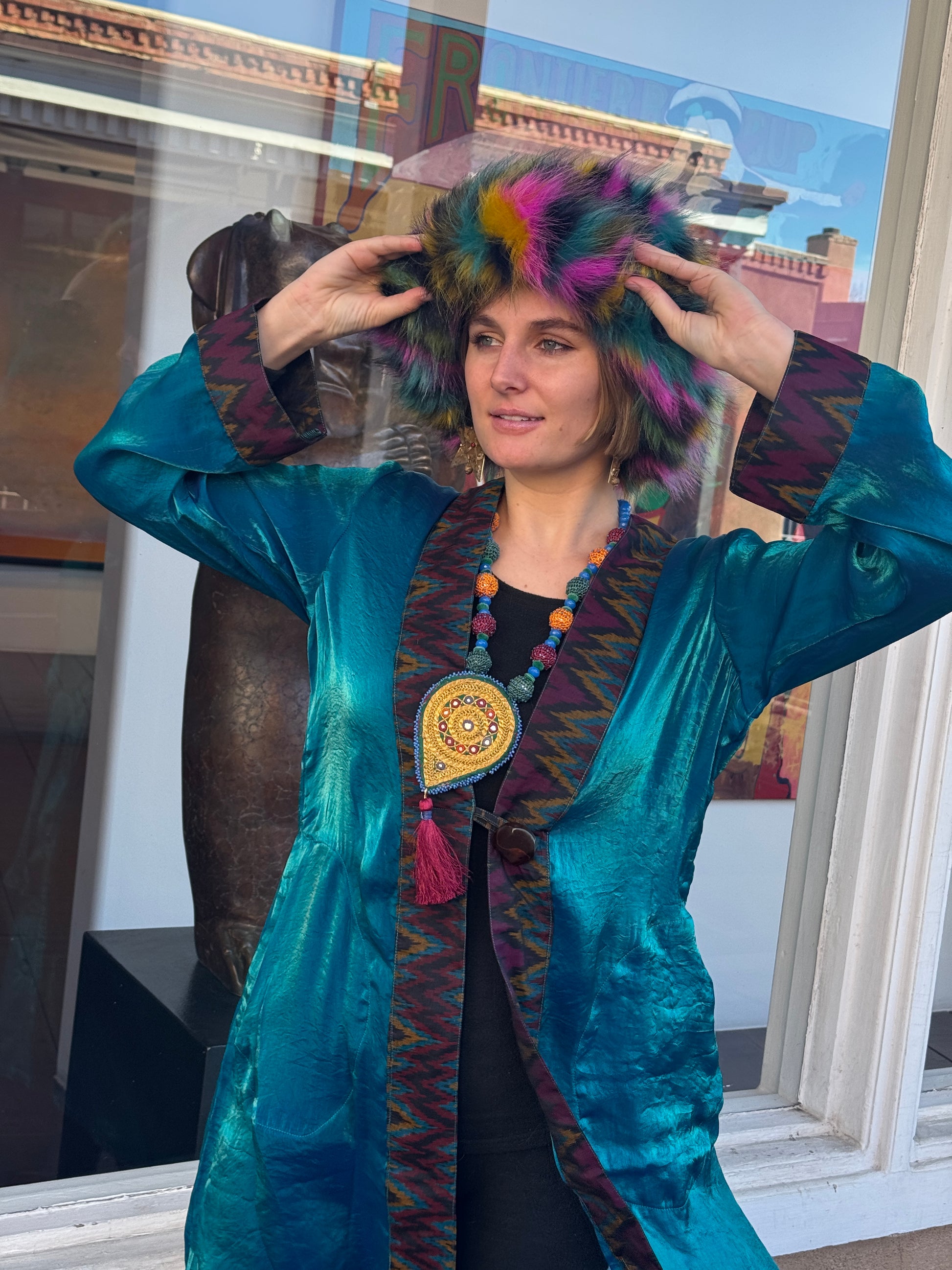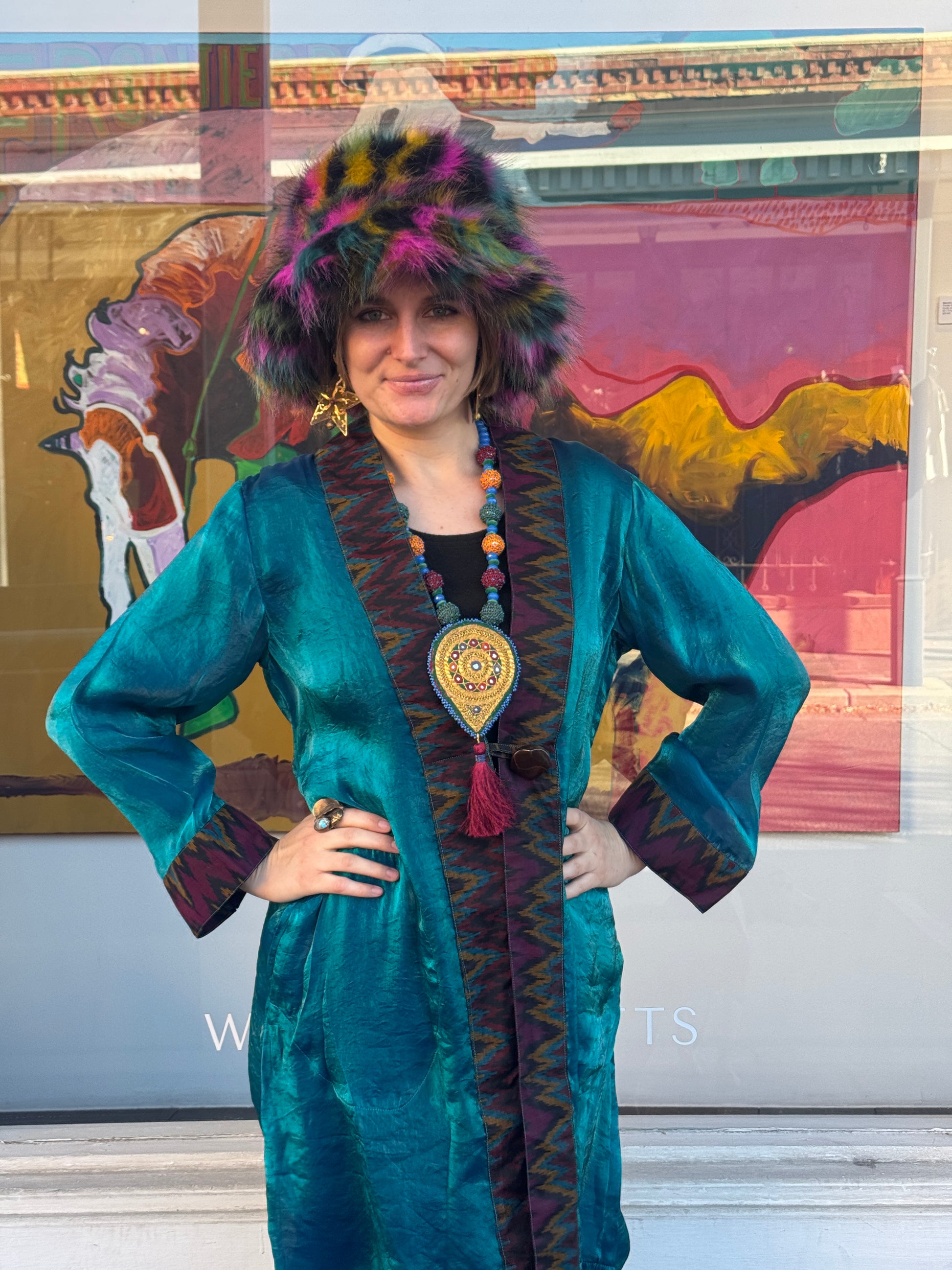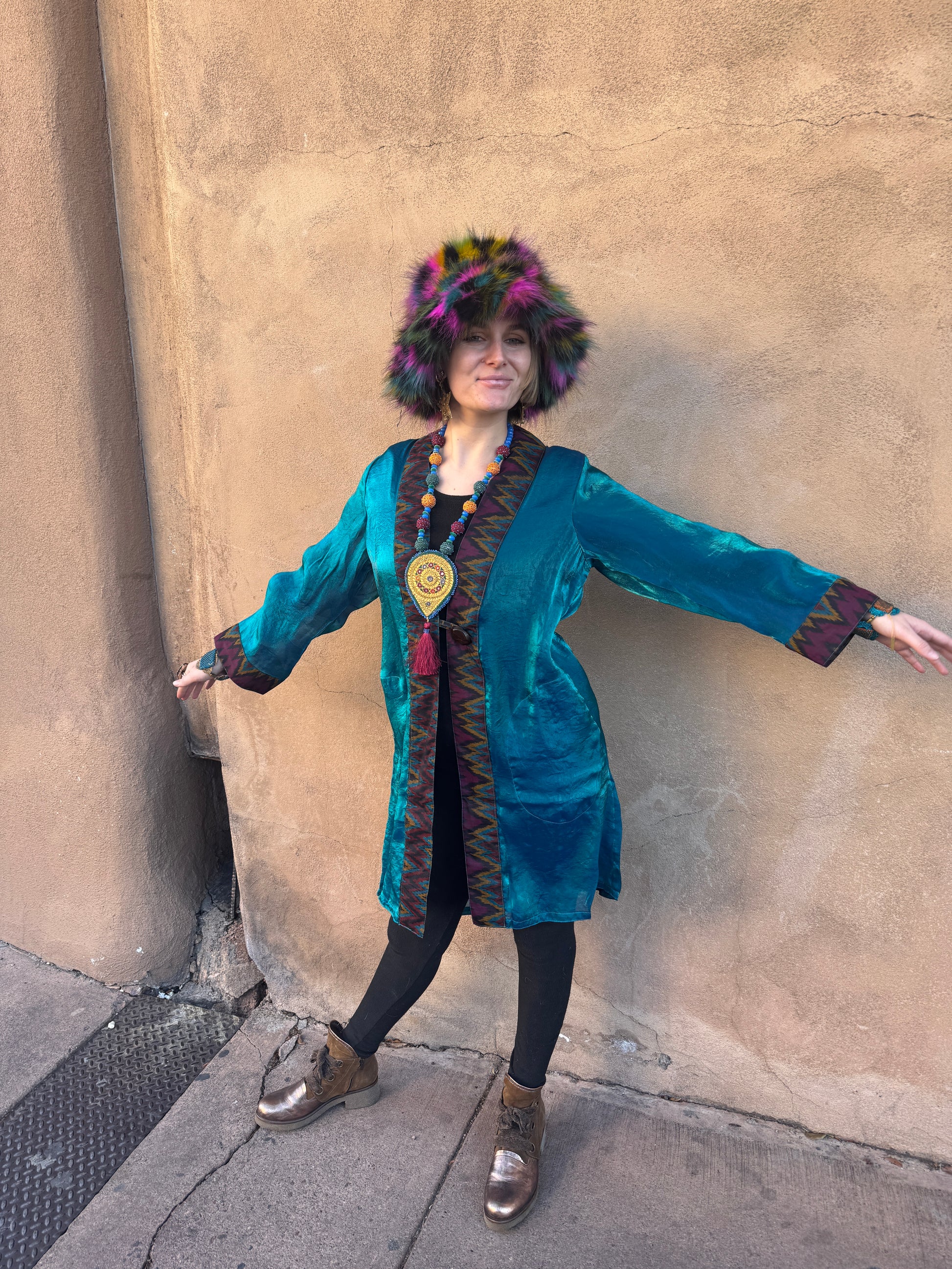 The trim is 100% silk ikat with colors that provide extra sophistication. Two roomy pockets and a chunky button adorn this beautiful piece as well. Many dynamic colors to choose from below.