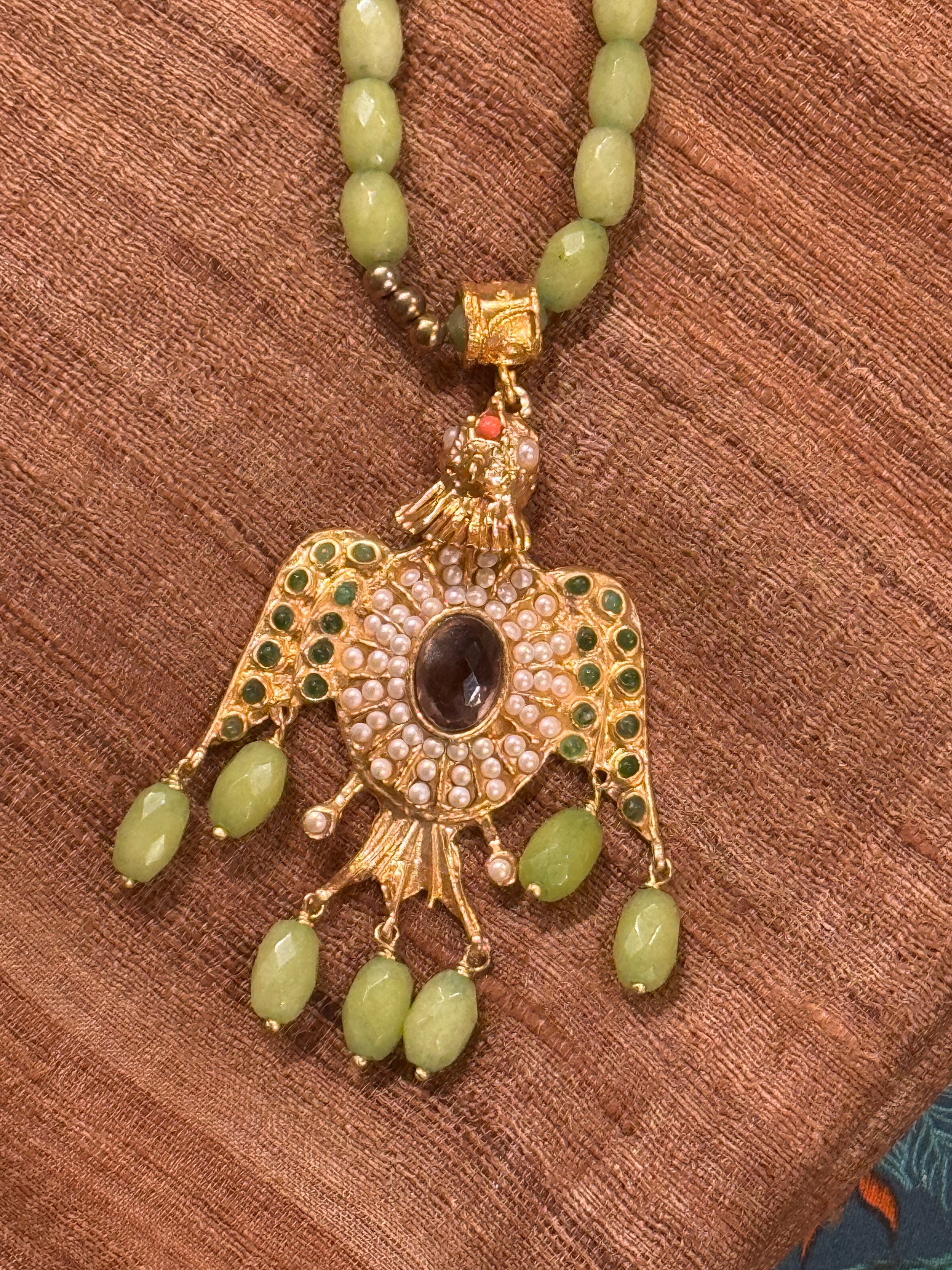 A powerful mythological motif symbolizing the cycle of life and rebirth. This phoenix rising pendant is gem-studded from its coral third eye to its dangling faceted green serpentine beads. Pearl eyes, and green onyx wings, faceted topaz crystal center surrounded by more pearls makes for a stunning phoenix rising from the ashes, indeed. The pendant measures 3” long. The head and body are bifurcated which gives this pendant movement. The serene green of the faceted serpentine beaded necklace is the perfect color for this peaceful piece.