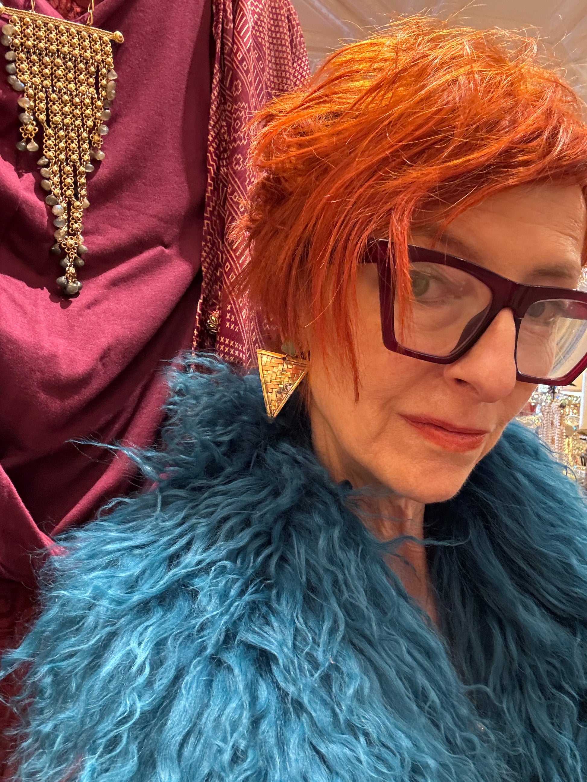 An intricate weave of copper, silver, and brass comprise these stunning mixed metal triangle shaped earrings. Lightweight, but substantial in their vibe. Square Turquoise cabochon post suspend the elaborately woven earrings.