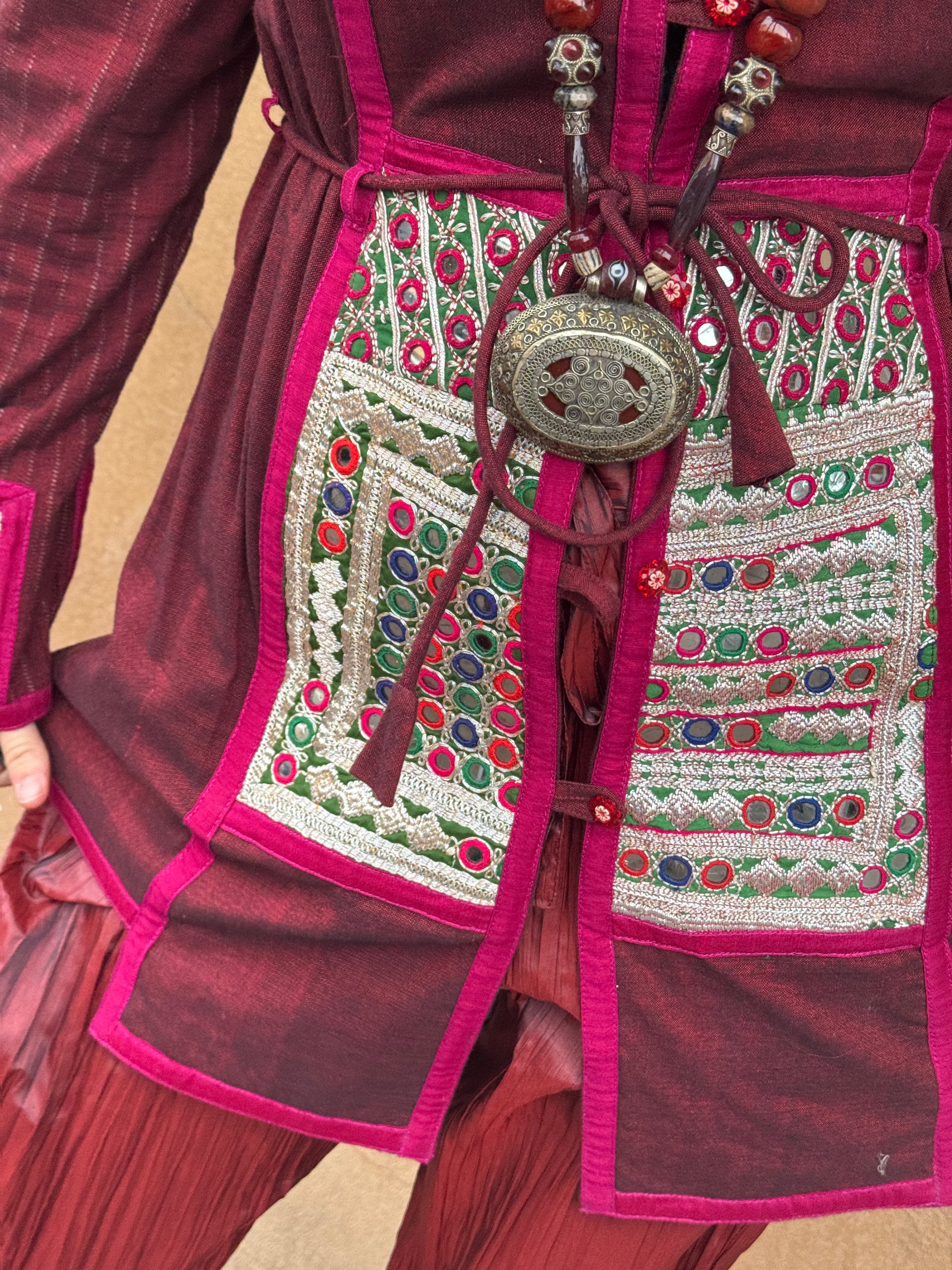 In this traditional textile you will find small, round mirrors that reflect the light in a stunning manner. Around them are a spring palette of carefully hand-stitched embroidery. It displays bright silver, magenta, fire red, and shammock green. The shapes consist of diamonds, circles, and rectangles. This same embroidery graces the cuffs, tying in the front panels with it. Pockets, flower buttons, magenta trim, and an adjustable tie around the waist are more thoughtful details that went into the making of this gorgeous jacket.