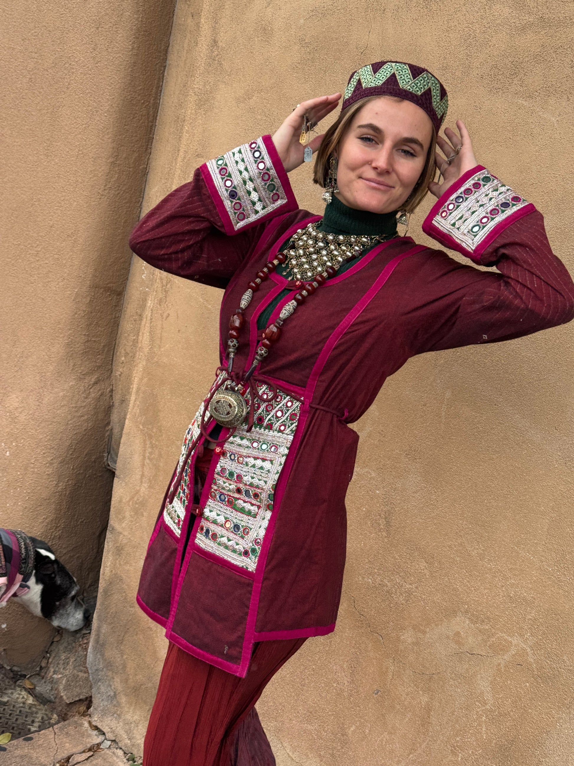 This vibrant, upcycled embroidered textile has been given a new life on this juicy, plum wine jacket! This small to medium sized layering piece is structured with taste and unique detailing. The deep red wine, hand-loomed cotton and silk textile is derived from the Swat region of Pakistan. If you look closely, you will see the tiny red and black weave that gives the color its depth. Soft, white stitches lightly adorn the sleeves and bottom half of the back.