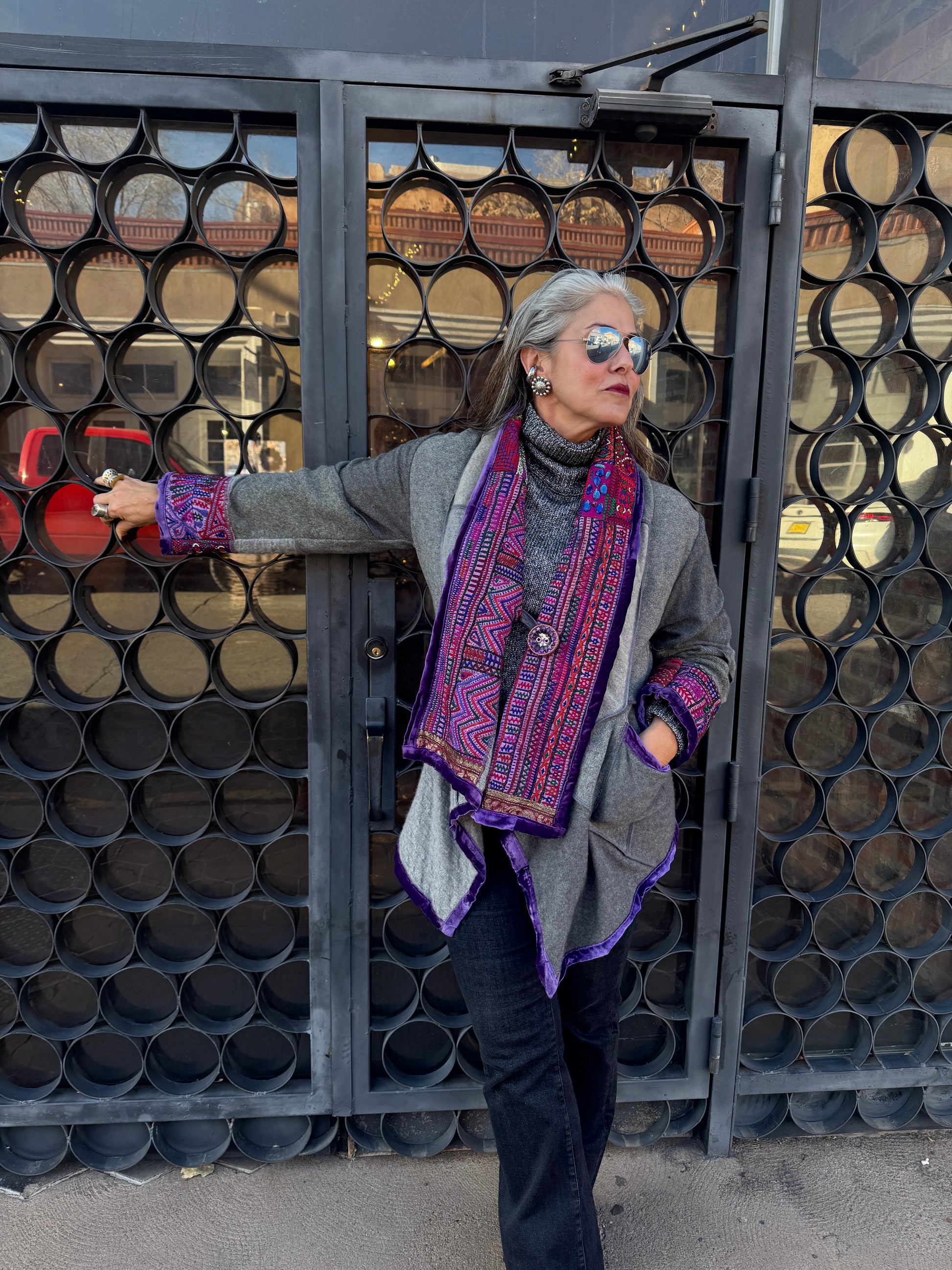 A collage of heathered soft cashmere greys makes up the cozy base of this Nana sweater. The diagonals and similar placement of cashmere swaths are a deliberate and artful part of the design. Upcycled cashmere from vintage sweater remnants paired with extraordinary Rabari hand-embroidered from the Swat Valley of India on the cuffs and lapel. Gorgeous plums, jeweled tones, purples with seed beads and crystals hand-embroidered onto the lapel for some fun bling. All of this beauty trimmed in soft purple cotton velvet. It’s a stunning combination of cozy wow! Two pockets, single button closure. Size Medium 42” chest. Great for the holiday season and beyond!