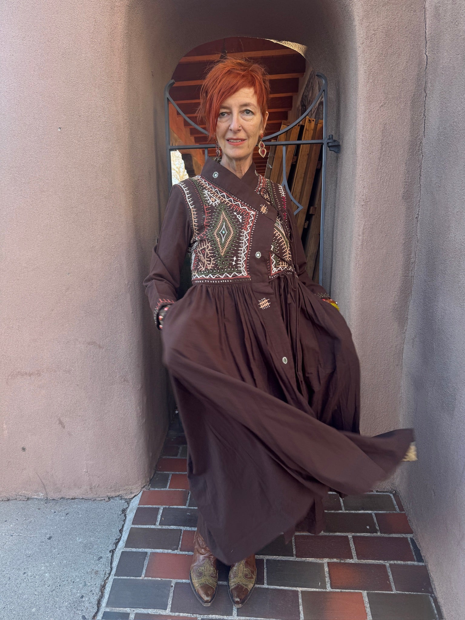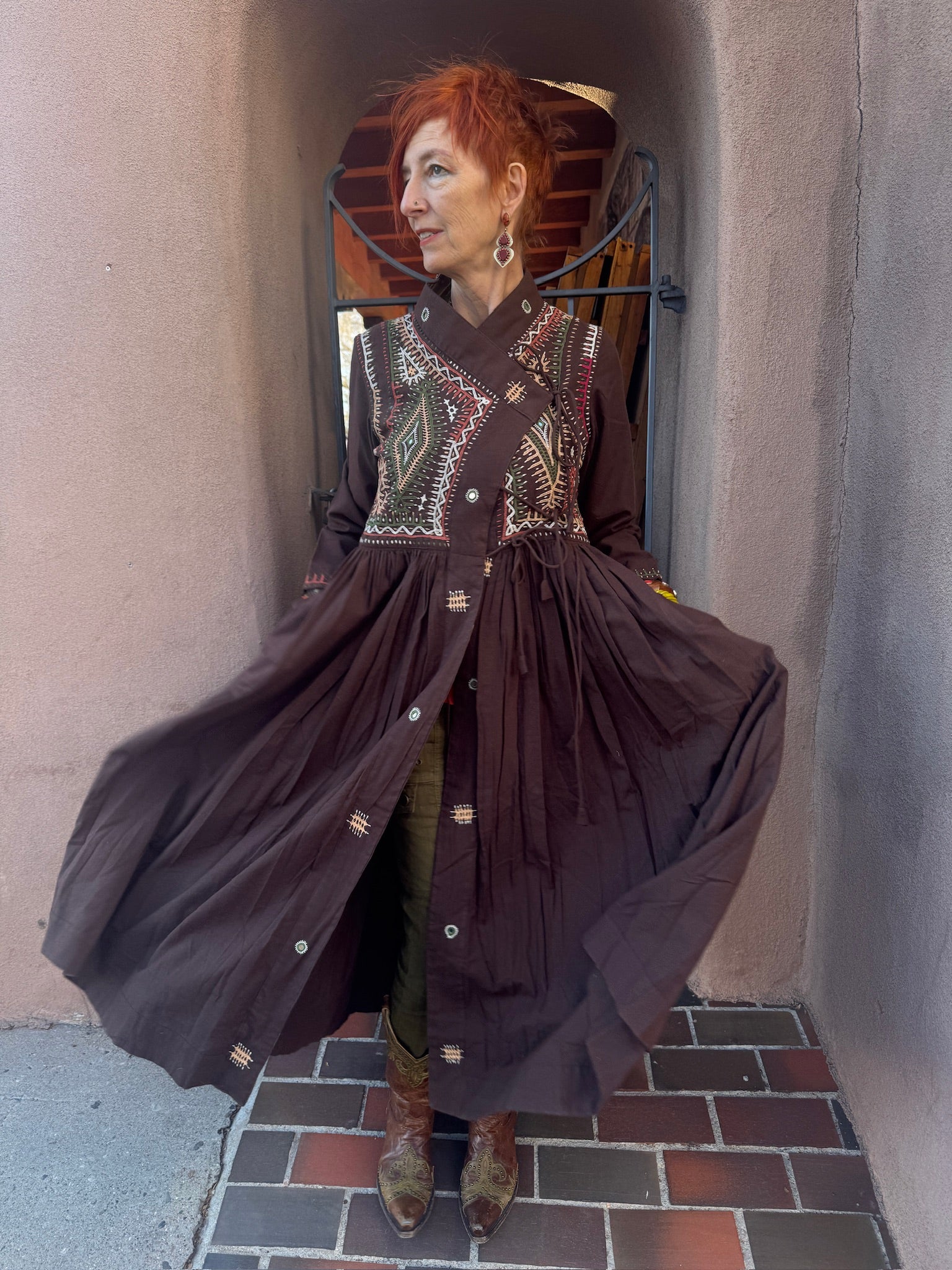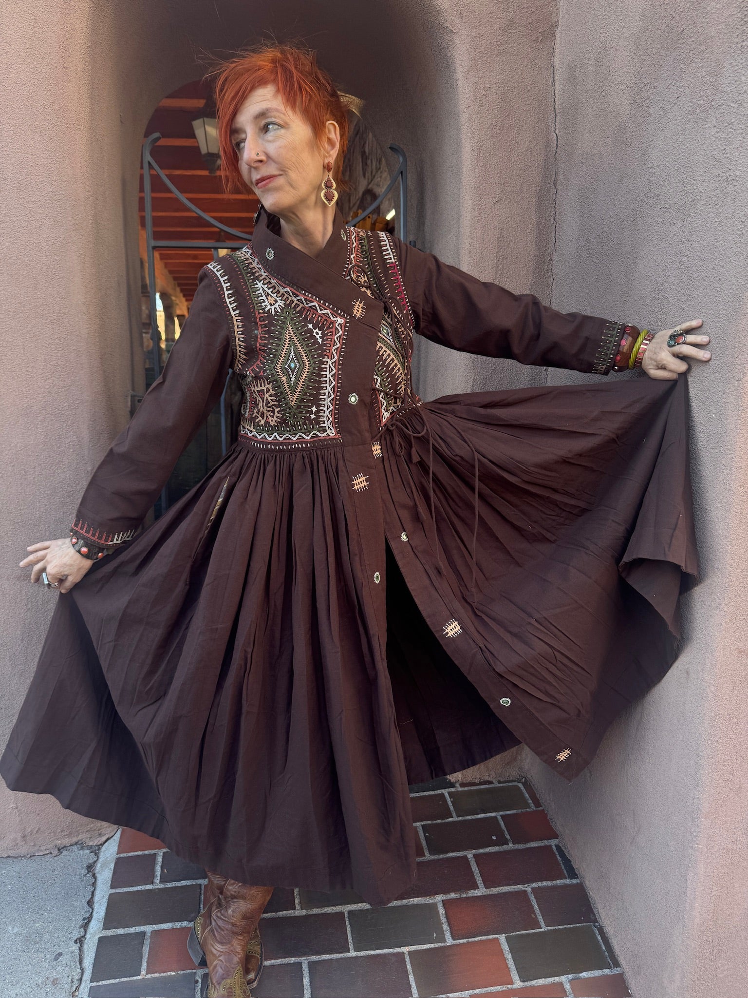 Exquisite Rabari hand-embroidered coat dress in a delicious dark mocha chocolate will have you flitting and flirting in full-swing! The hand-embroidery is dense and detailed in colorful tribal regalia. The terrestrial colors in adobe rust, biscuit, white, and evergreen pine pop in an earthy elegance. You’ll find beautiful and clean mirror work mixed in the lovely Rabari hand-embroidery. A fabulous plentiful pleated swath of cotton for the full skirt. There are many ways to wear this coat dress. There are multiple ties to allow for a buttoned up look that will accentuate the slight empire waist and will turn into a dress. Wear open for duster or a coat. If you wear open it will accommodate a size medium as shown on Norma. Two side vent pockets. Upper torso lined in a hand-block cotton print in coordinating colors. Size Small, 38” chest.