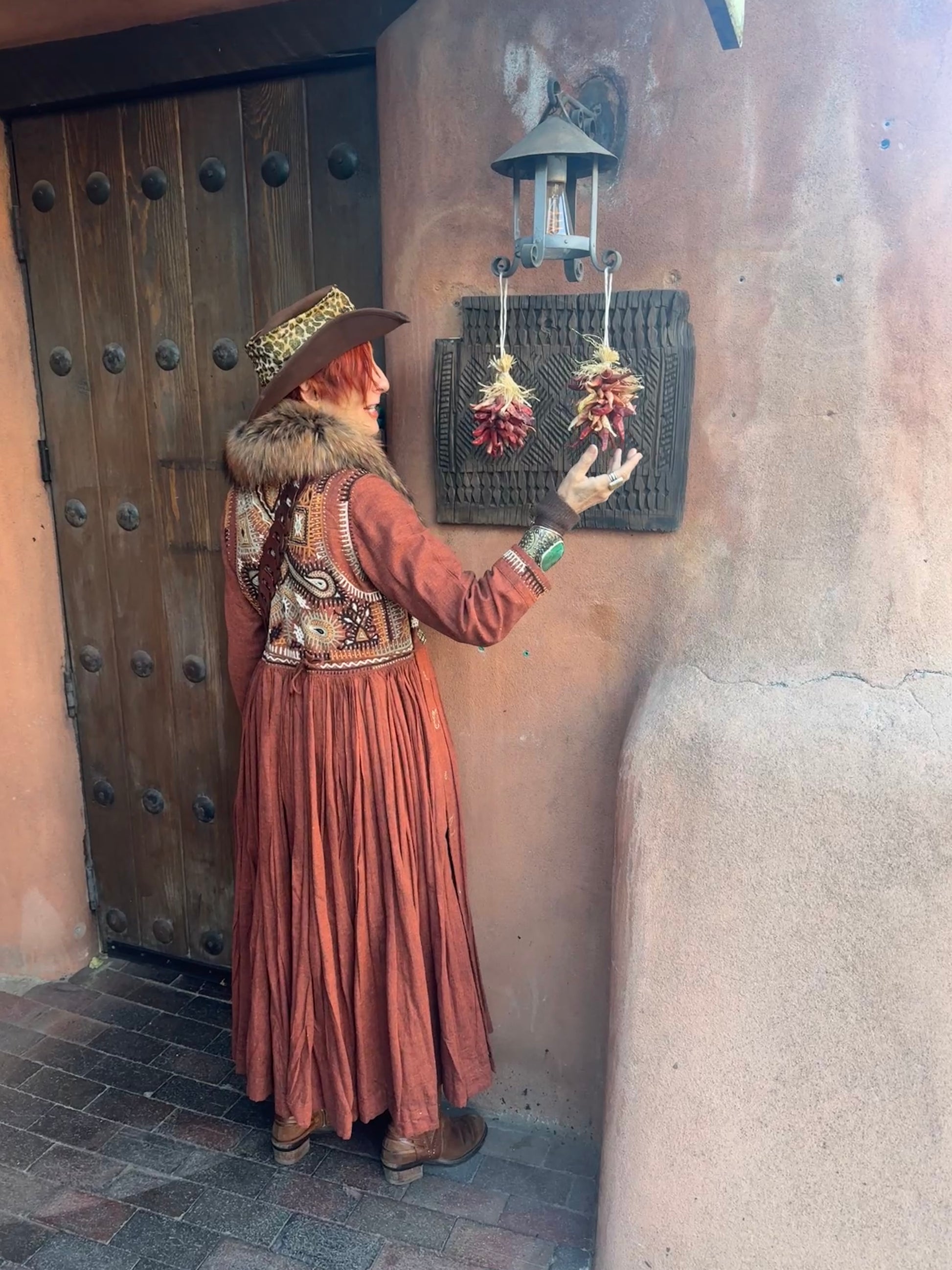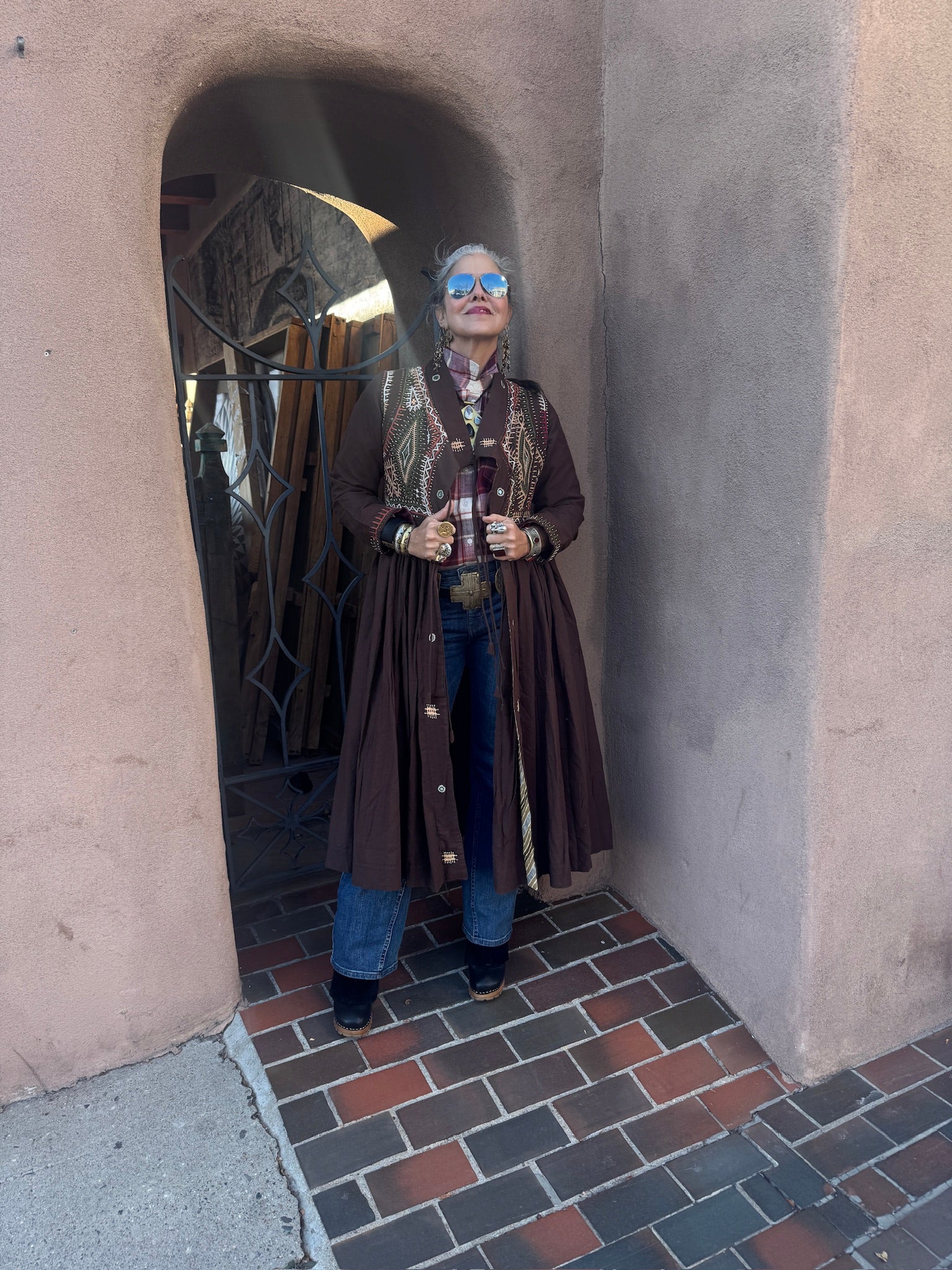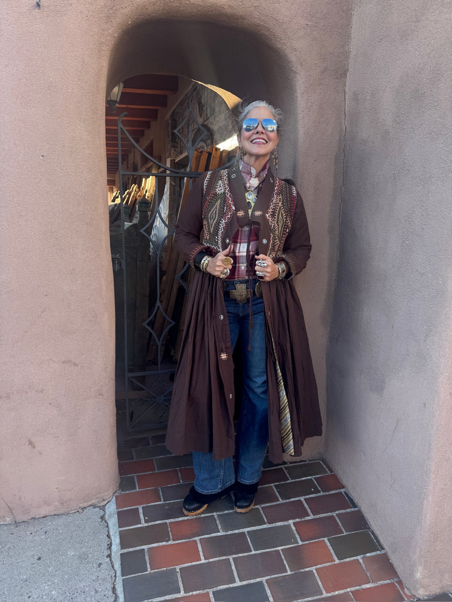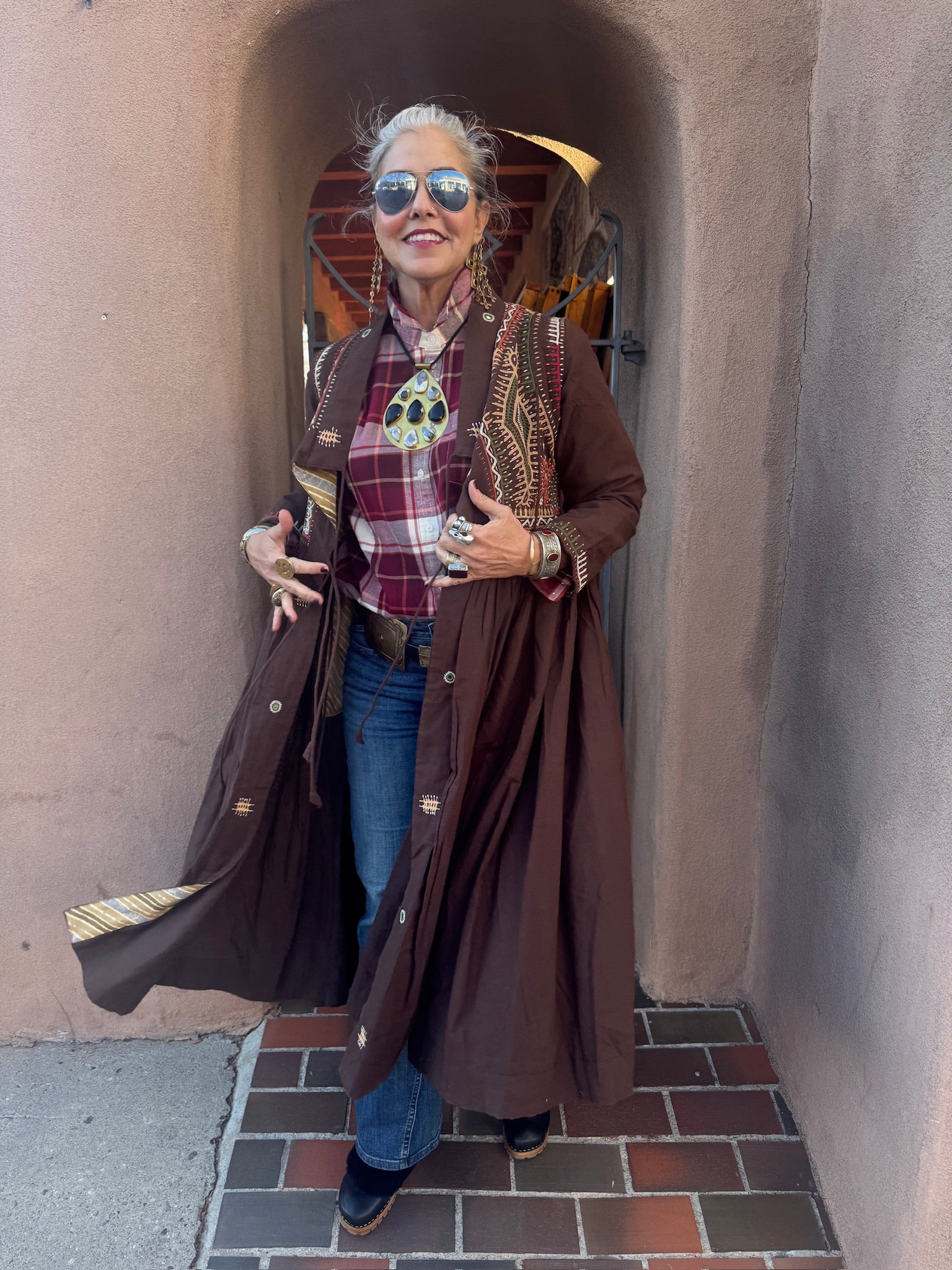 Exquisite Rabari hand-embroidered coat dress in a delicious dark mocha chocolate will have you flitting and flirting in full-swing! The hand-embroidery is dense and detailed in colorful tribal regalia. The terrestrial colors in adobe rust, biscuit, white, and evergreen pine pop in an earthy elegance. You’ll find beautiful and clean mirror work mixed in the lovely Rabari hand-embroidery. A fabulous plentiful pleated swath of cotton for the full skirt. There are many ways to wear this coat dress. There are multiple ties to allow for a buttoned up look that will accentuate the slight empire waist and will turn into a dress. Wear open for duster or a coat. If you wear open it will accommodate a size medium as shown on Norma. Two side vent pockets. Upper torso lined in a hand-block cotton print in coordinating colors. Size Small, 38” chest.