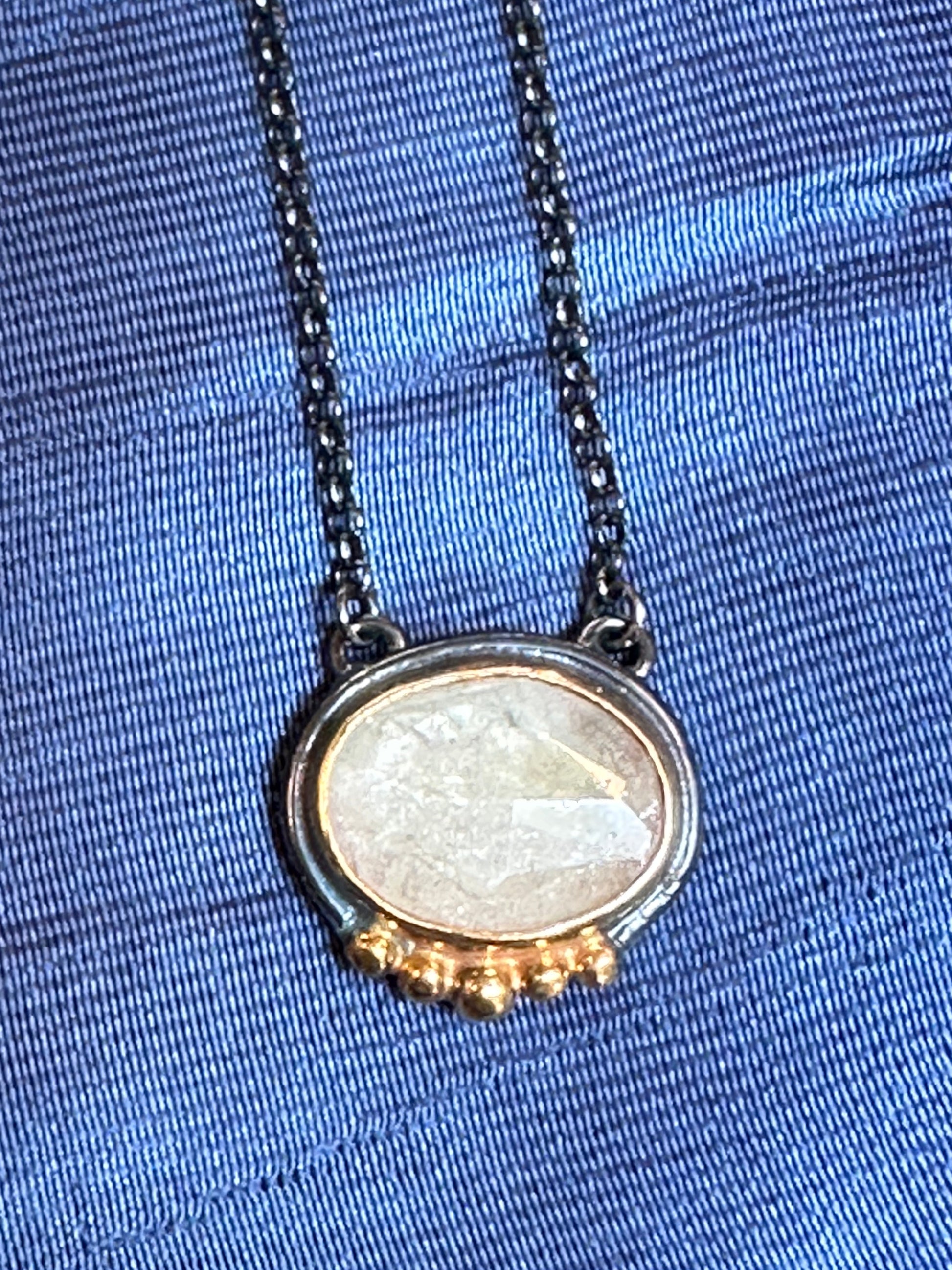 Special faceted stones on these unique necklaces - all various shapes of quartz. They are oxidized sterling silver, rhodium or 24K gold plated. Each one a good luck charm, the delicate nature of the necklace design disguises the powerful energy. Quartz encourages the wearer to look deep inside for personal and spiritual growth.