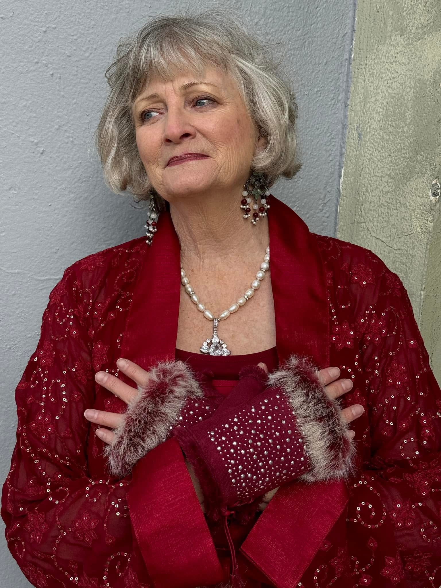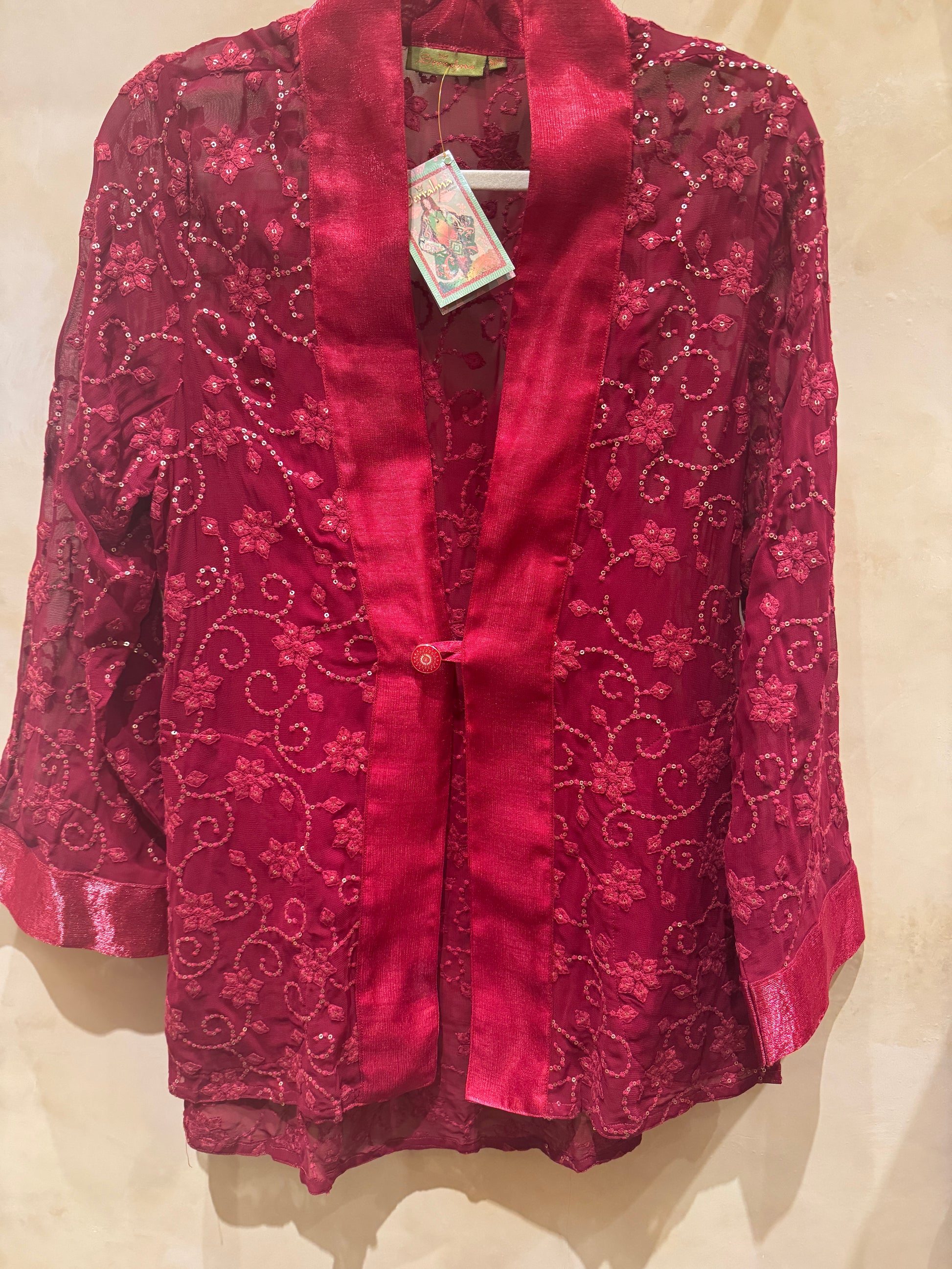 Lots to smile about here! Sparkle in the sun or the candlelight. No matter where you go in this rich red colorful swing jacket, you will be noticed. The rich vine and floral embroidery georgette is sprinkled with small metallic sequins The collar band and cuffs are a shiny textured red synsilk. Our classic coat has a below the hip length curved hemline, side pockets and single button closure. The waist has a slight shape, which gives a soft definition to your silhouette. Lightweight, great year round. Size S/M with a 42” chest.