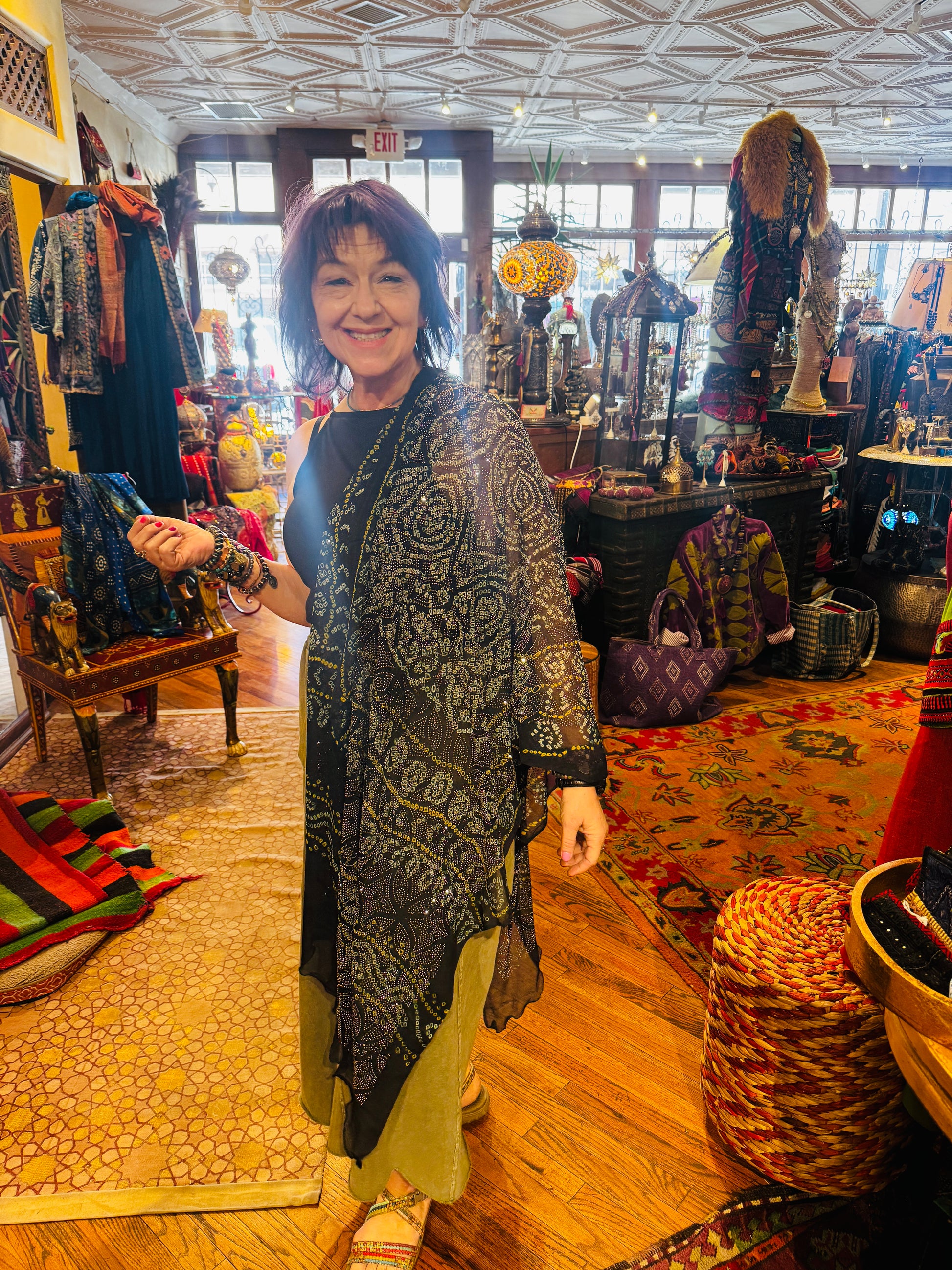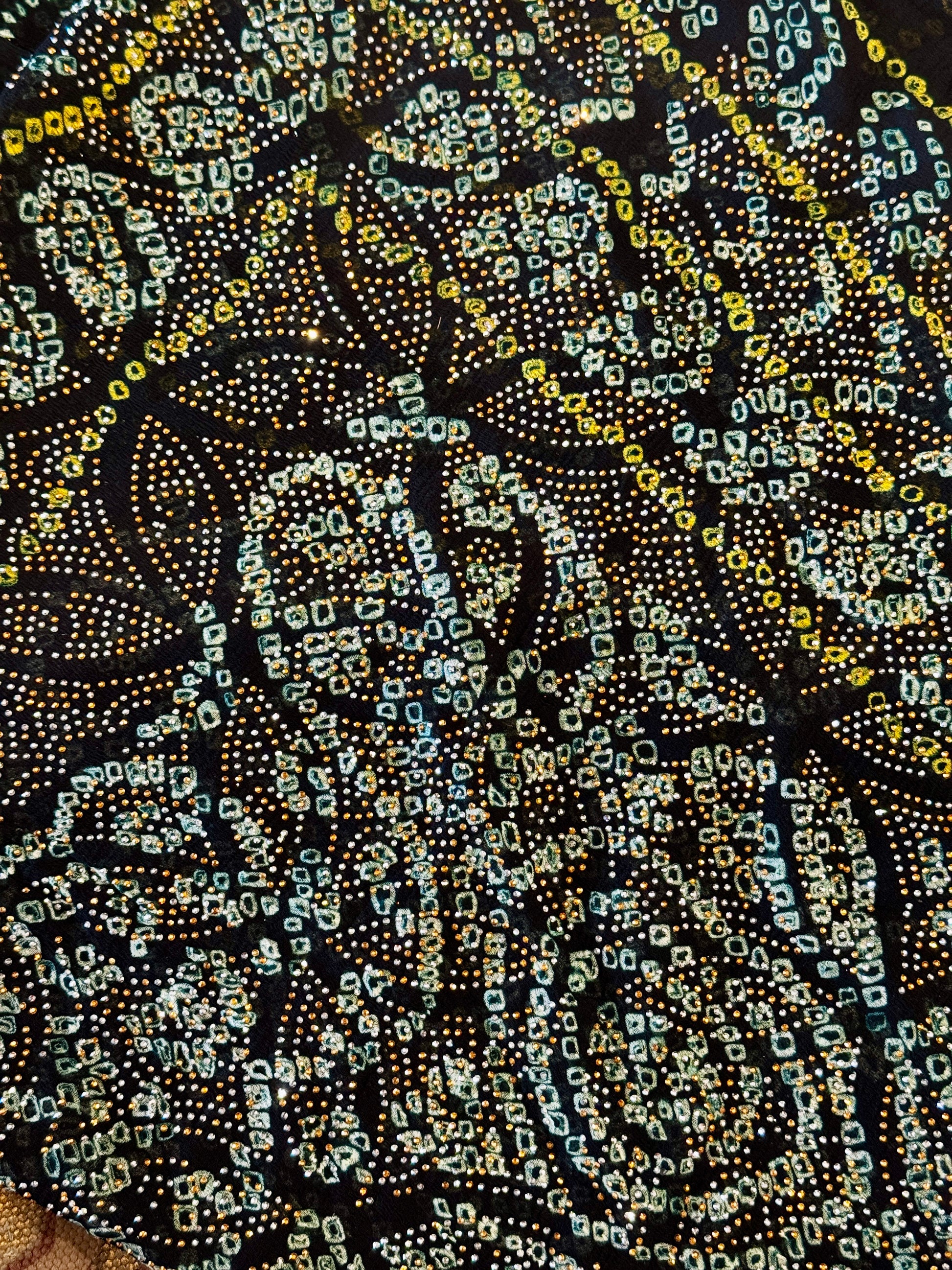 This fabulous razzle dazzle silk bling shawl will light up your life like a star studded sky. Soft artisan hand tied and dyed silk georgette makes a great base for the thousands of tiny sparkles press patterned onto the fabric. Wear it as a shawl or as a neck scarf. Each one of a kind.