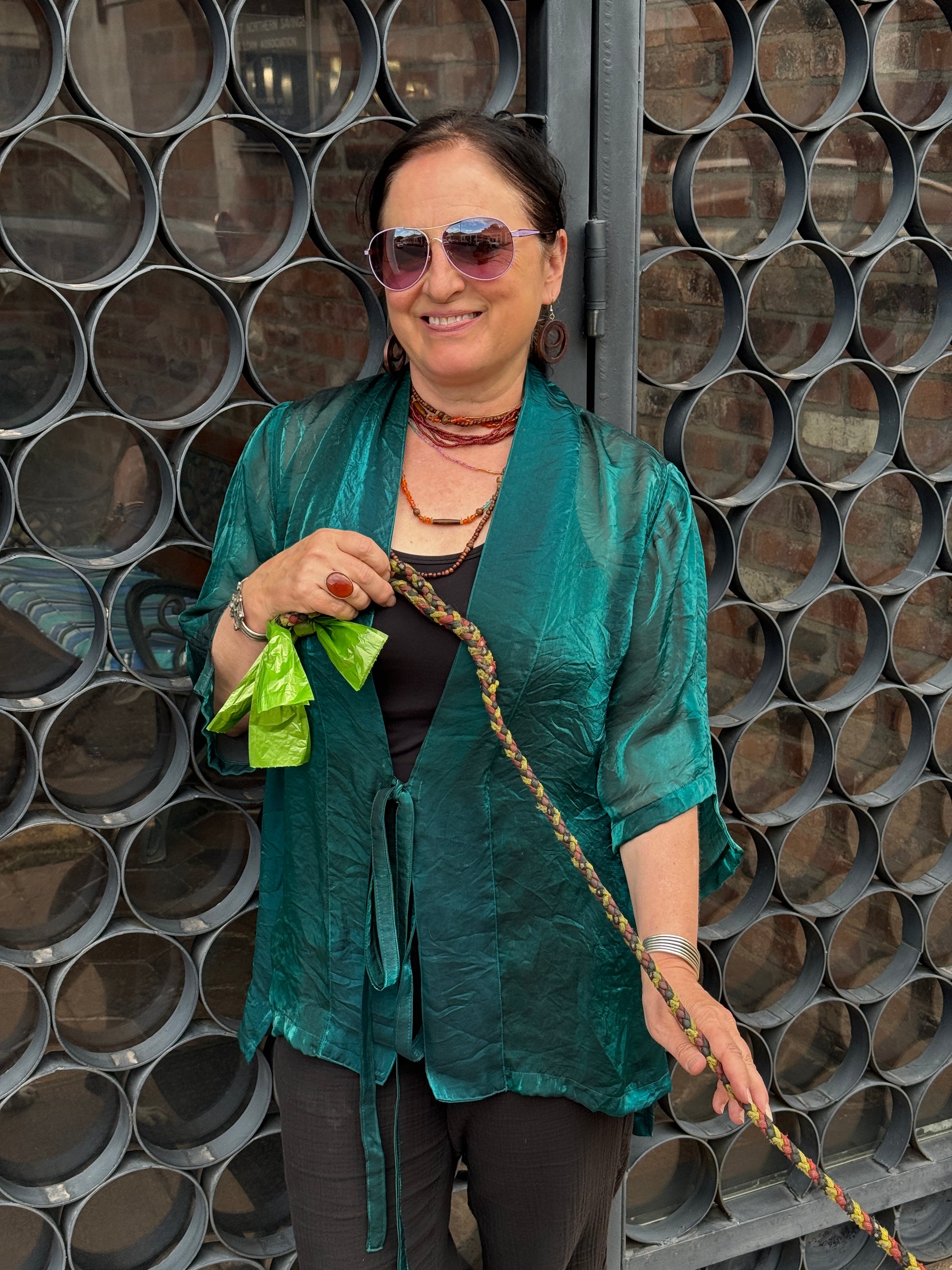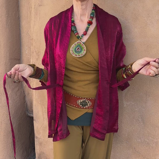 Dynamic, lightweight shimmer tie kimonos in a fabulous synsilk that will take you from season to season. This versatile kimono can be worn in a myriad of ways. Tied up, tied back, and tied over! Whichever way you wish! Watch the video to see all the ways to wear this great garment. The reverse side of the fabric has a slight matte finish. Wear it inside out to get a 2-tone effect. Choose from a rainbow of color choices. Two sizes to choose: S/M or M/L. Long tie closures.