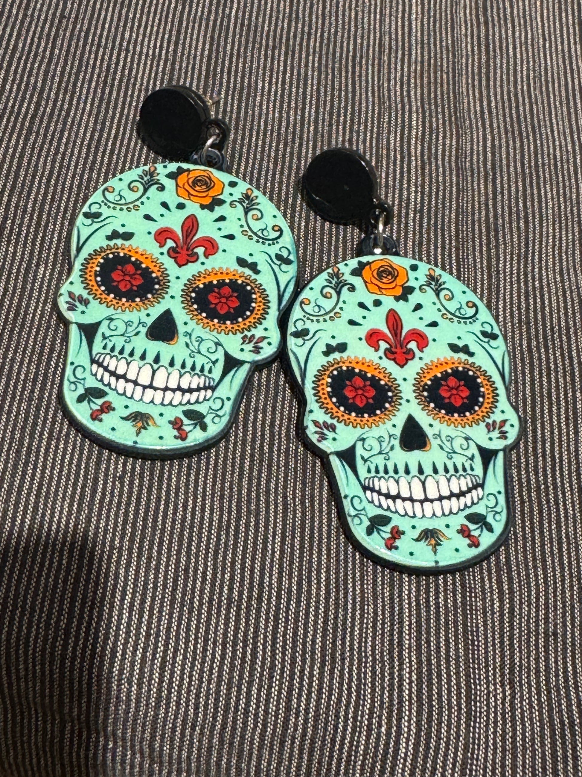 Skull resin earrings, colorful turquoise with real gemstone stud tops. Choose your colorful skull with either Turquoise, carnelian, onyx, or tigers eye stud tops.. Celebrate the Day of the Dead with these festive earrings! $48