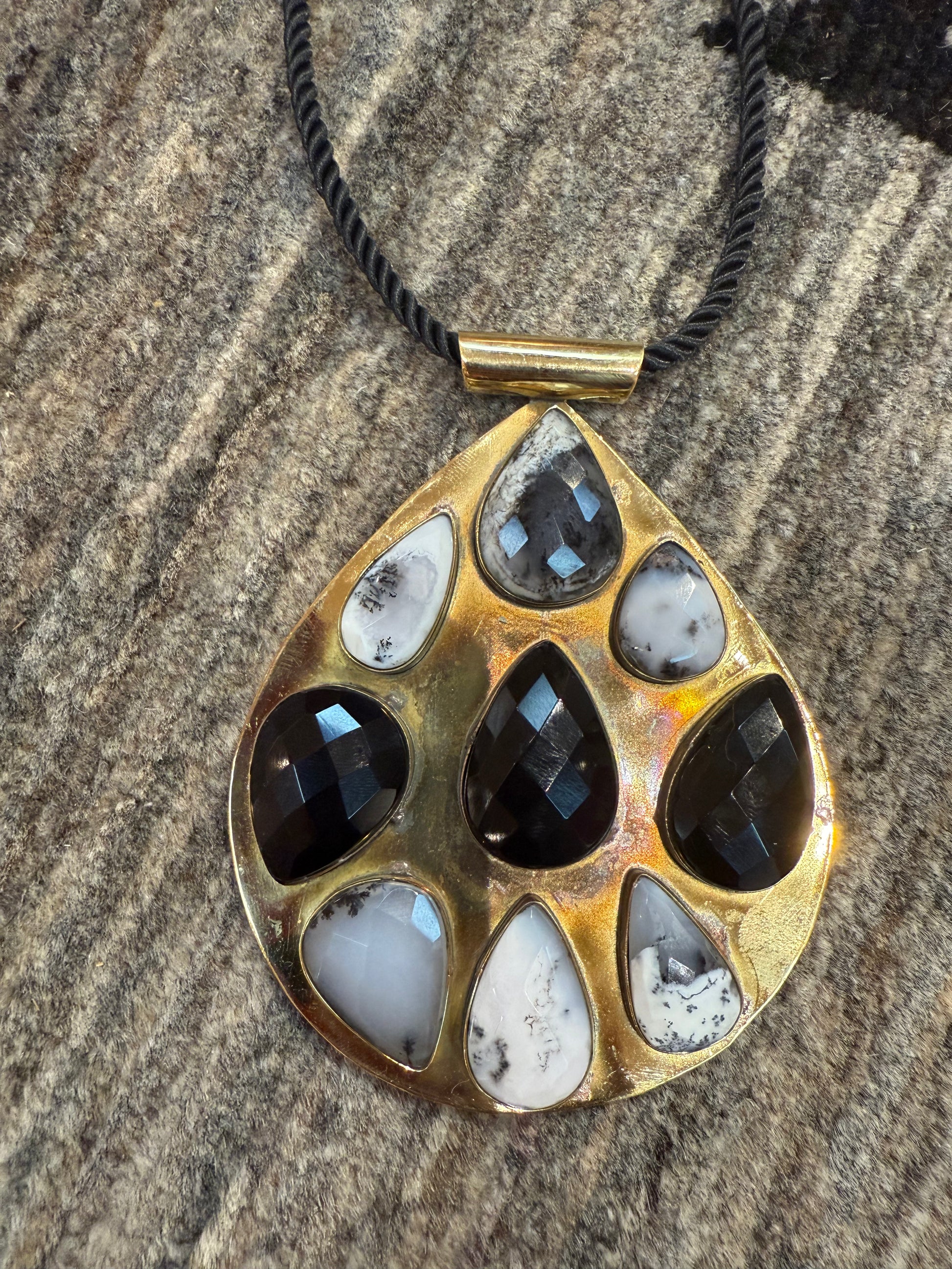 Gorgeous teardrop pendants with fabulous faceted gemstones galore. Choose from onyx & opal; moonstone & chalcedony; labradorite & carnelian. The significant gemstones mirror the beautiful teardrop shape of the pendant. Brass pendant and bezel. The gemstones have an open bezel on the back so the metaphysical goodness of the stones reaches your skin. The pendant measures 4"L x 3" W. Easy to switch from cord to necklace of your choice. Lightweight for such a huge statement!