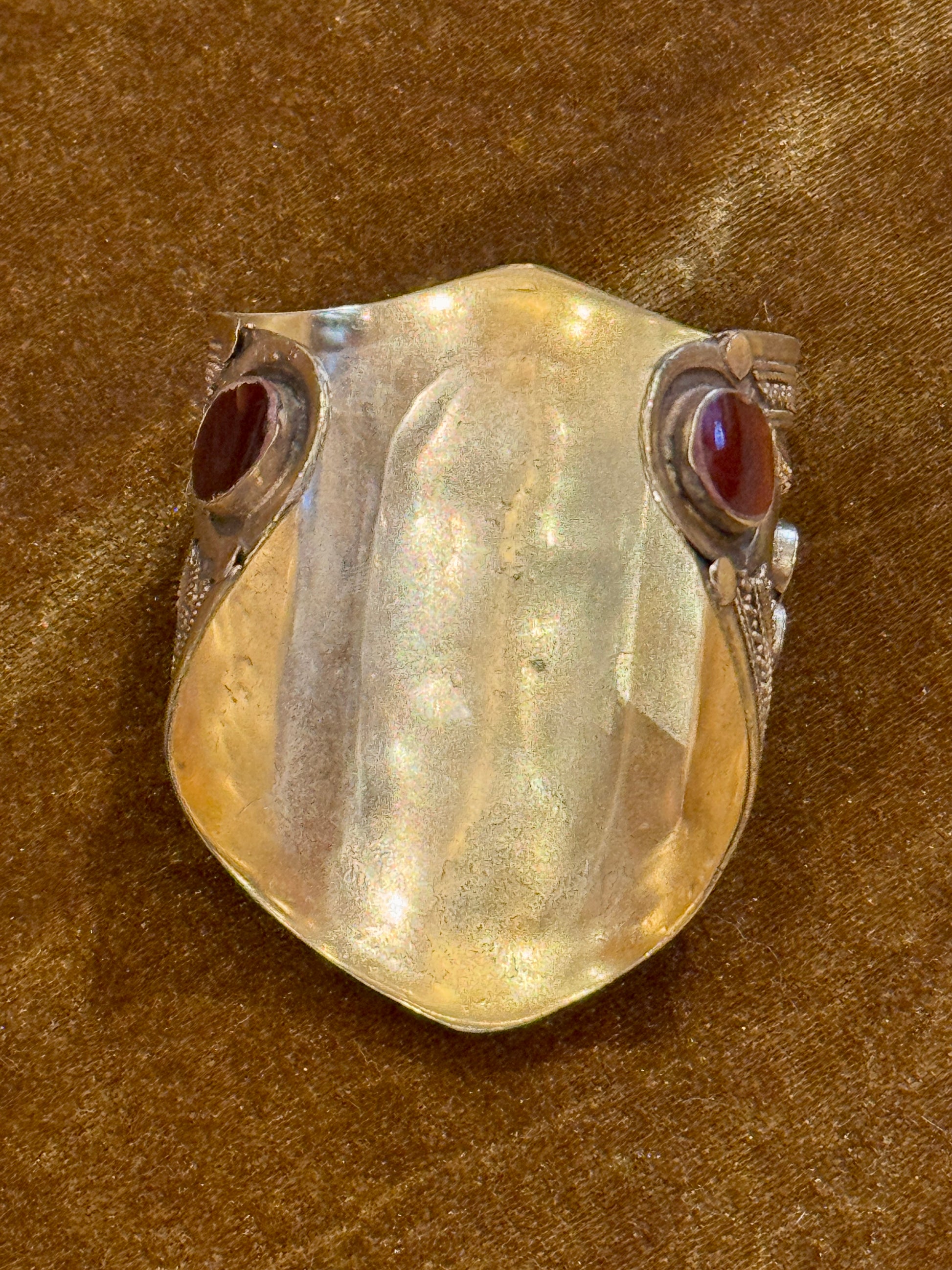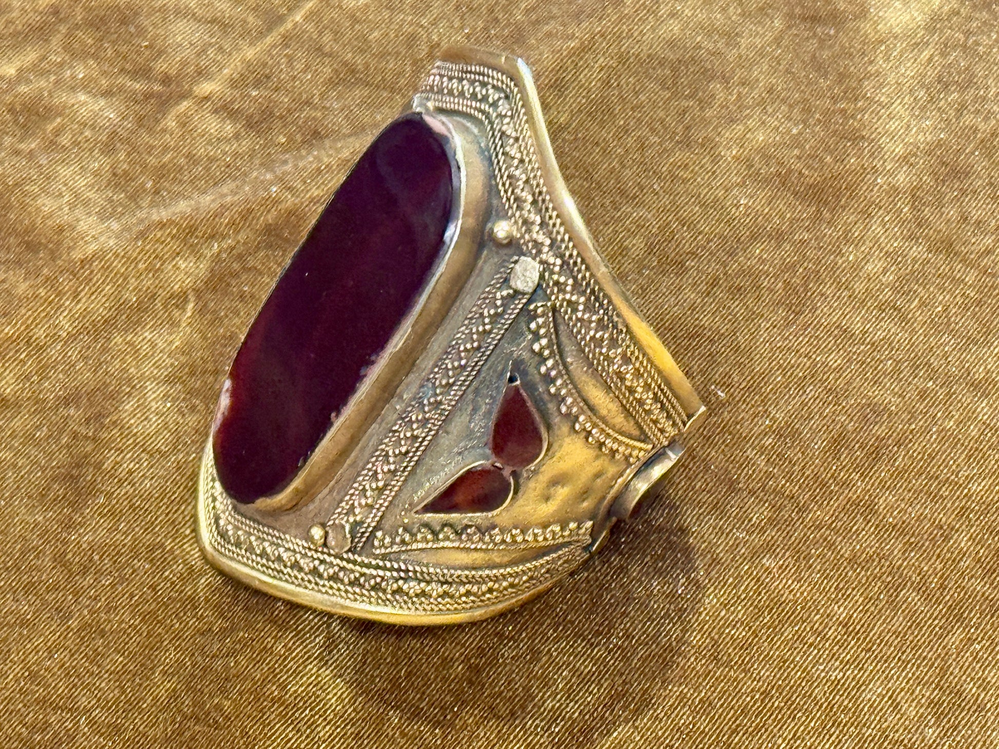 24kt gold plated white bronze vintage cuff, fit for a queen! This style harkens from the worlds where the Sultans once ruled and their jewels reflect the stones of the region. This rich deep carnelian agate is rare in its shade, and contrasts well against the gold finish. Fits a medium to large sized wrist. OOAK